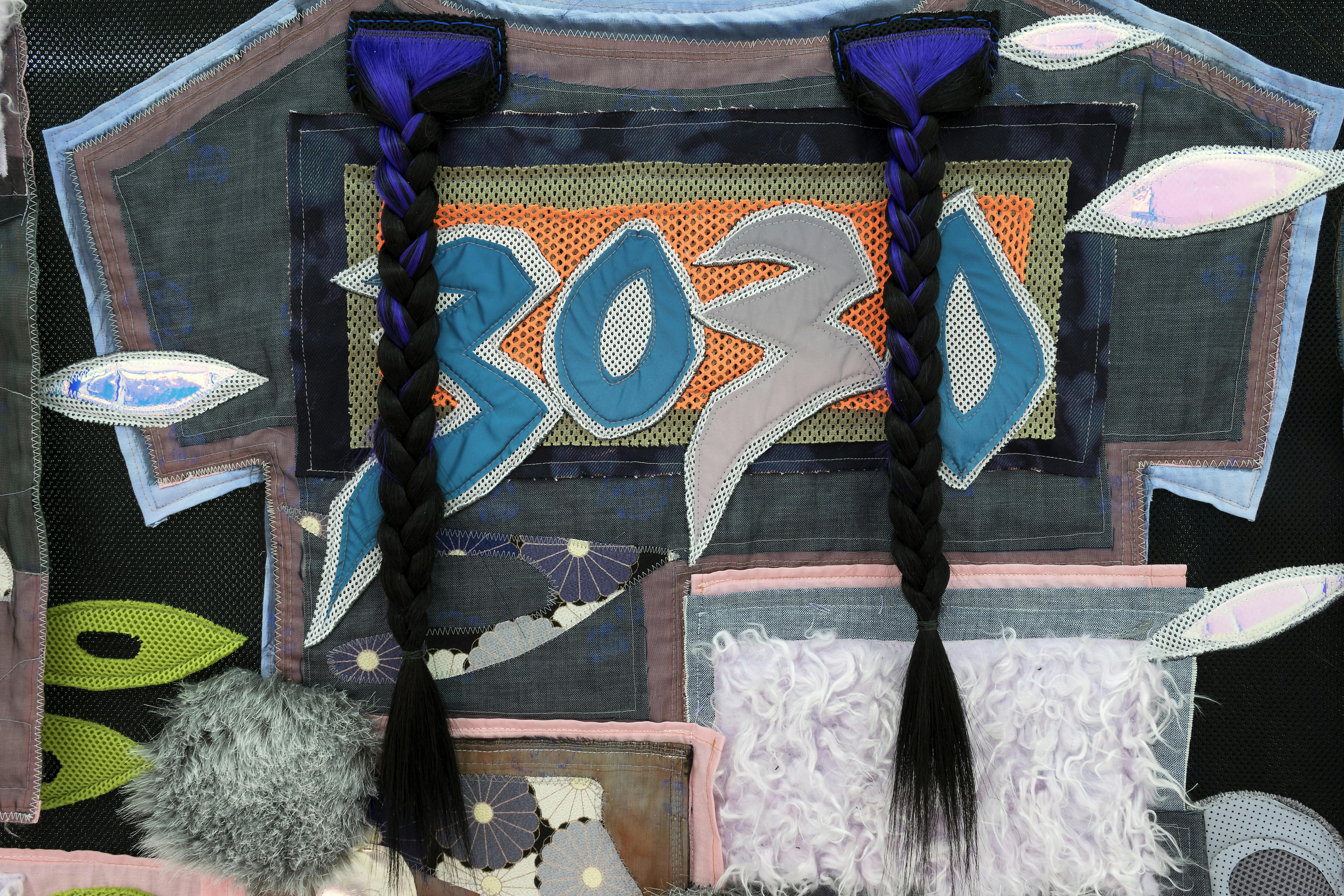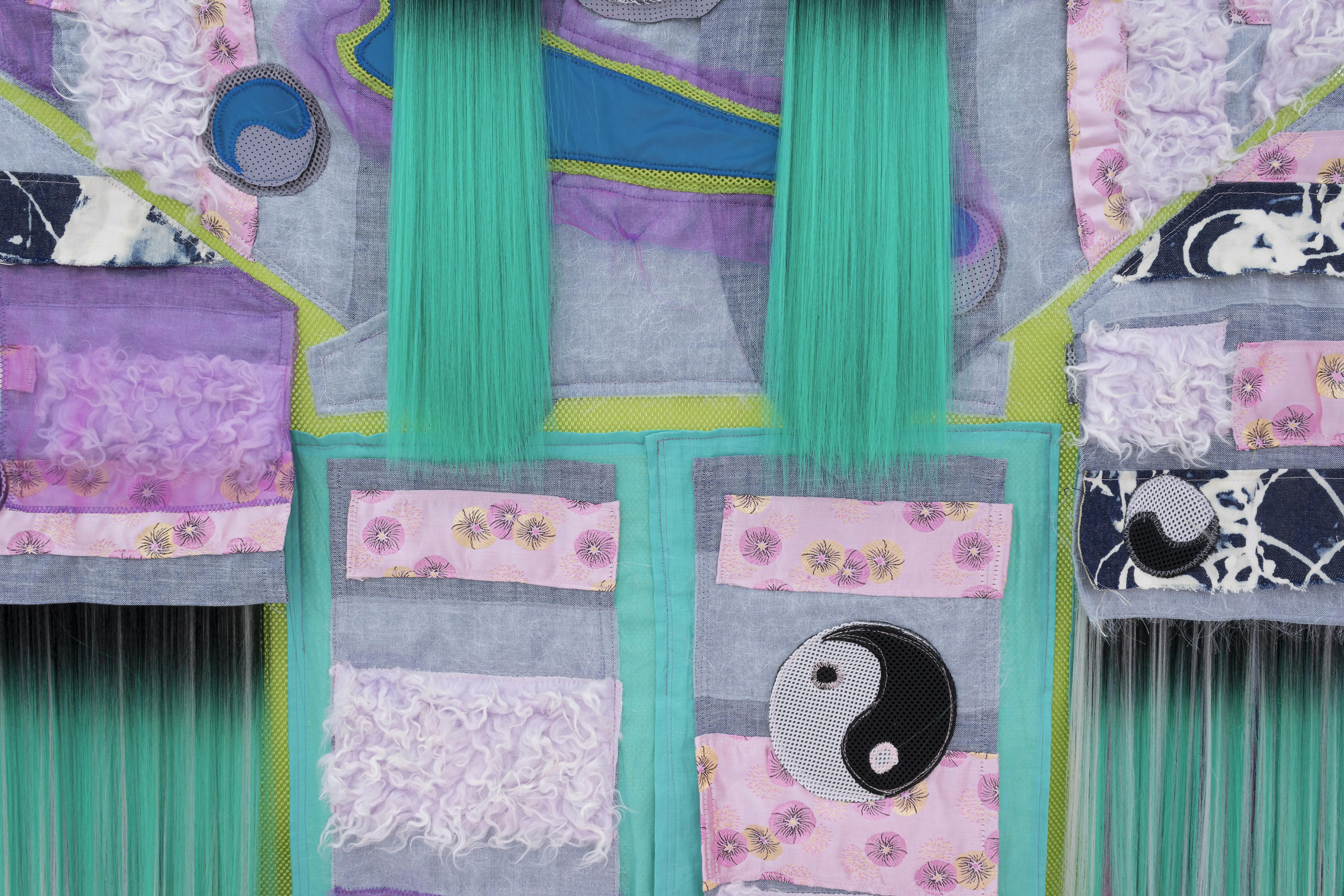 Bio Enhanced/Hiero Advanced: The Genius of Gene Jupiter (detail), 2018, hand sewn and machine stitched assorted fabrics and synthetic hair on bamboo, 166 x 170 cm
