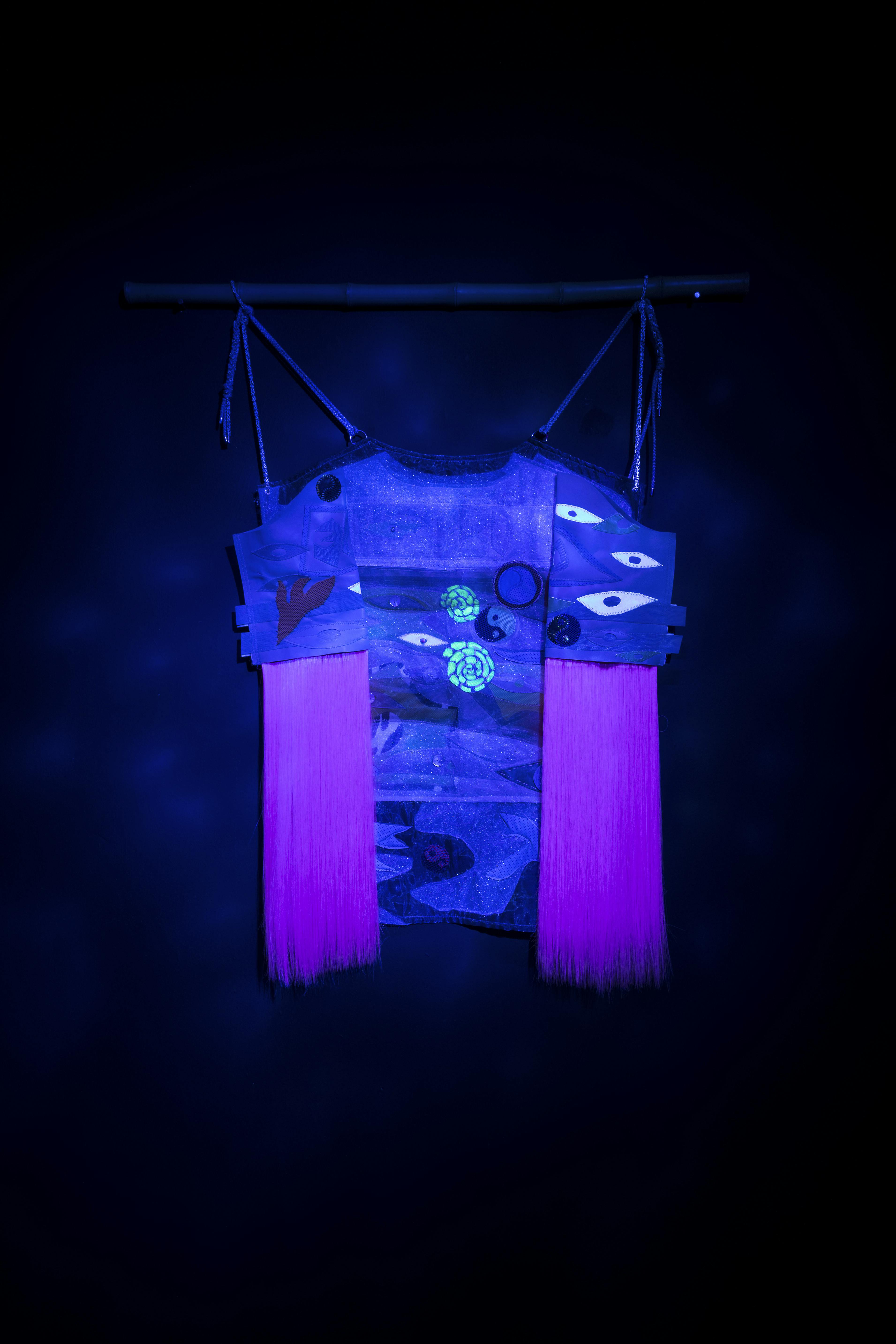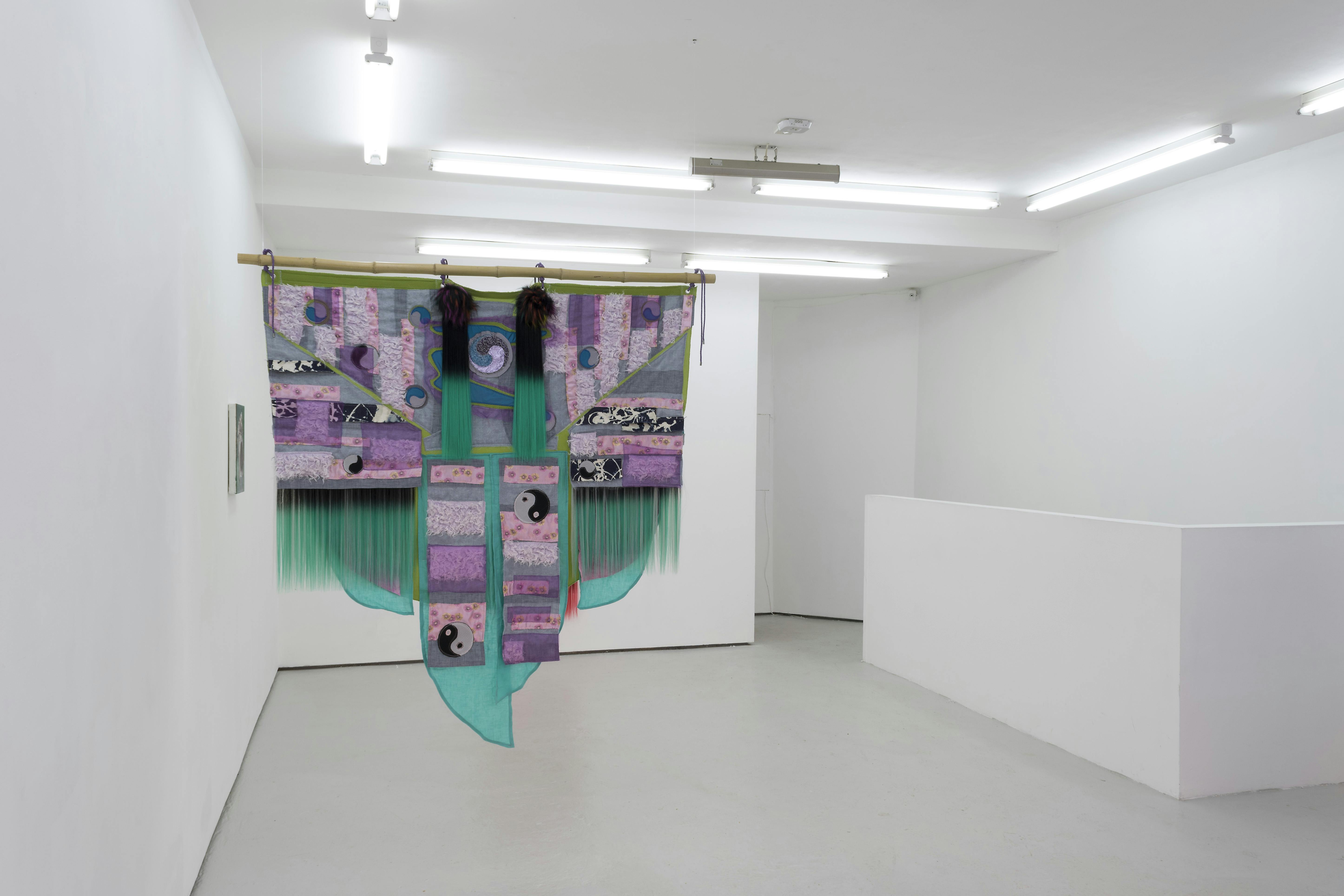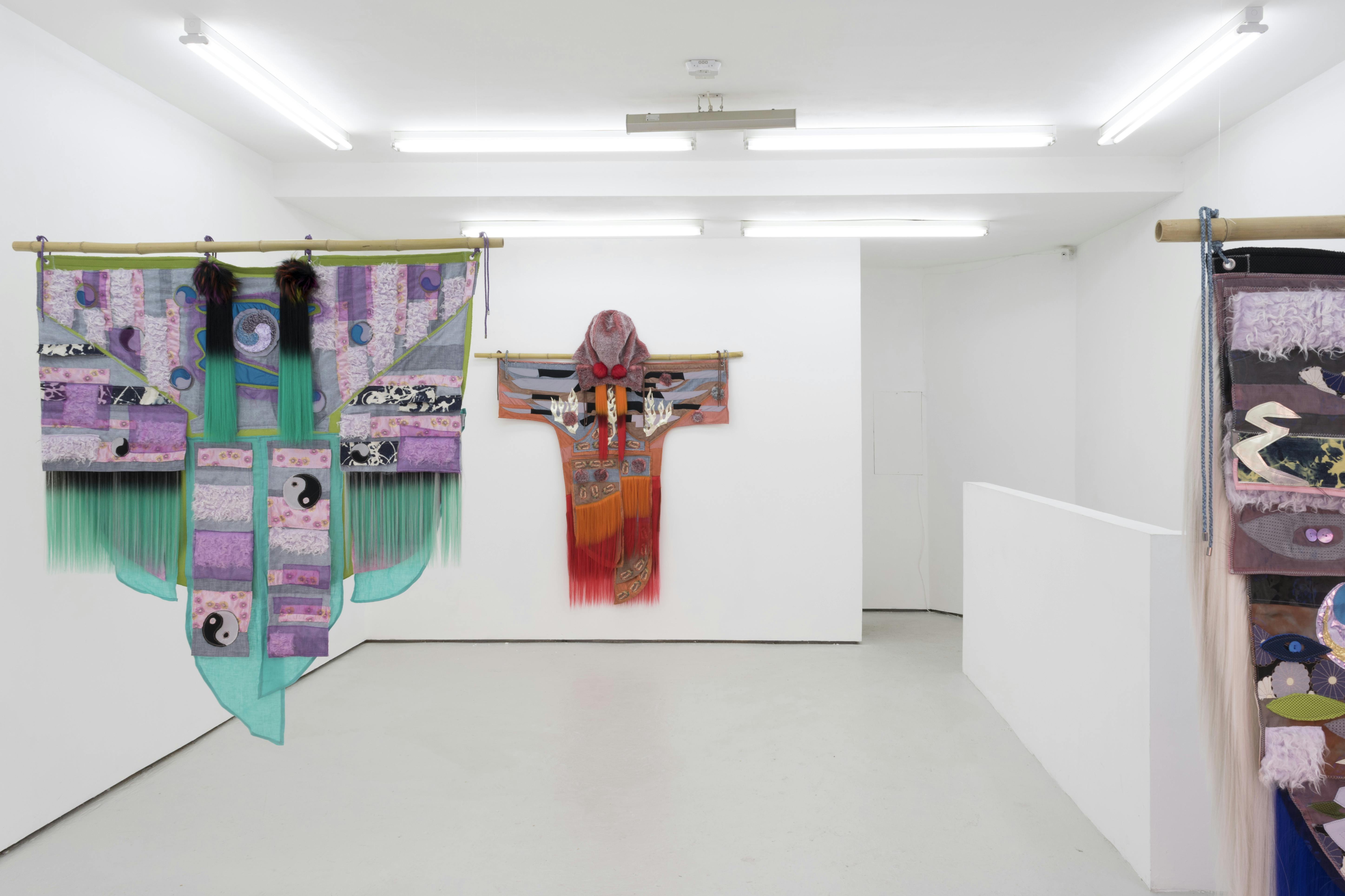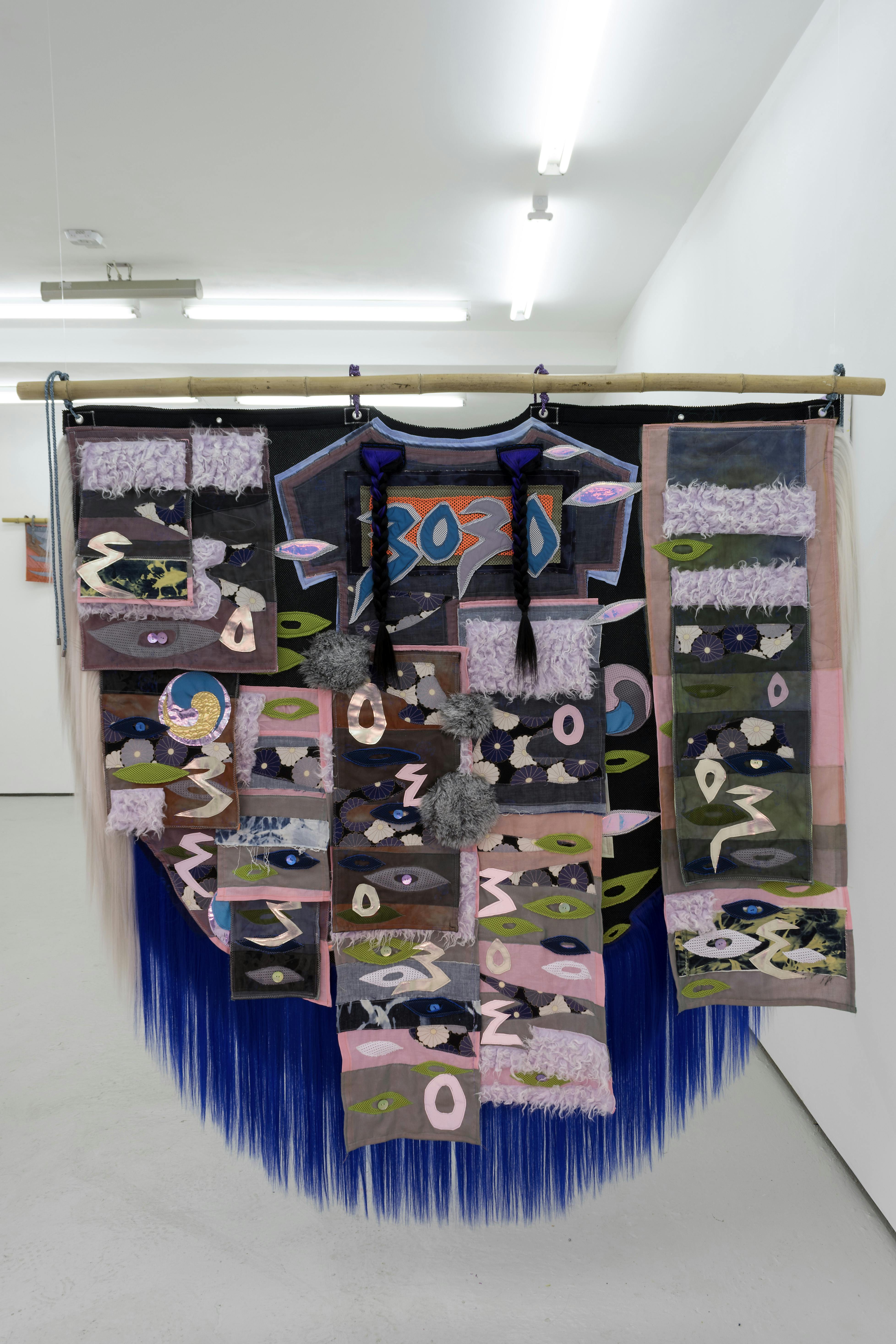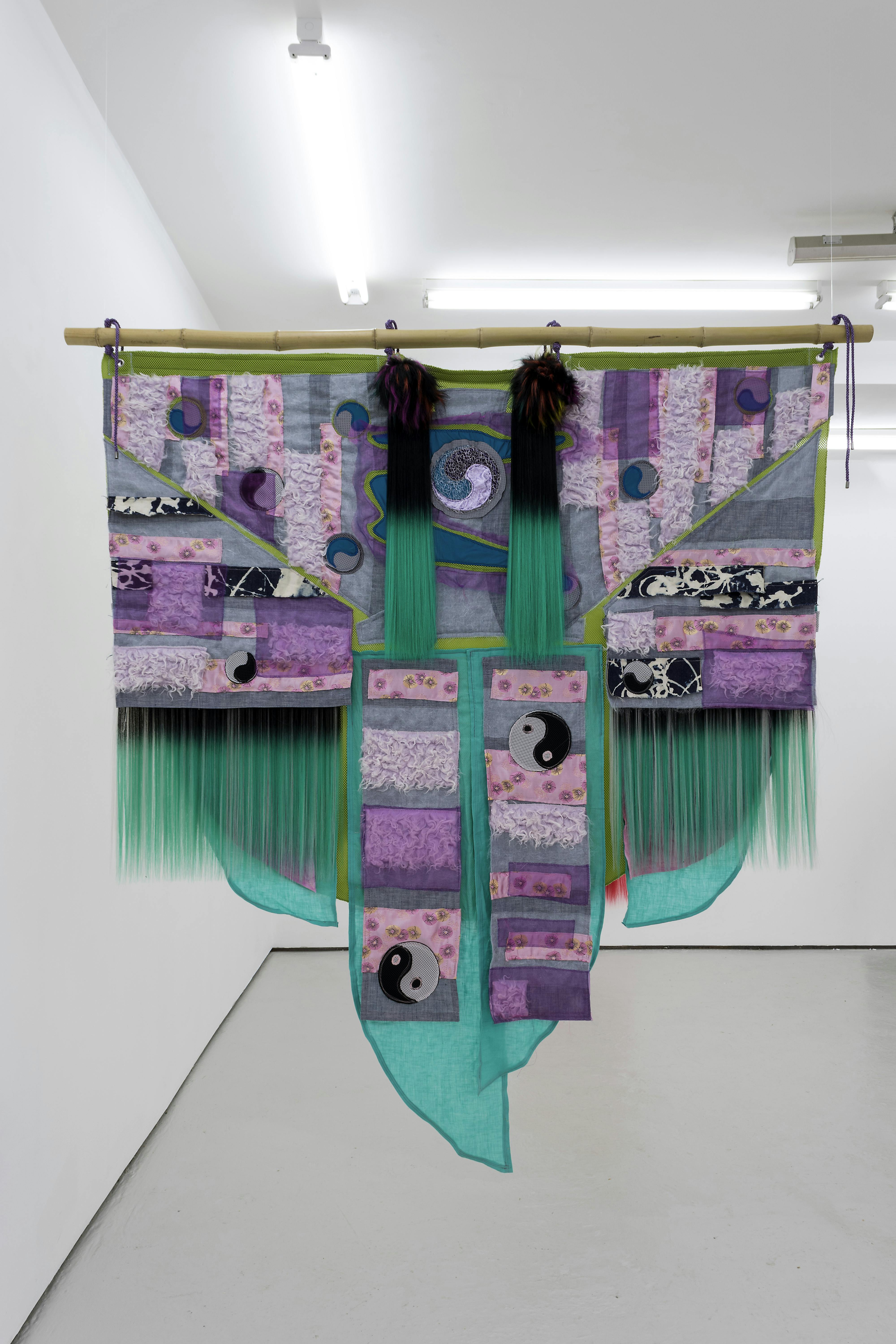Bio Enhanced/Hiero Advanced: The Genius of Gene Jupiter, 2018, hand sewn and machine stitched assorted fabrics and synthetic hair on bamboo, 166 x 170 cm