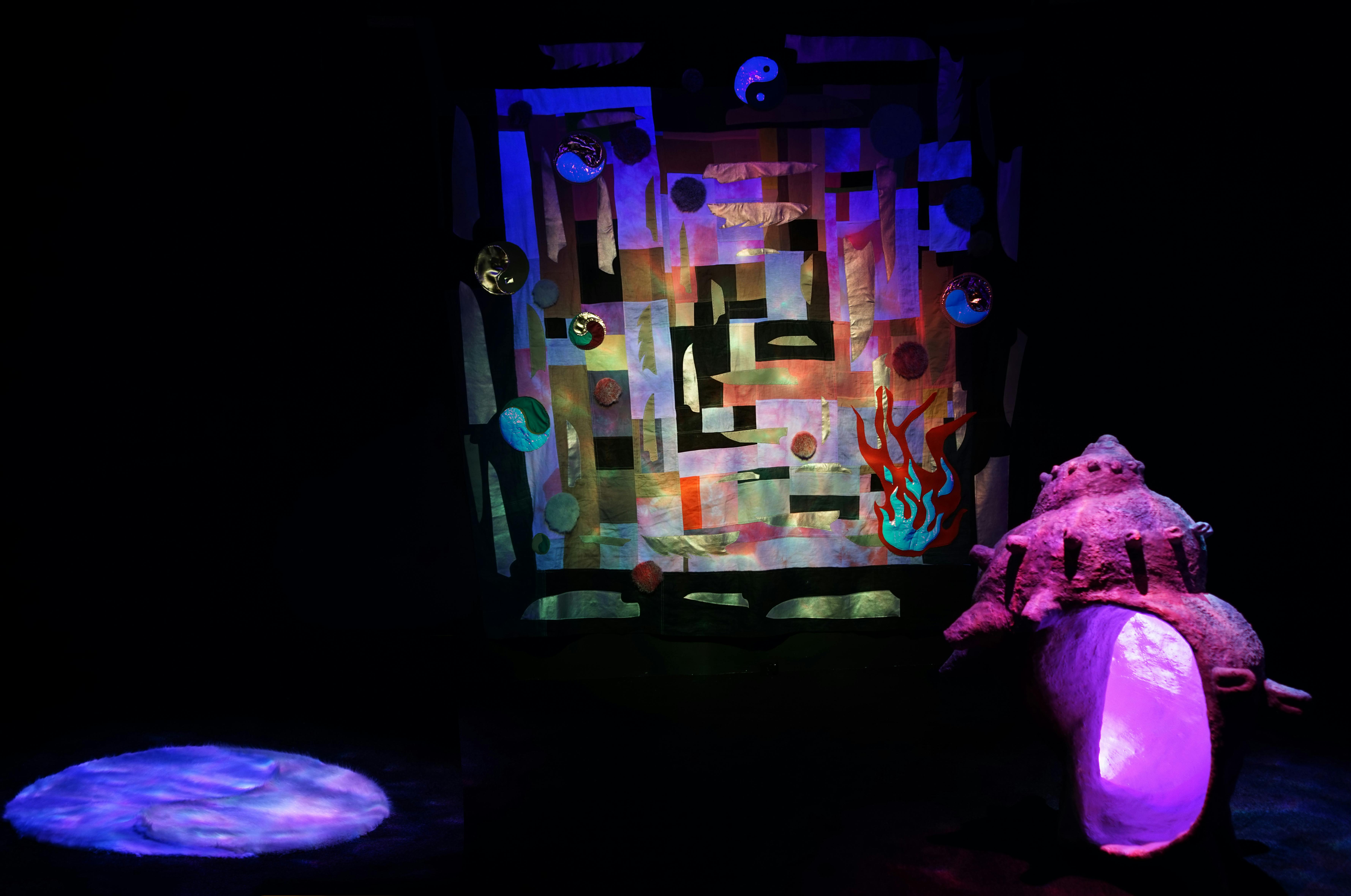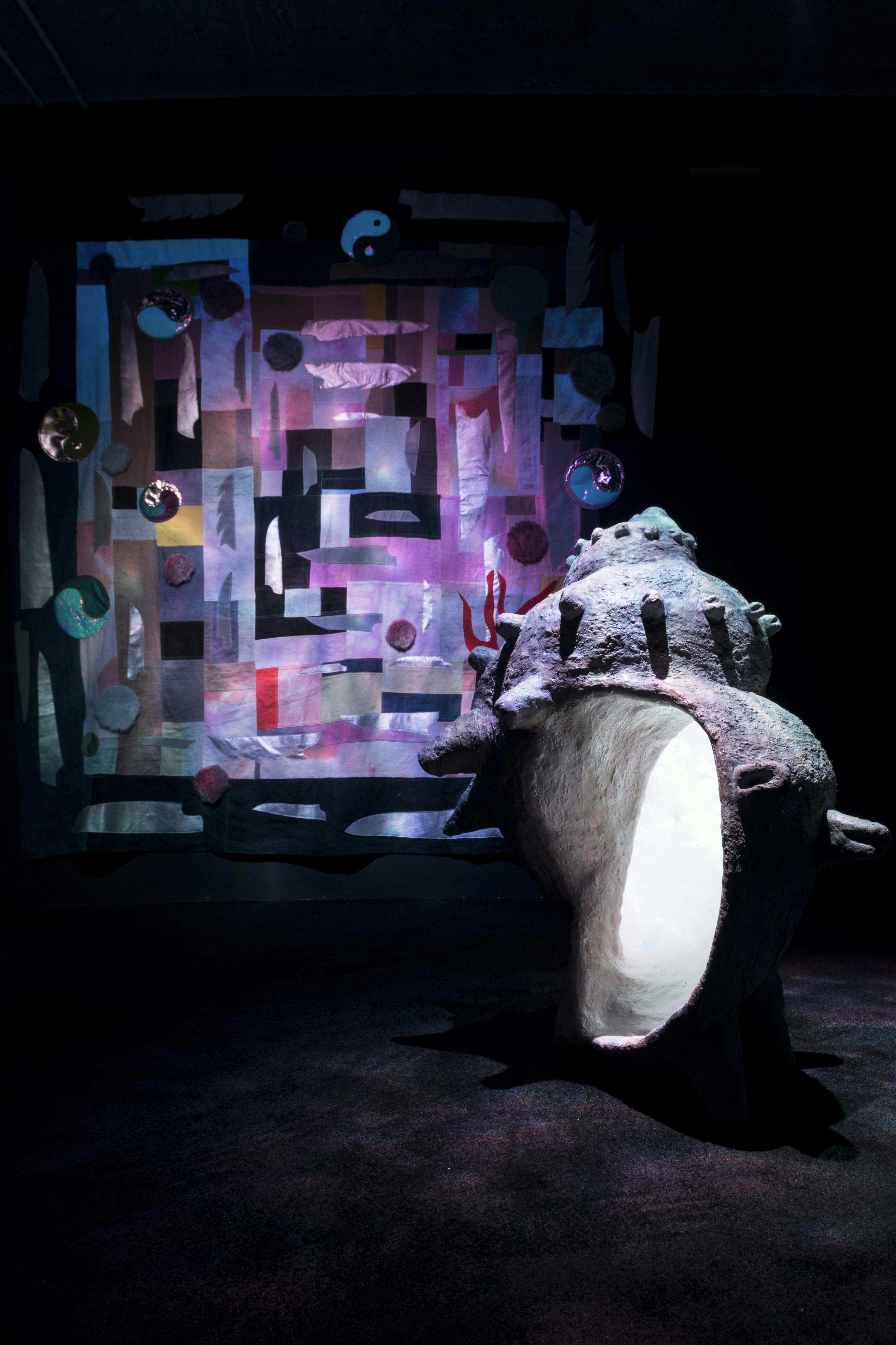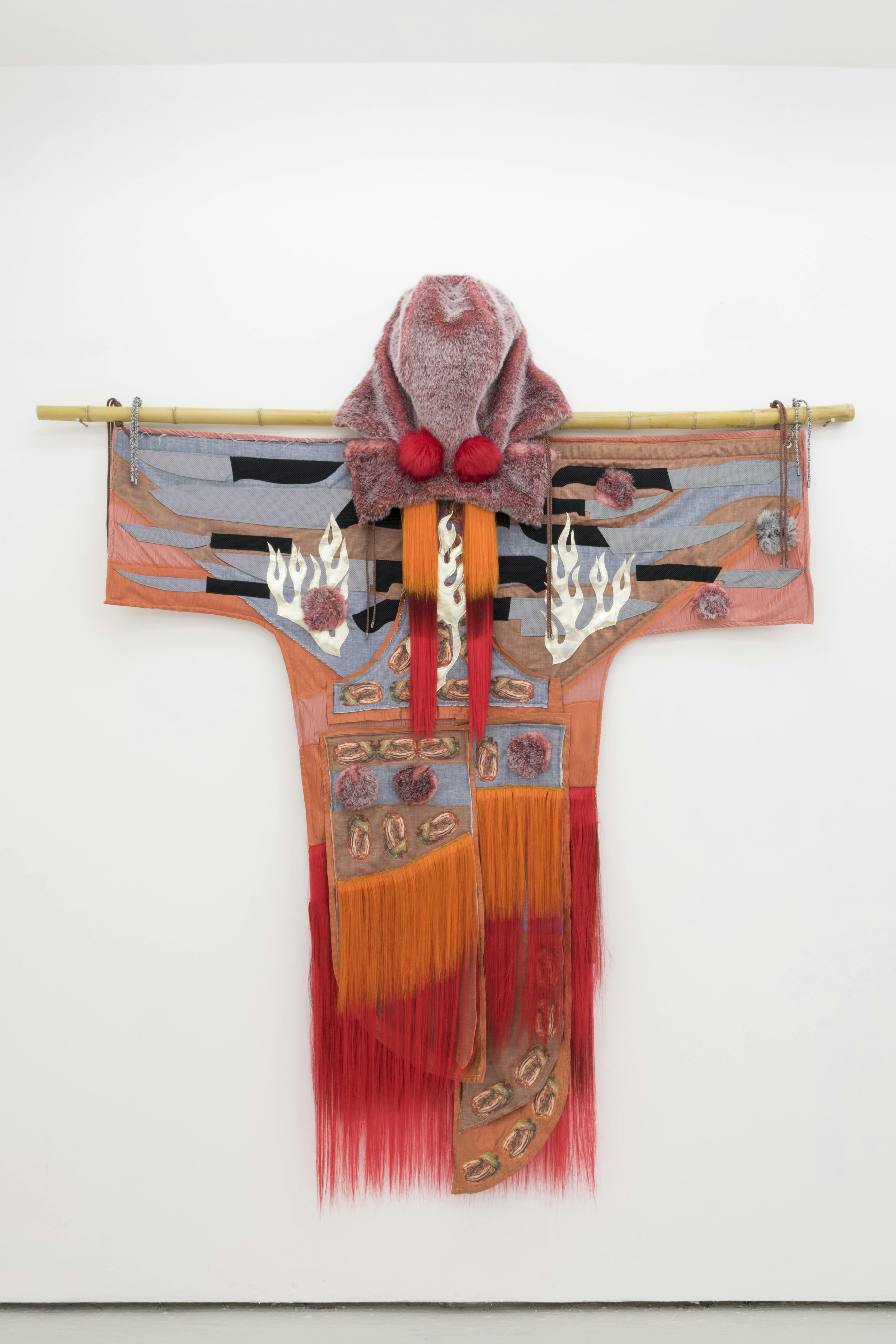 The Re-Up of Yung Yoomi: Hell Fire Can’t Scorch Me, 2018, hand sewn and machine stitched assorted fabrics, faux fur and synthetic hair on bamboo, 188 x 210 cm
