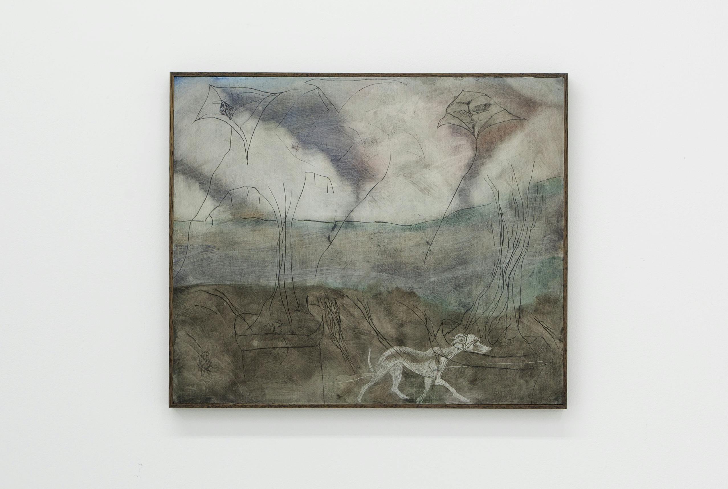 Martin Aagaard Hansen, Hawk Kites and Nats Dog, 2020, oil, engraving and gesso on panel, 39 x 46.5 cm
