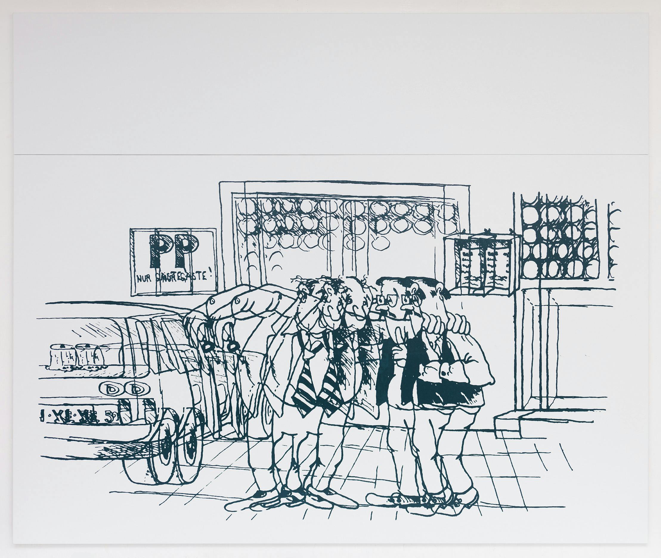 Oliver Osborne, Niemetzstraße, 2014-23, silkscreen on linen, 263 x 314 cm in two panels 193 x 314 and 70 x 314 cm