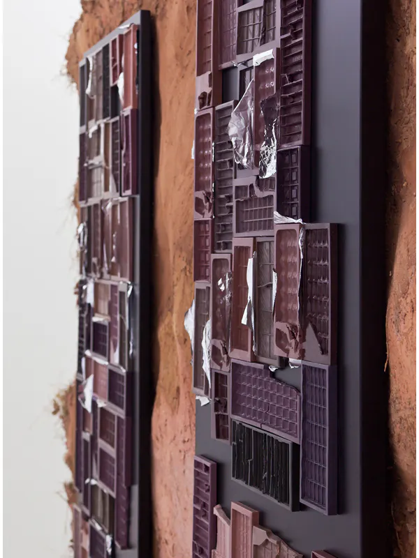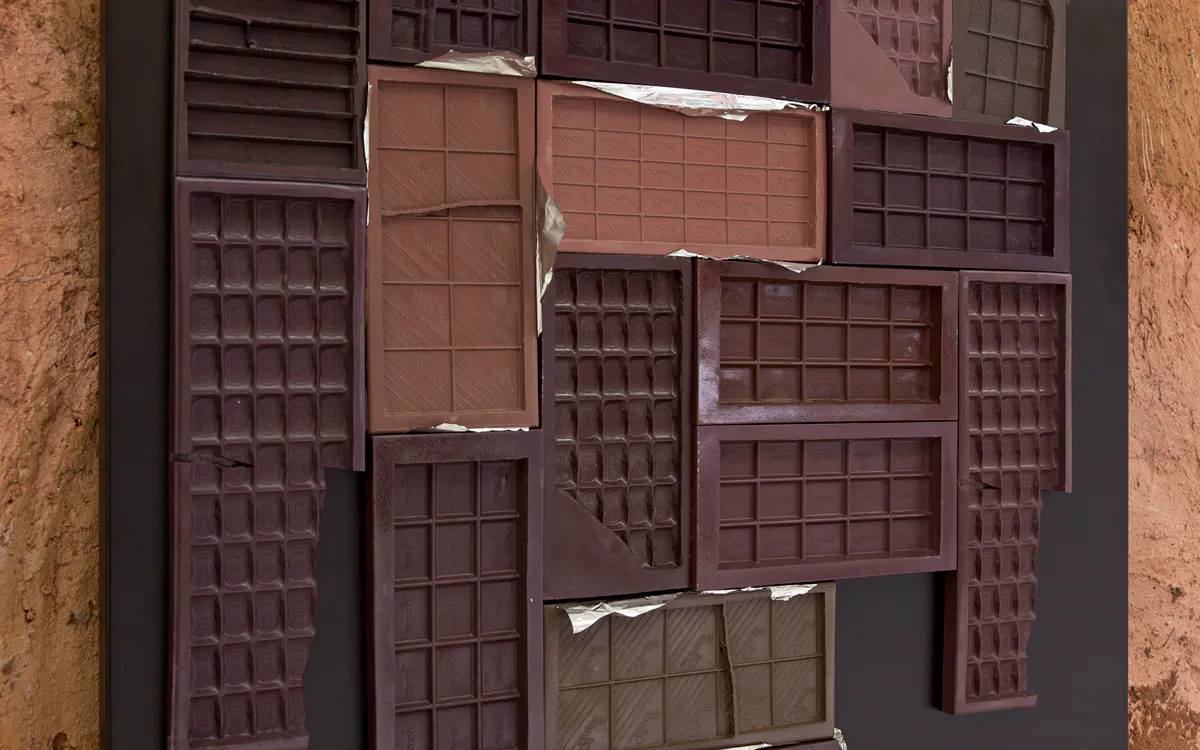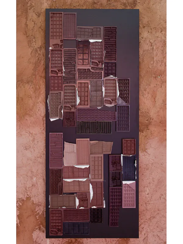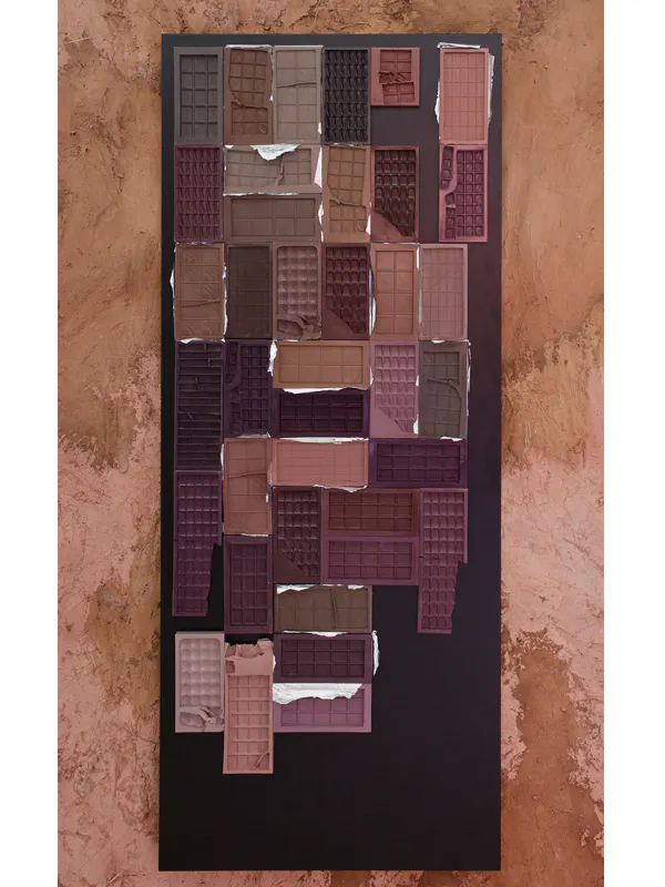 1 Kit Kat 16 Bites, 4 Lindt 30 Bites and 4 10 Bites, 4 Smarties Sharing Block 16 Bites, 2 Galaxy Smooth Milk 42 Bites (More or Less), 6 Niederegger Lubeck Marzipan Classic 10 Bites, 4 Nestle 50 Bites, 2 Cadbury Bournville Classic Dark 32 Bites, 2 Nestle Aero 28 Bites, 7 Reese‘s Filled with Peanut Butter 15 Bites, 1 Milka Avellanas Enteras 32 Bites (Detail), 2016, tinted hard plastic, magnets, aluminum foil, laser-cut, bent and powder coated steel sheet, 179 cm x 73 cm