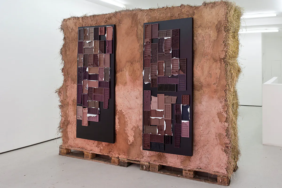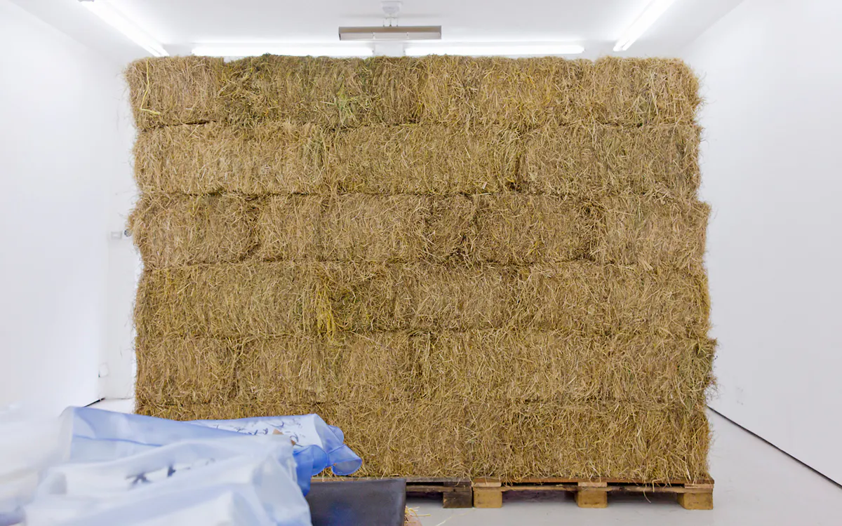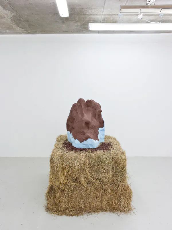 Sincerely Yours (Inner), 2016, automotive clay and clay modeling film on extruded polystyrene foam, wood, earth plaster and hay bales, 140 x 100 x 95 cm