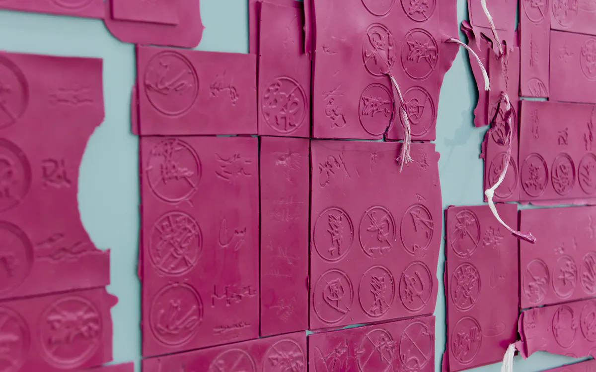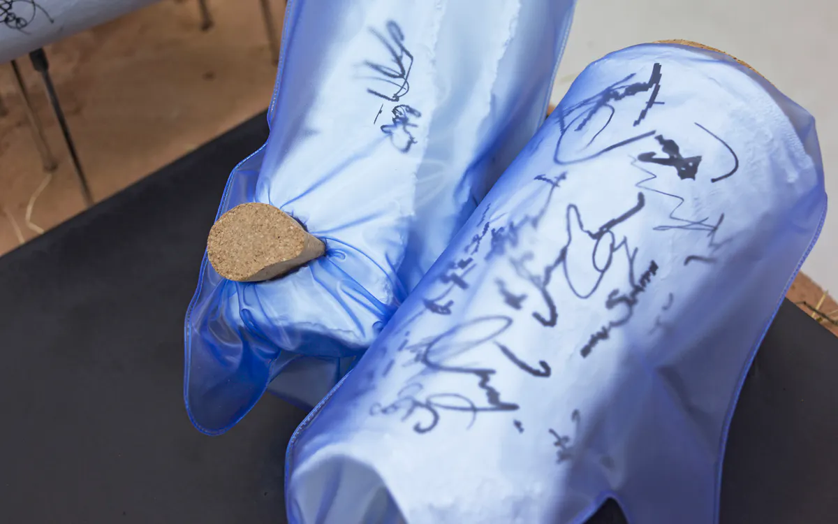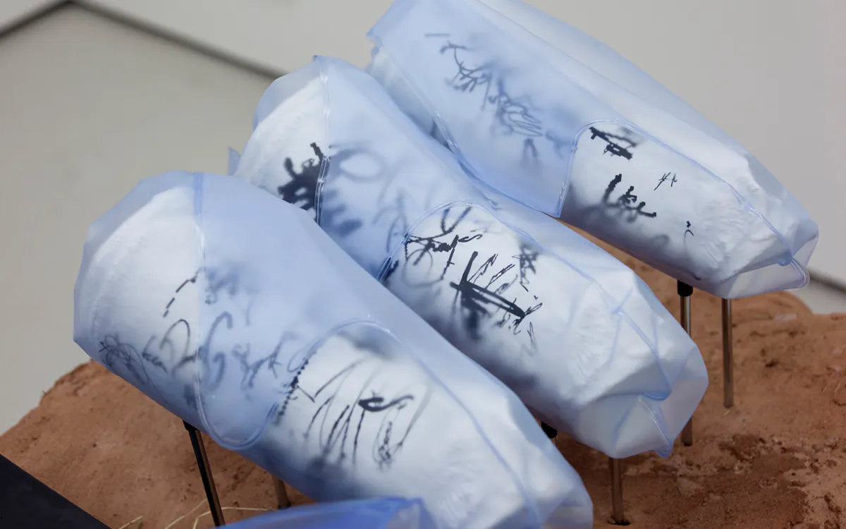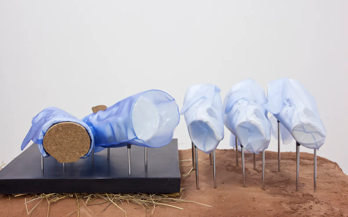 To Whom it May Concern (Detail), 2016, cast plastic, translucent vinyl, cork, rubber tips, chromed steel rods, polyurethane resin on extruded polystyrene foam, baling twine, wire mesh, earth plaster and hay bales, 110 x 110 x 50 cm