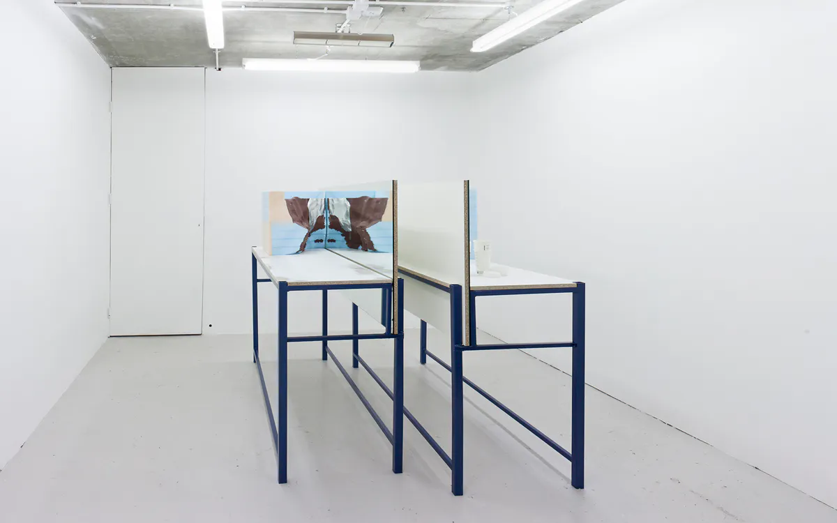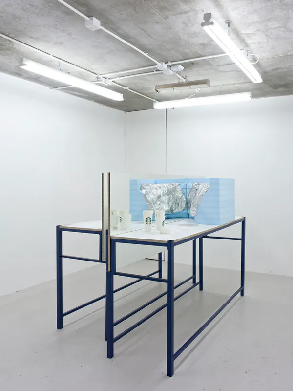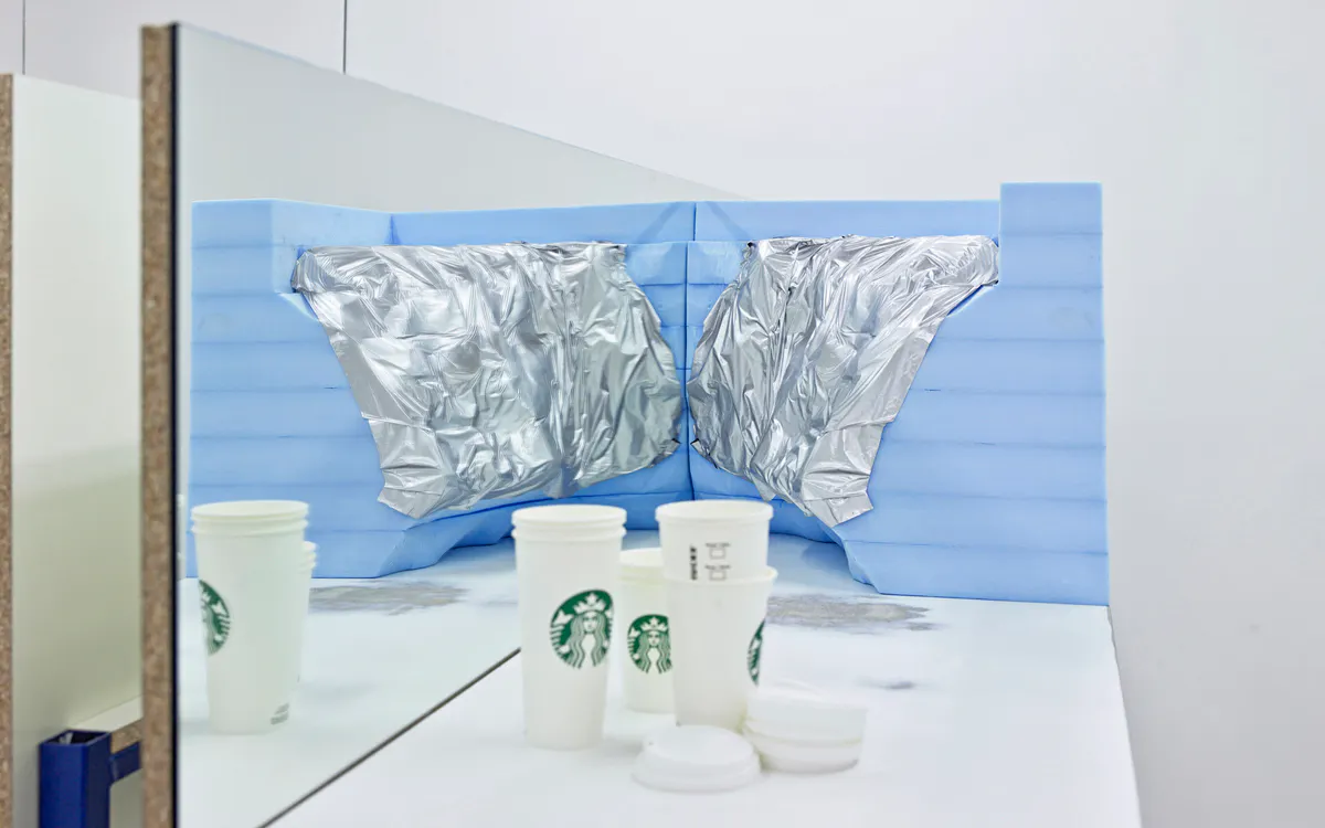 Sincerely Yours (Outer Left Section), 2016, automotive clay and clay modeling film on extruded polystyrene foam, mirror, chipboard, steel table and paper cups, 150 x 63 x 196 cm