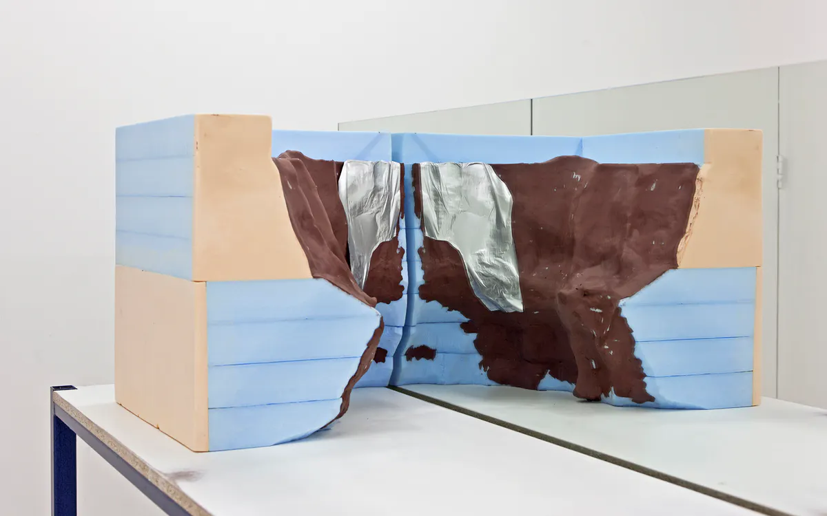 Sincerely Yours (Outer Right Section) (Detail), 2016, automotive clay and clay modeling film on extruded polystyrene foam, mirror, chipboard and steel table, 150 x 63 x 196 cm