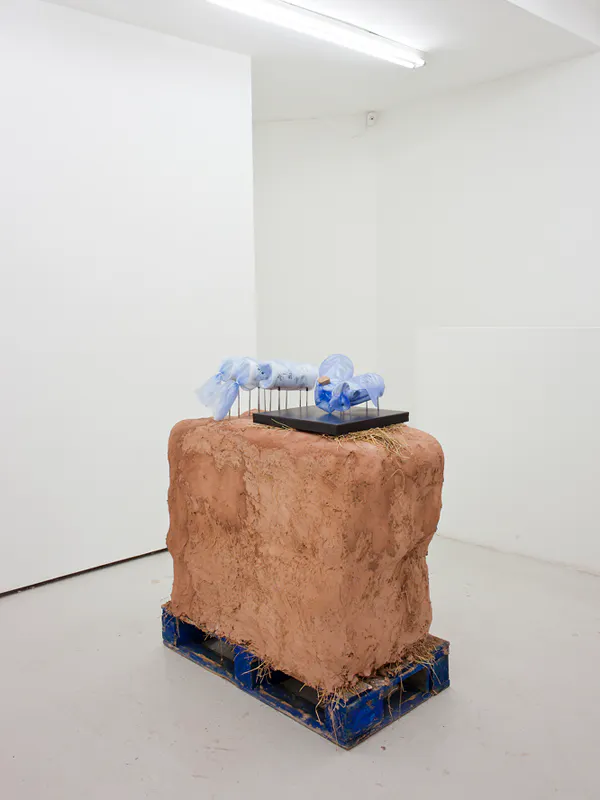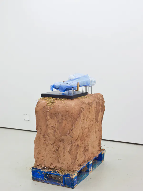 To Whom it May Concern, 2016, cast plastic, translucent vinyl, cork, rubber tips, chromed steel rods, polyurethane resin on extruded polystyrene foam, baling twine, wire mesh, earth plaster and hay bales, 110 x 110 x 50 cm