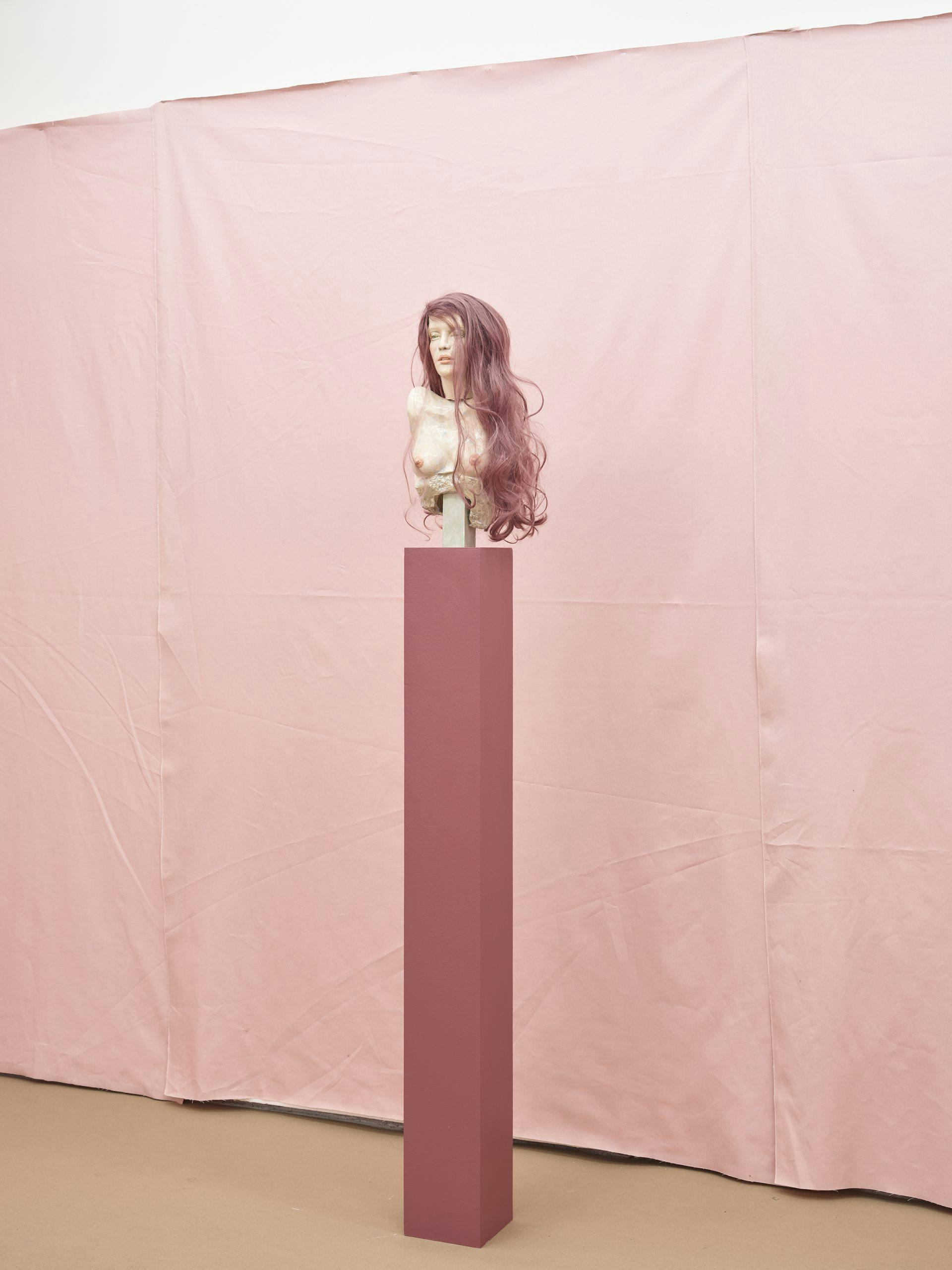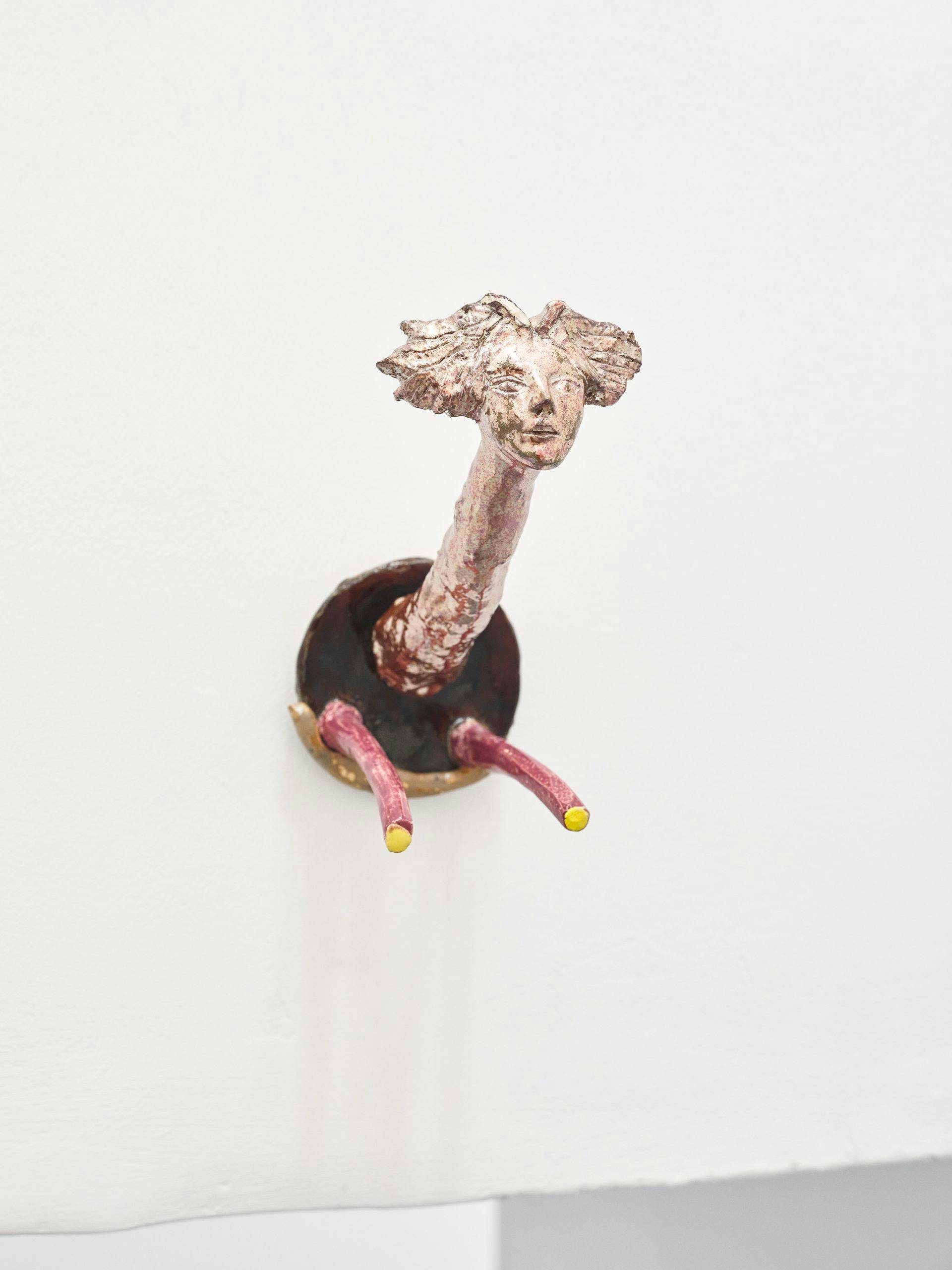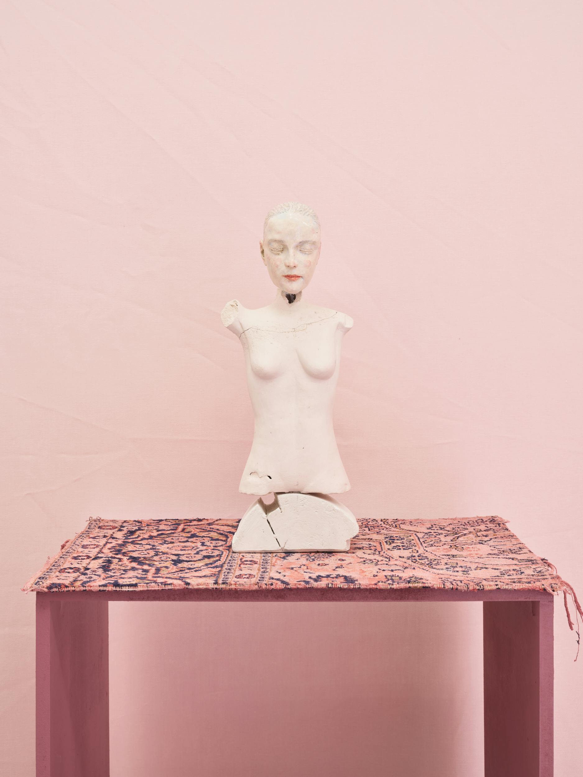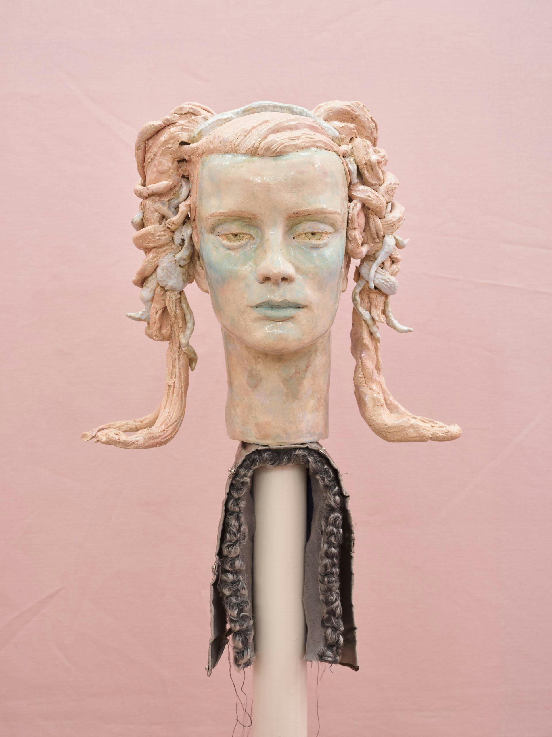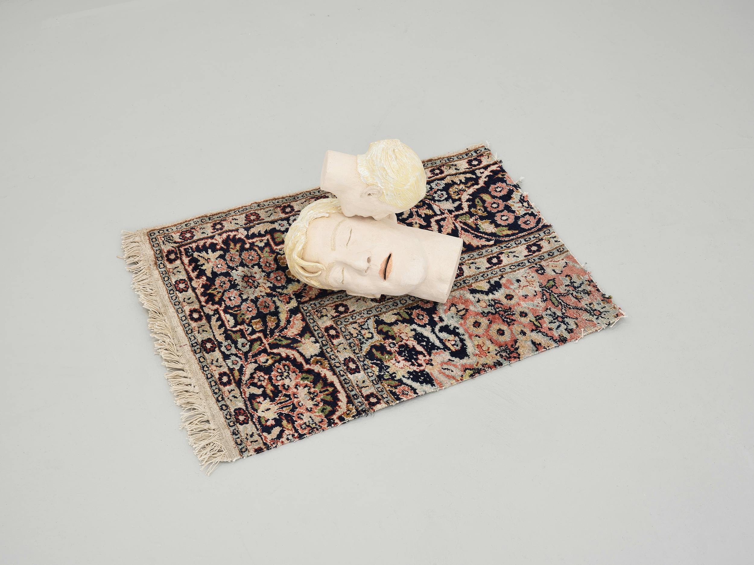 Glaze on ceramic, oil paint, ink, artificial hair & carpet