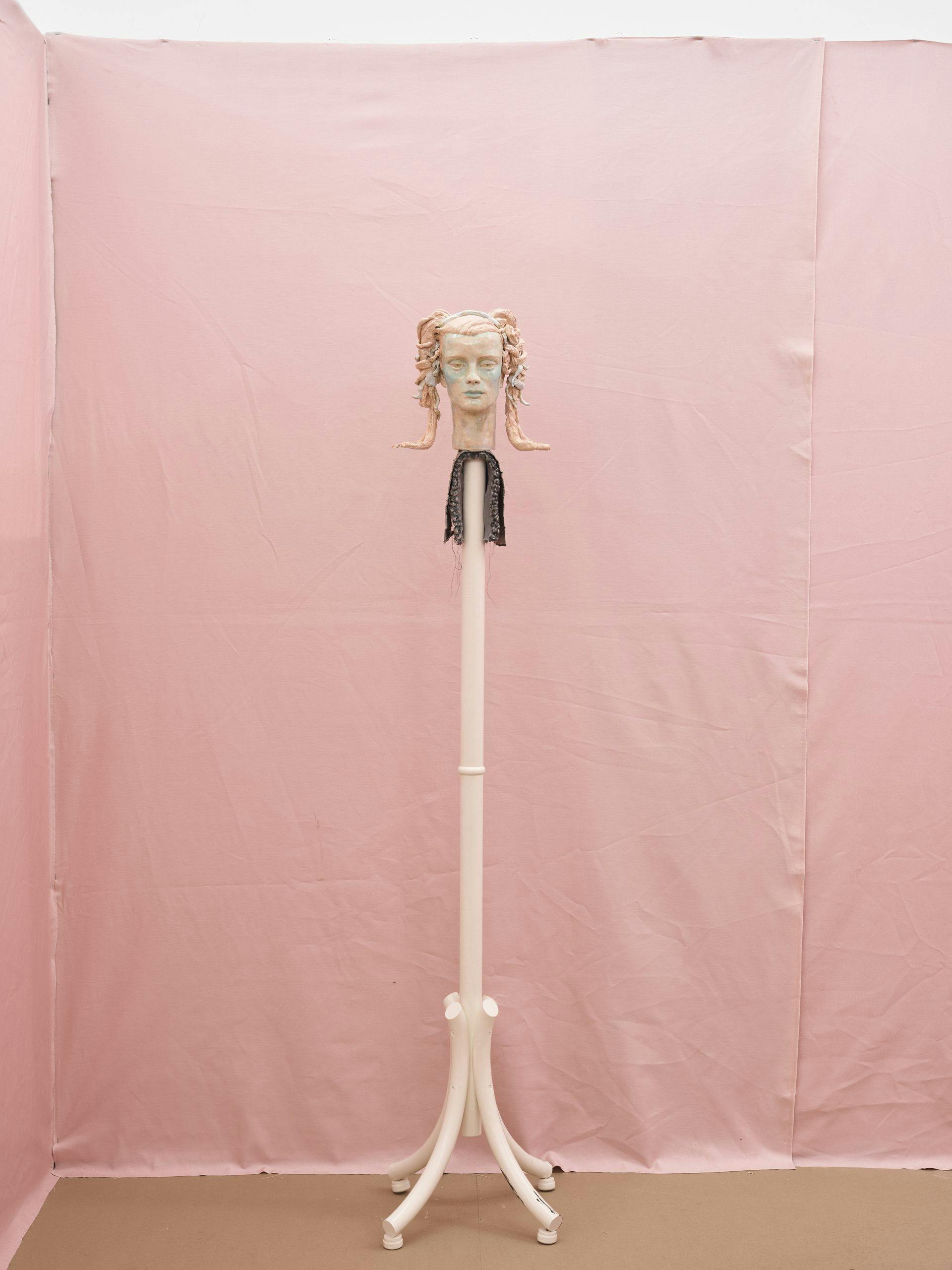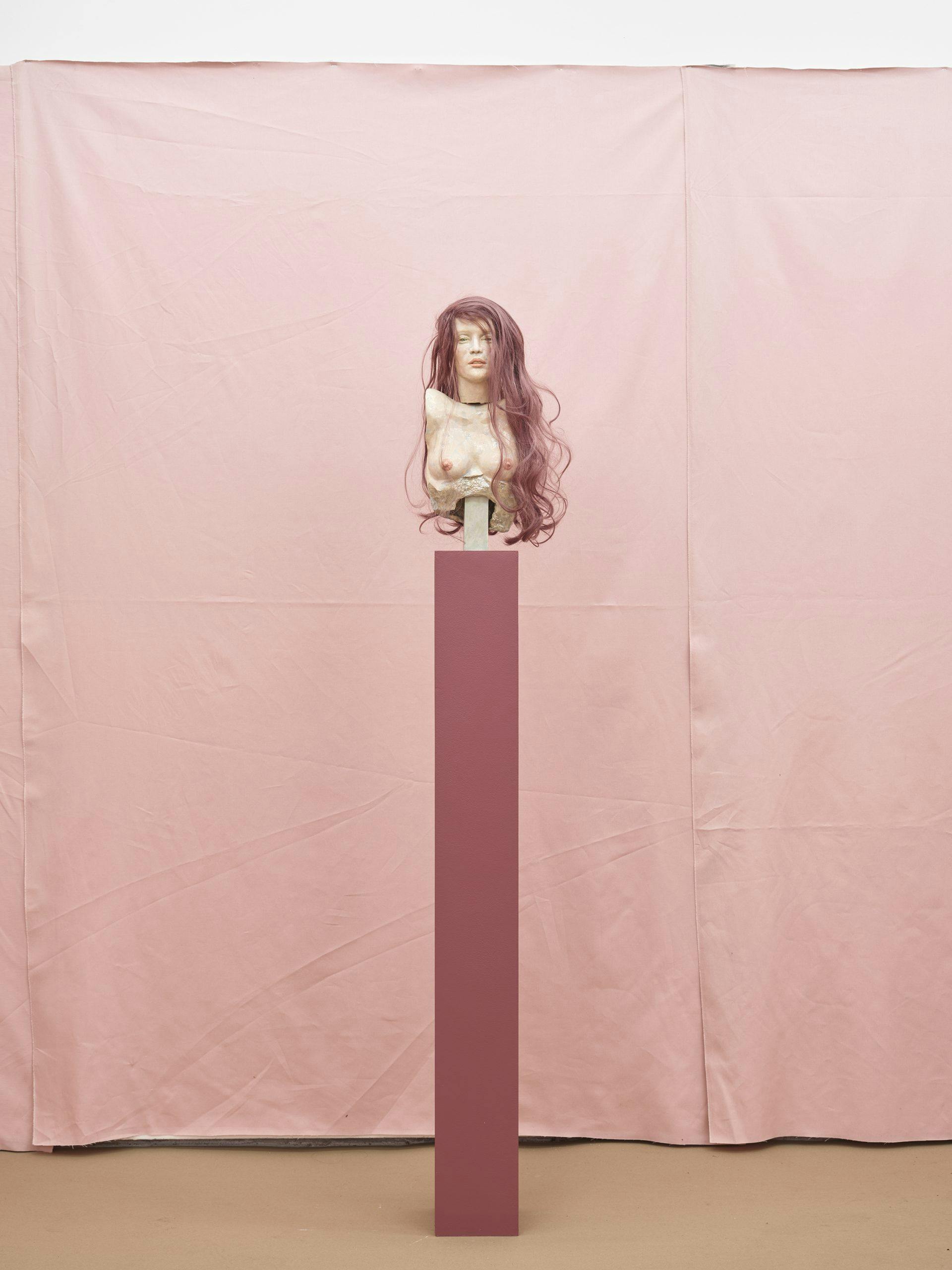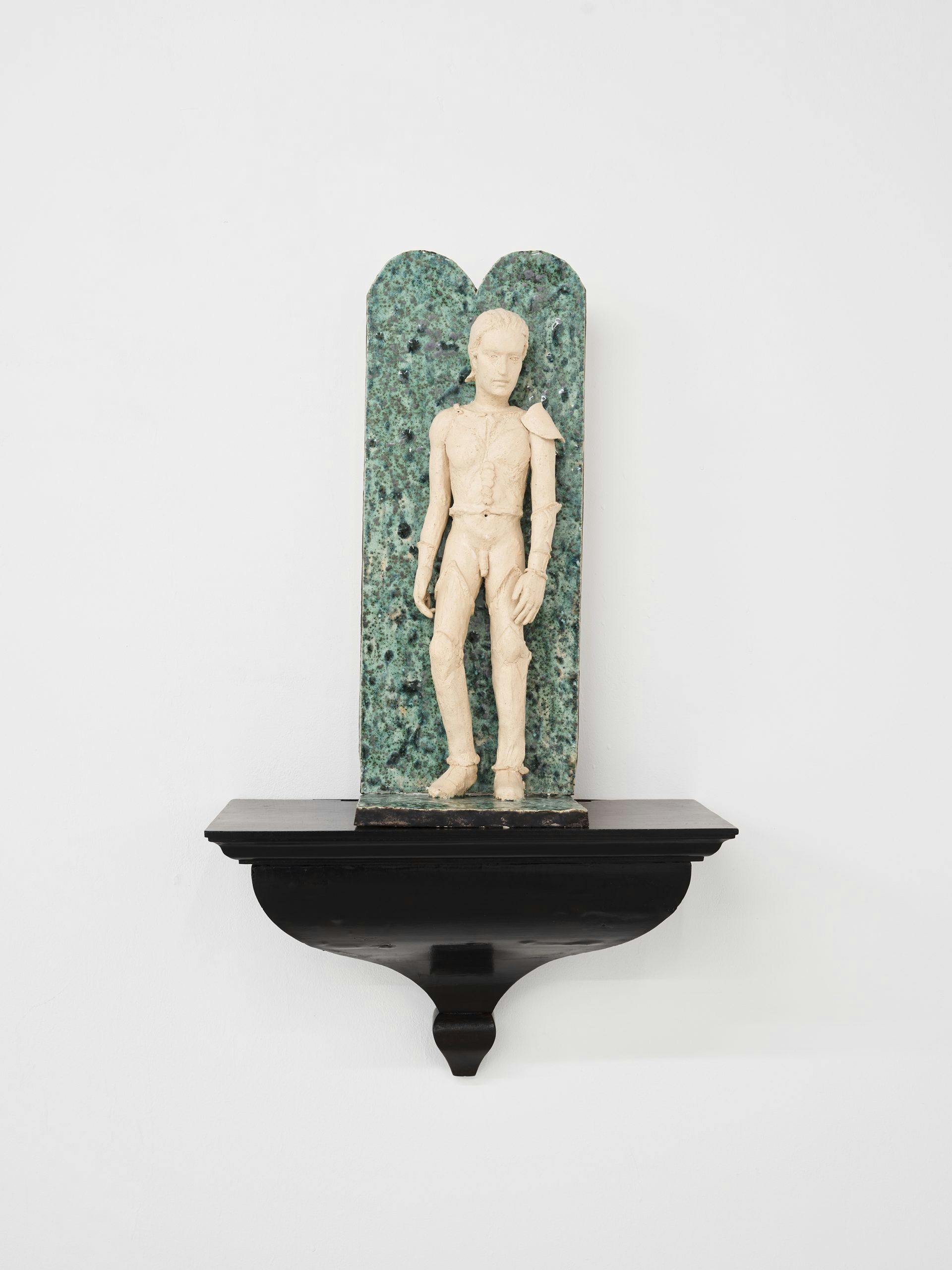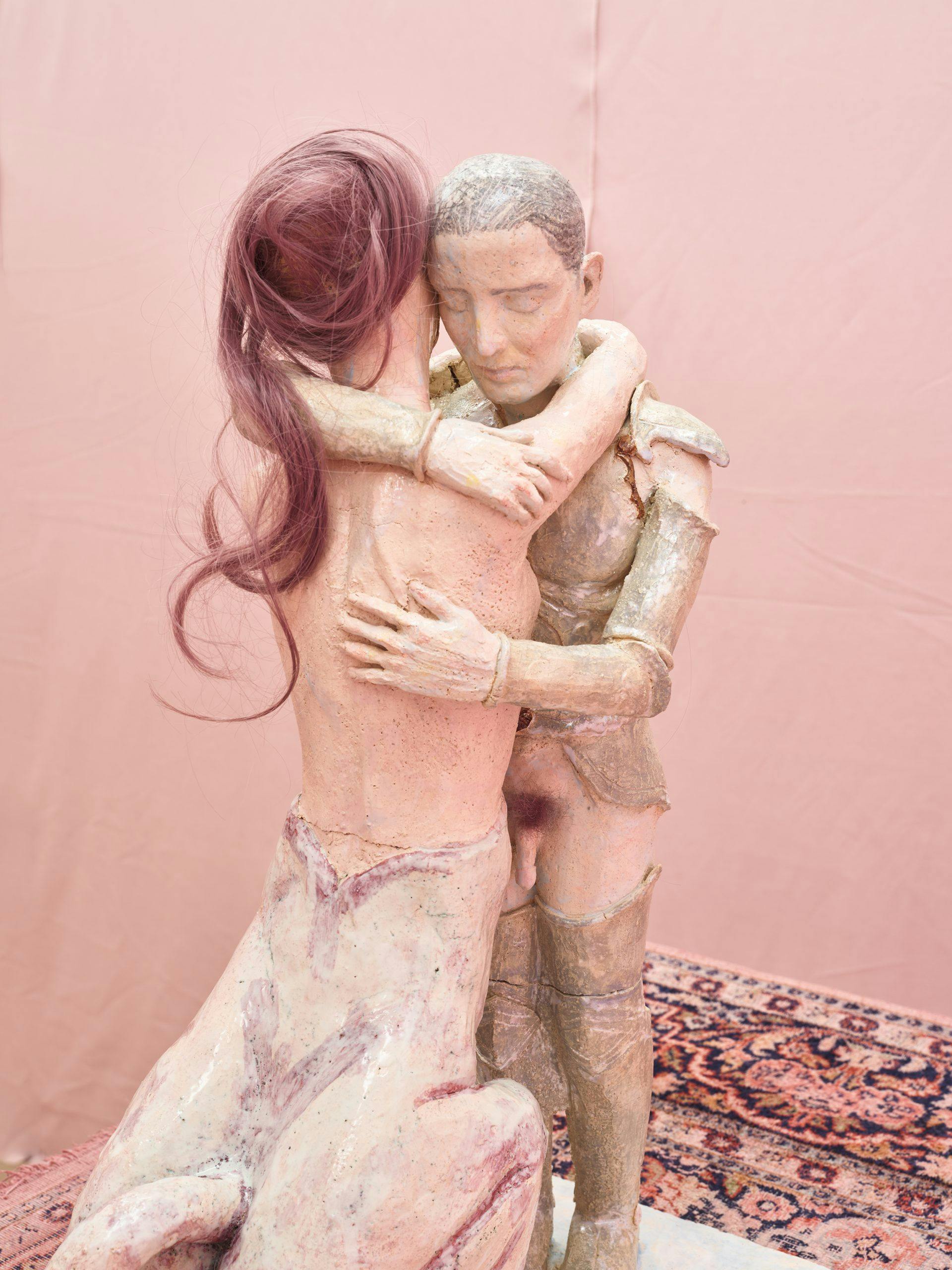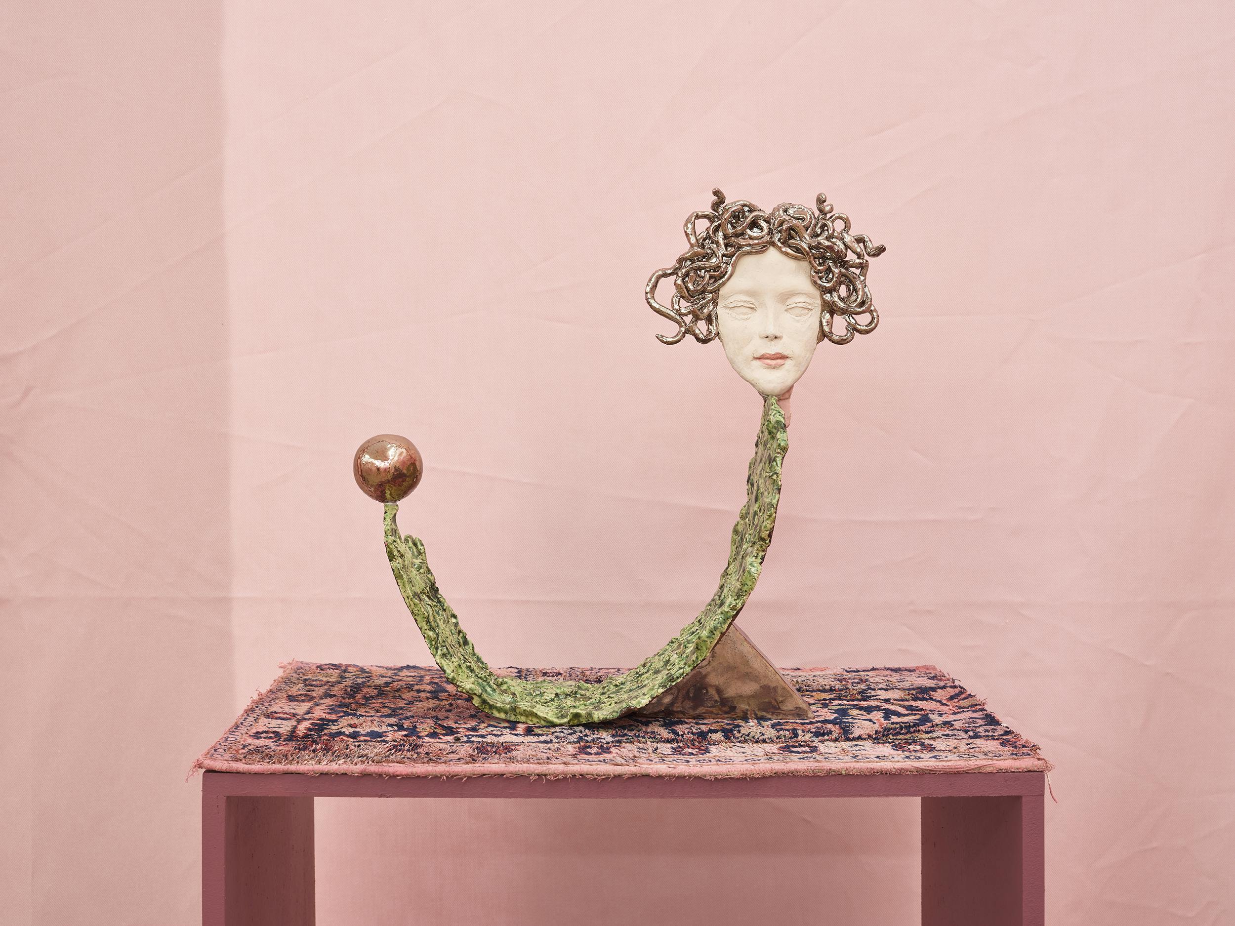 Glaze on ceramic, oil paint, ink, artificial hair & carpet