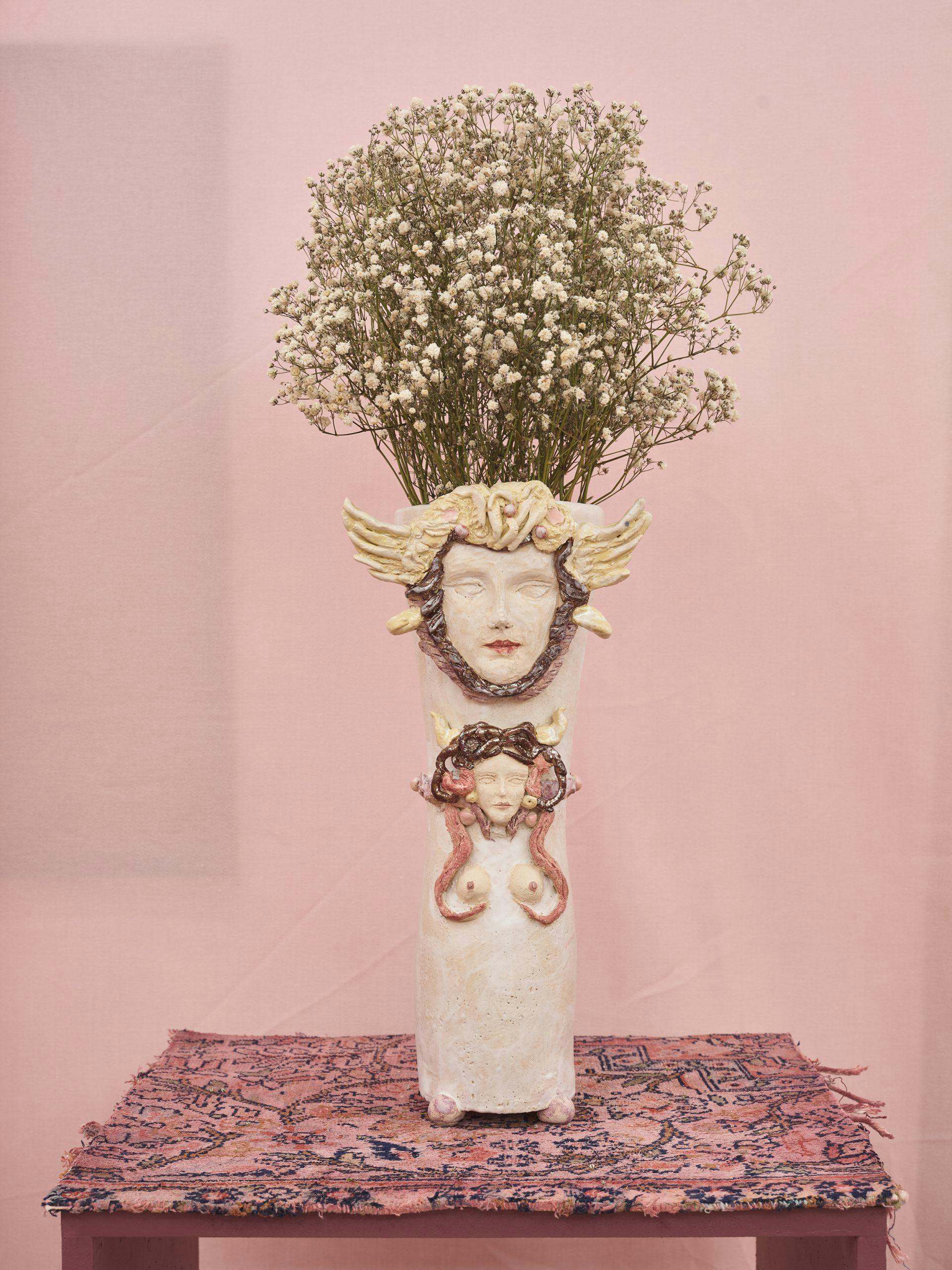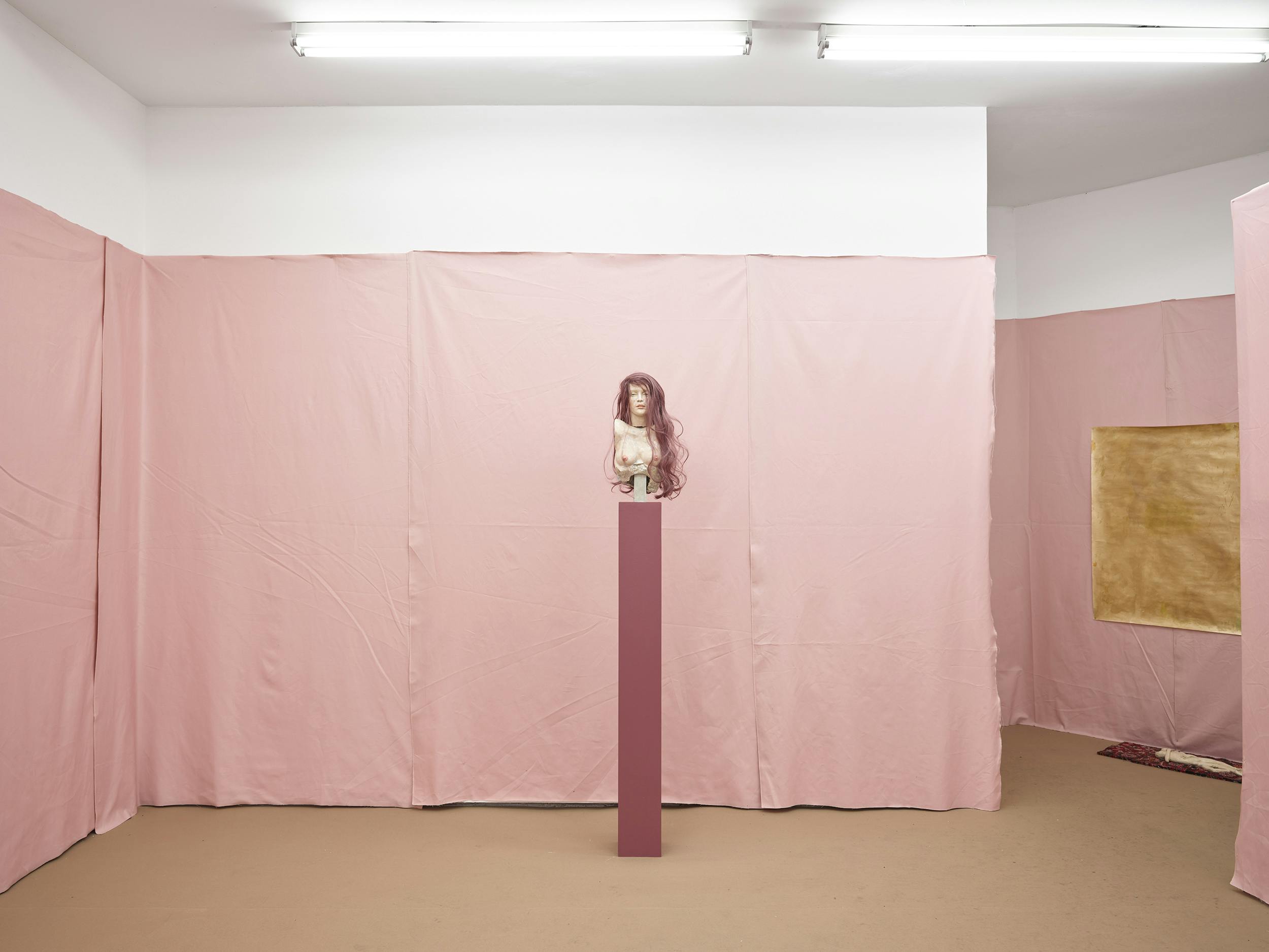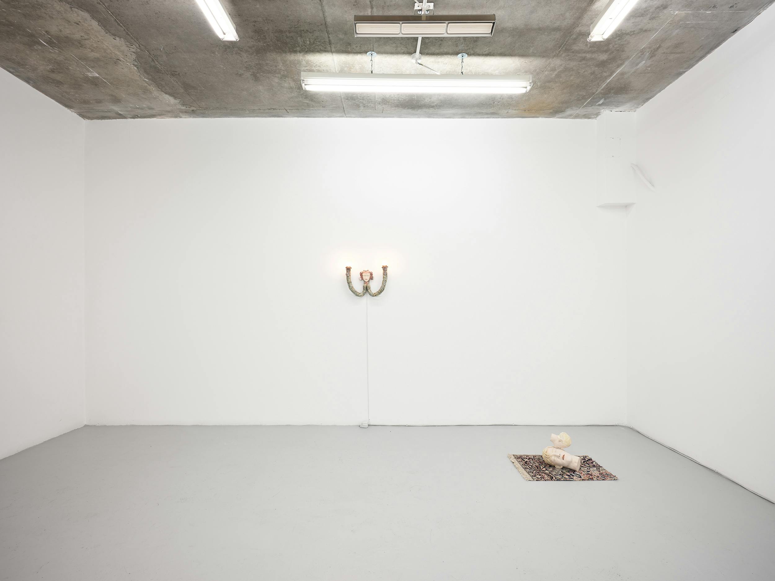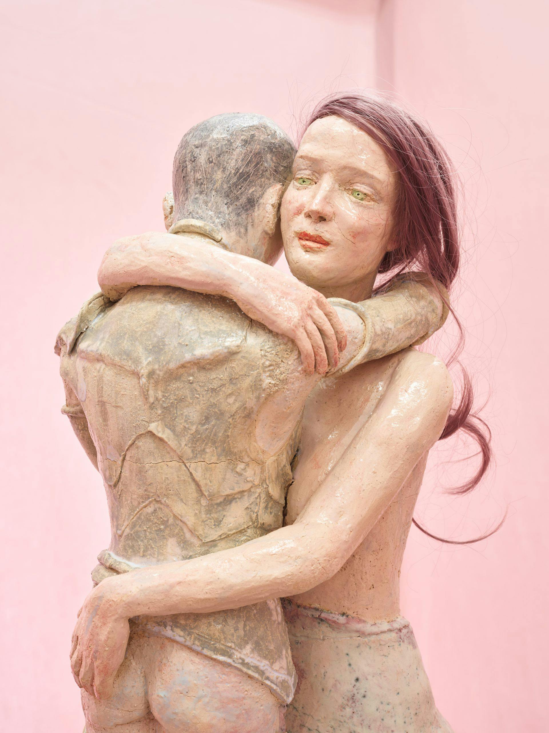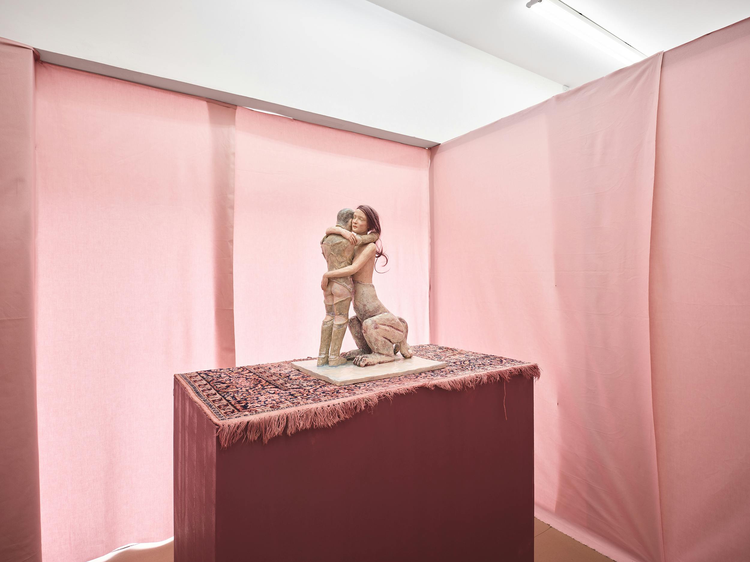 Glaze on ceramic, oil paint, ink, artificial hair & carpet