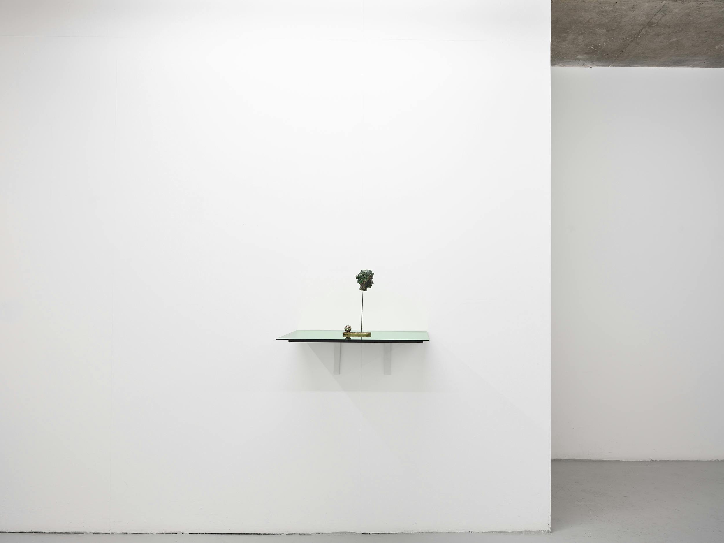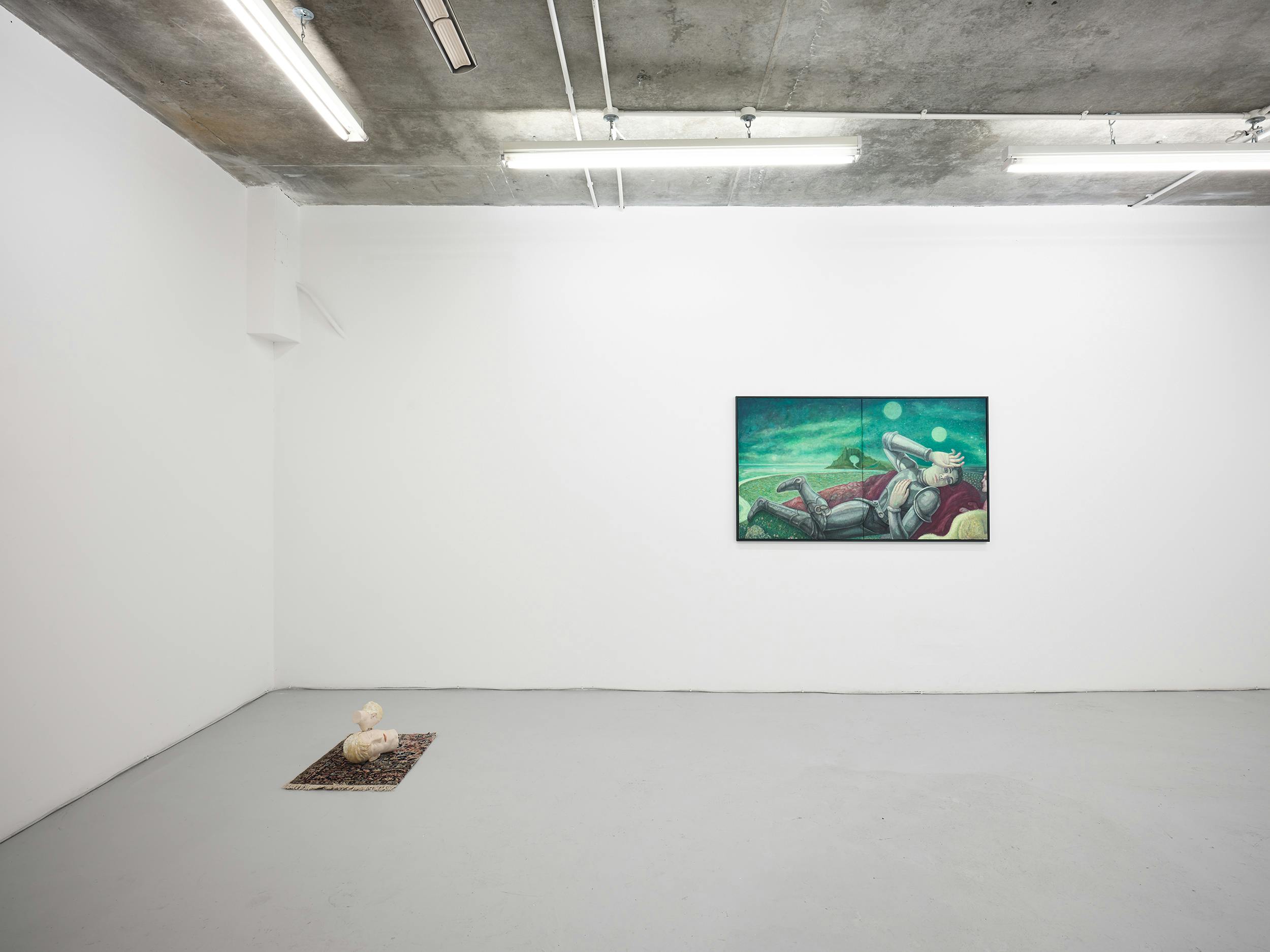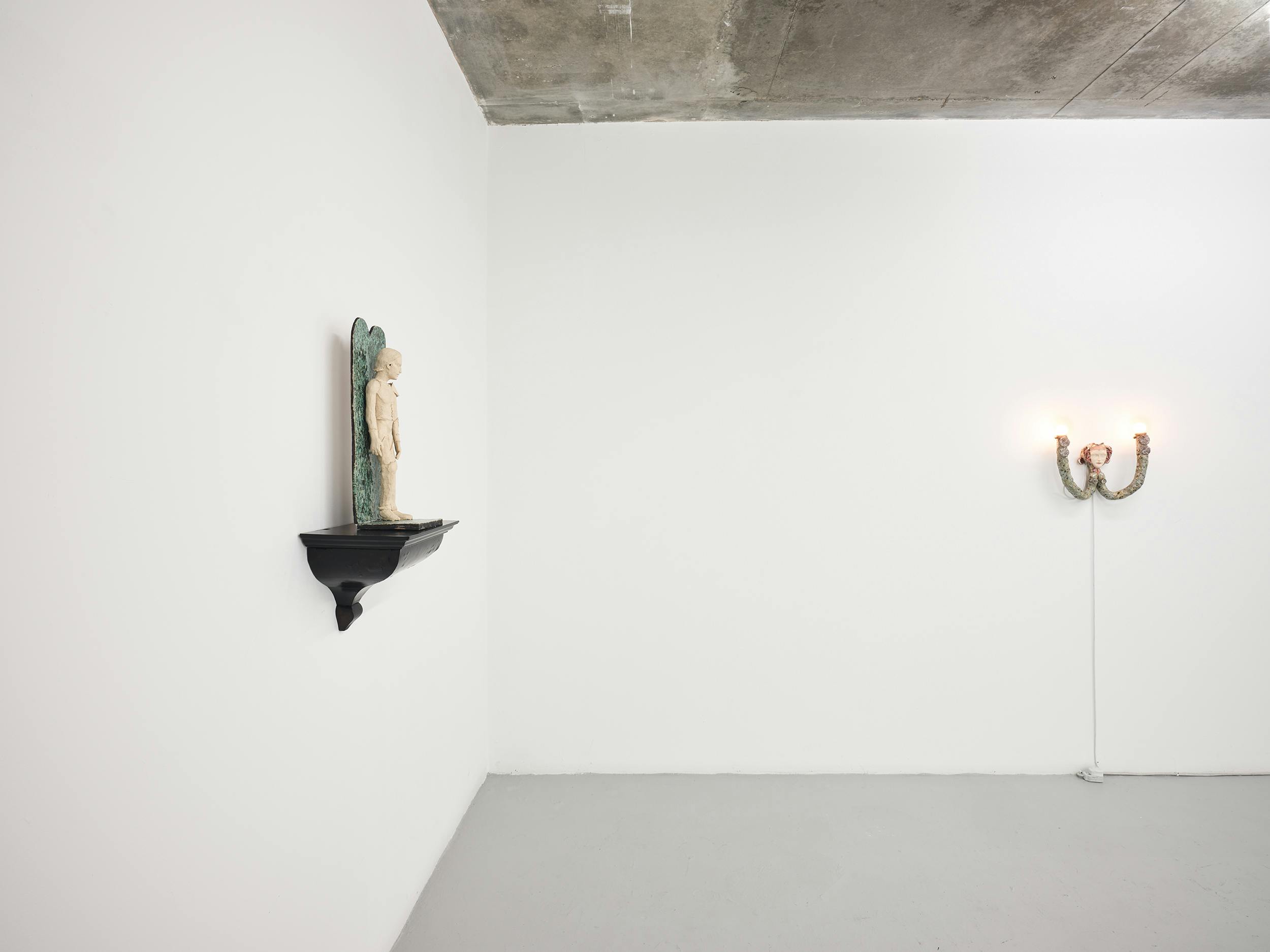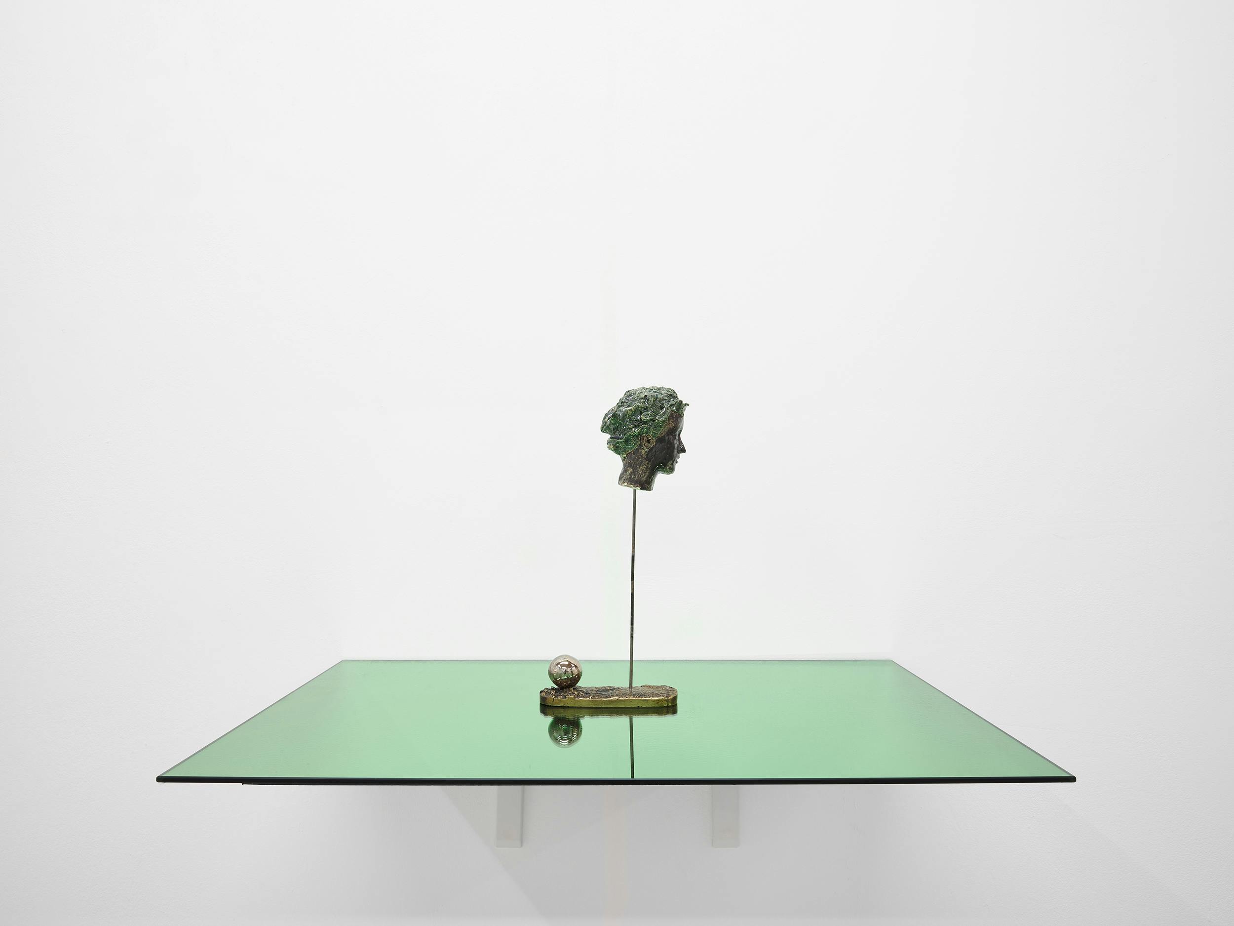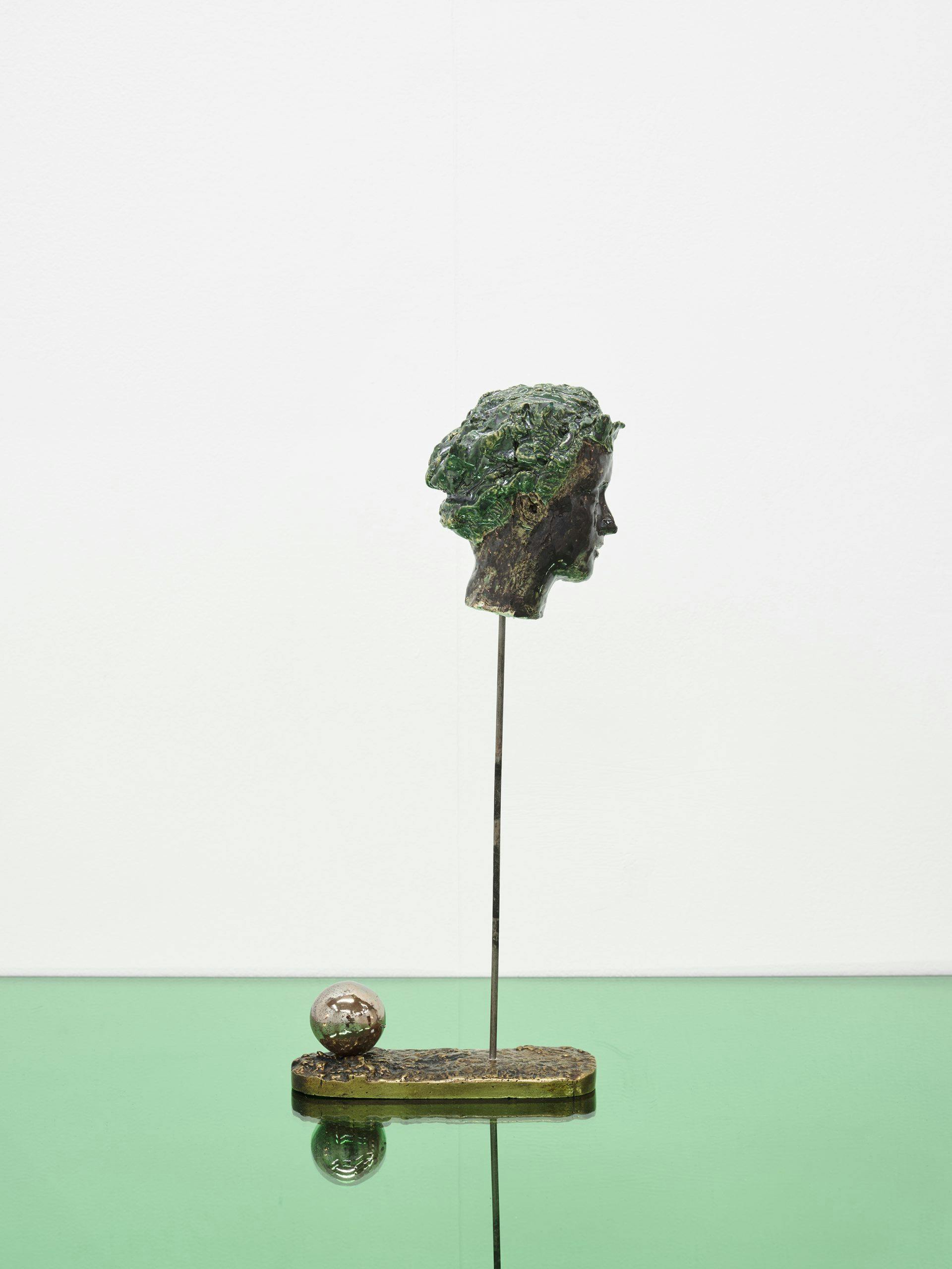 Glaze on ceramic, oil paint, ink, artificial hair & carpet
