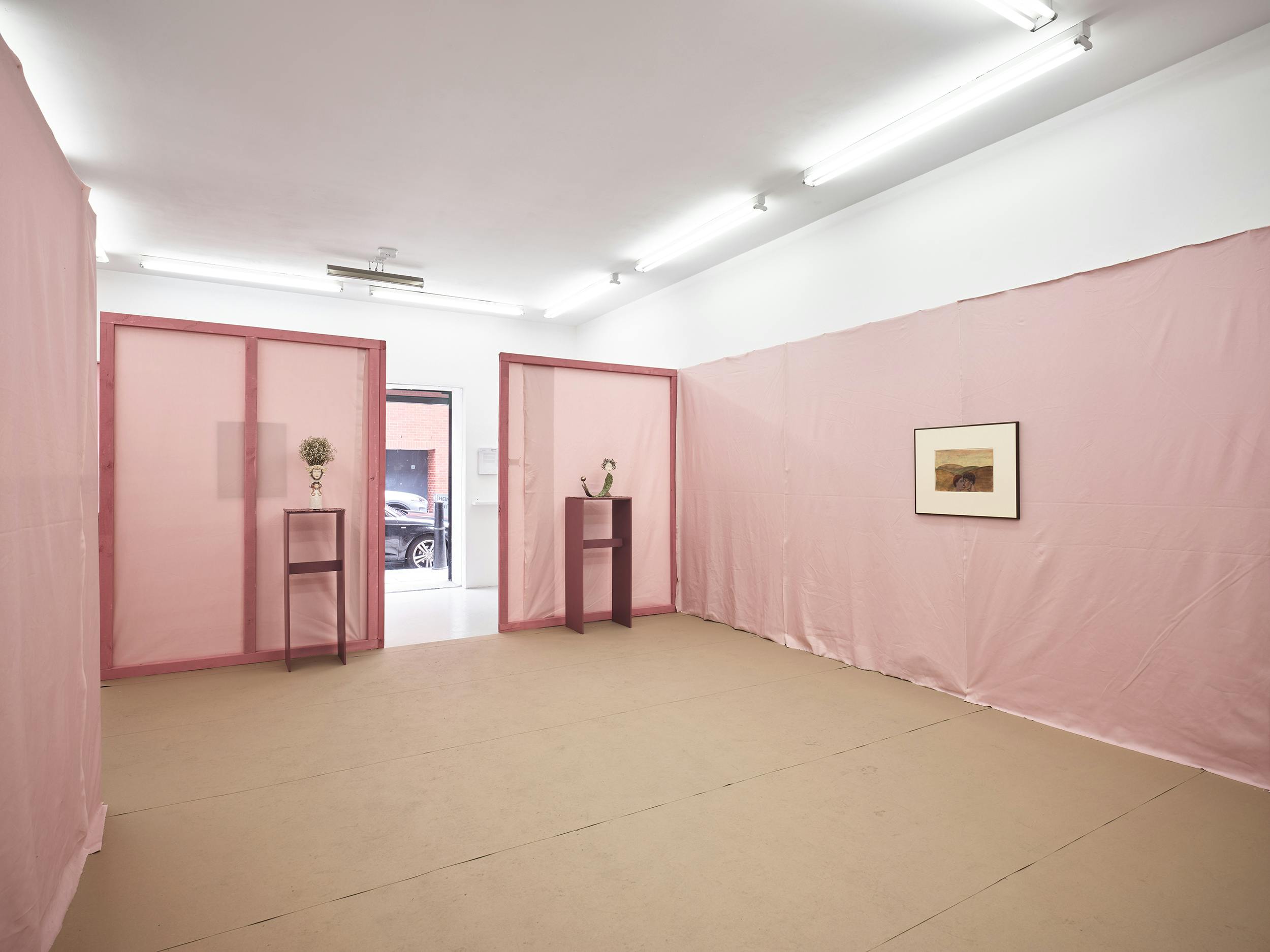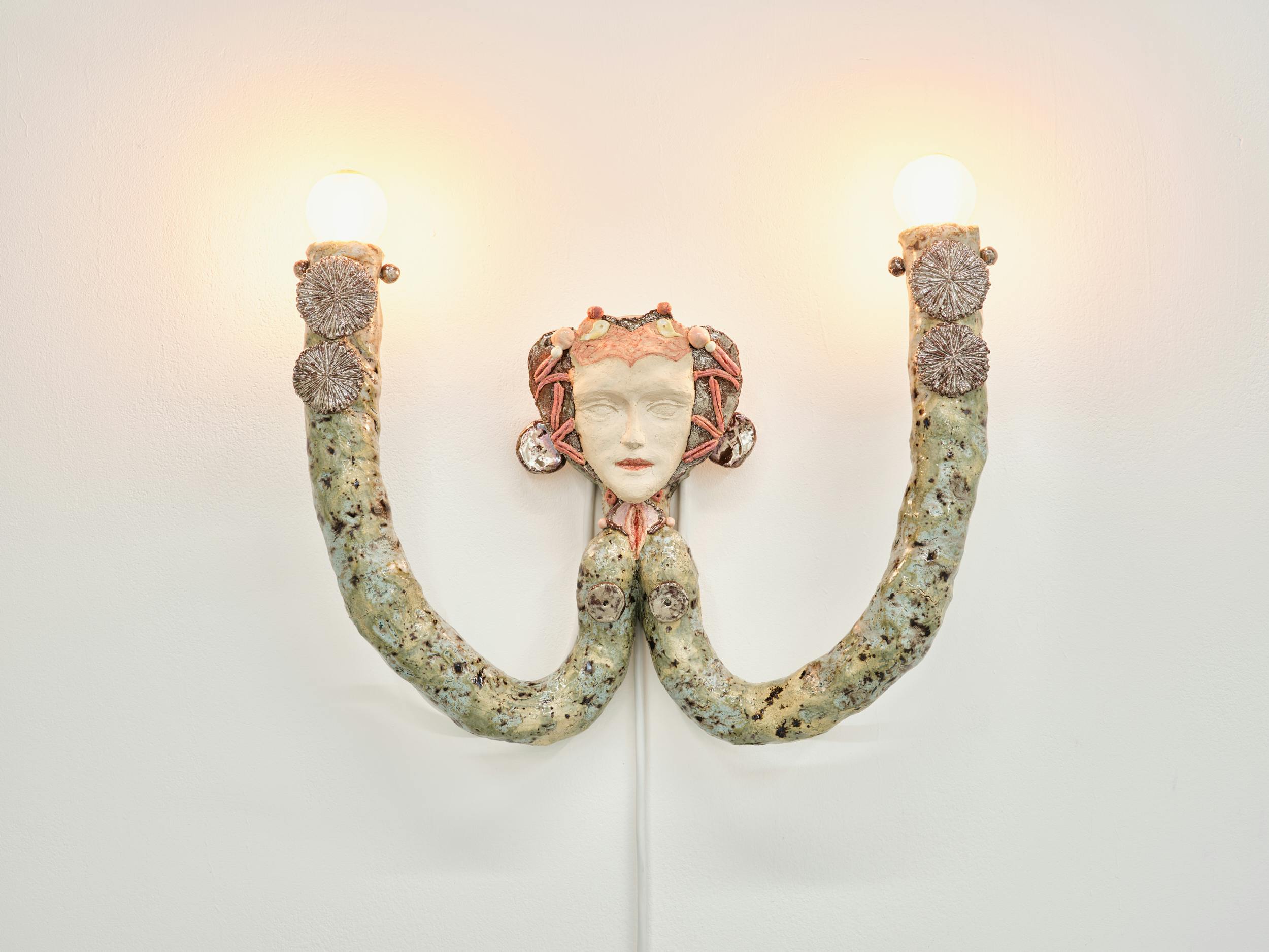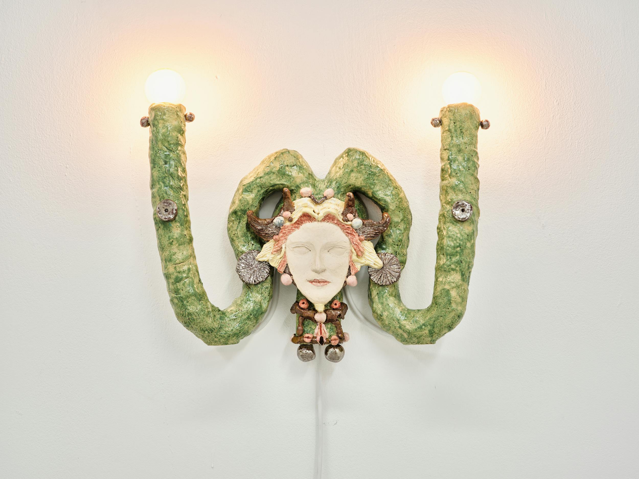Glaze on ceramic, leather, silk polyester blend, buttons & wood