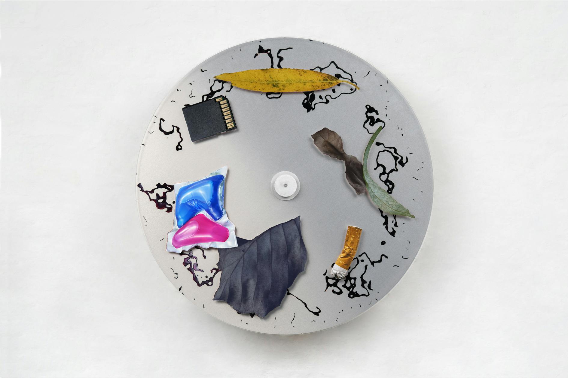 Braudel's Clock - Wash liquid, 2022, Chromalux print on aluminium, UV print on acrylglass, rotating aluminium and steel clock mechanism, 70 cm x 70 cm x 17 cm