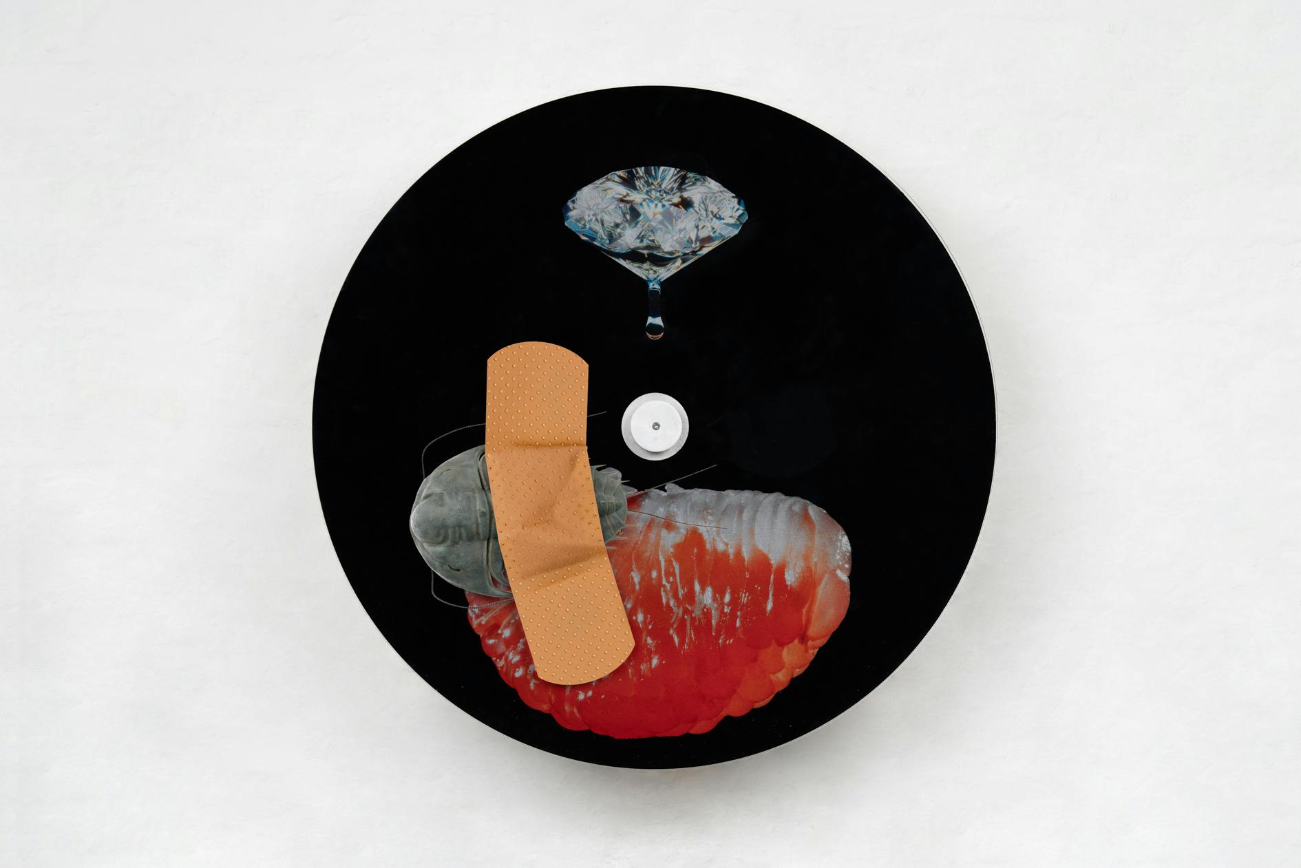 Braudel's Clock - Grapefruit Diamond, 2022, Chromalux print on aluminium, UV print on acrylglass, rotating aluminium and steel clock mechanism, 70 cm x 70 cm x 17 cm