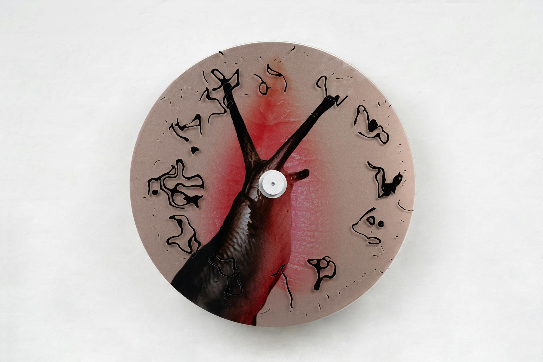 Braudel's Clock - Snail, 2022, Chromalux print on aluminium, UV print on acrylglass, rotating aluminium and steel clock mechanism, 70 cm x 70 cm x 17 cm