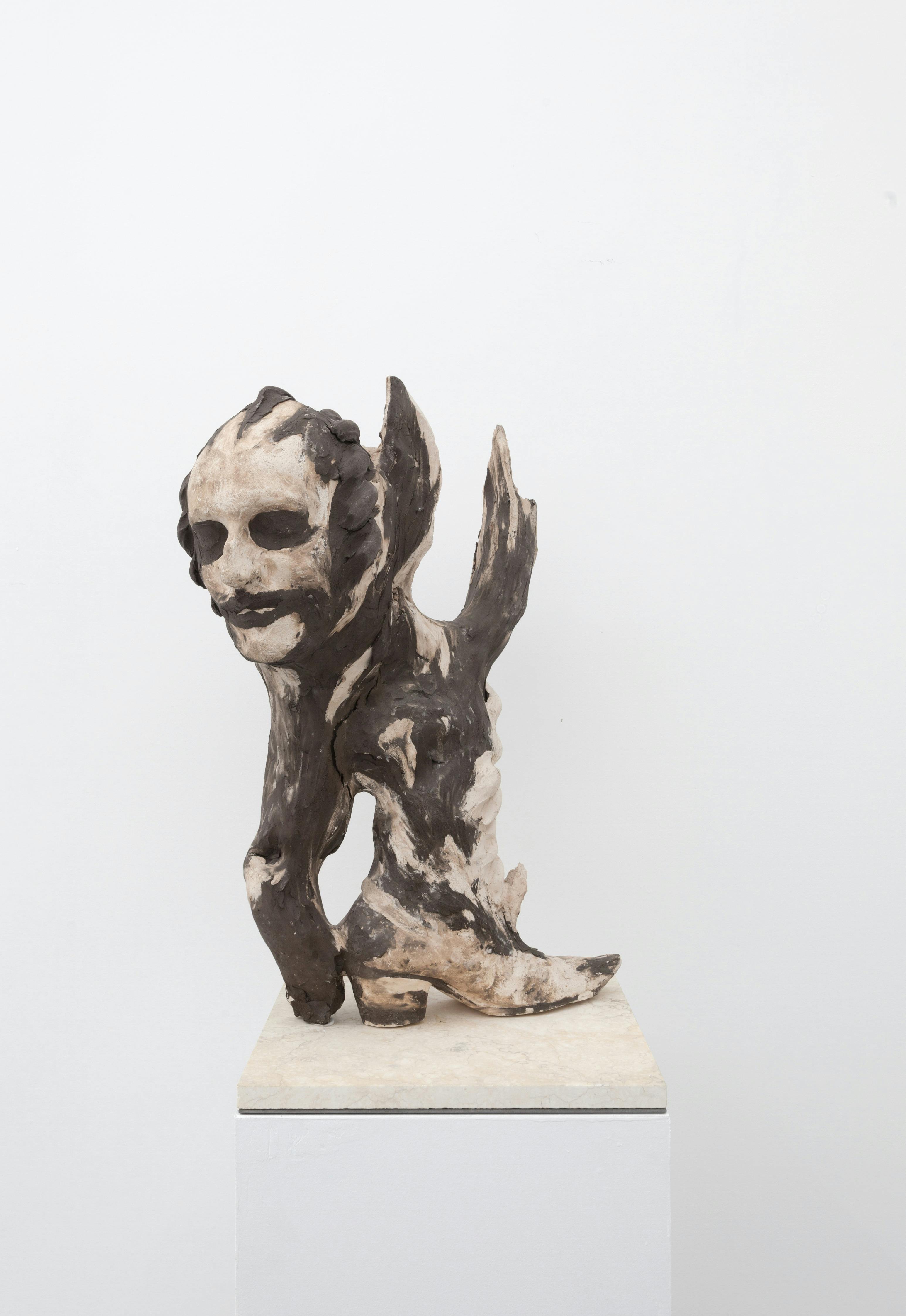 Grillogotico I, 2021, black and white unglazed ceramic, marble and iron, 103 x 40 x 40 cm