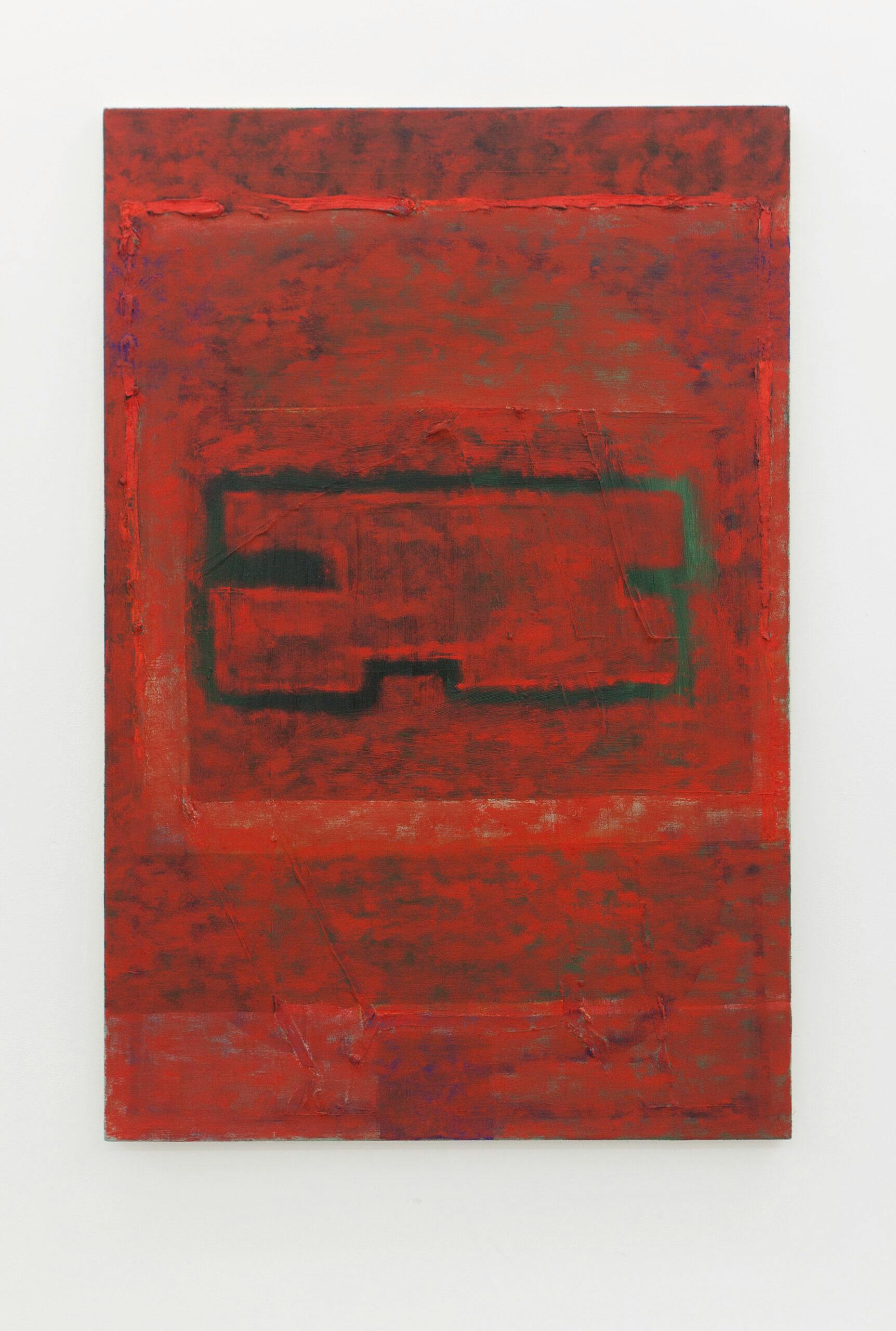 Untitled (red shape, red field, dark background), 2018, oil on canvas, 80 x 120 cm