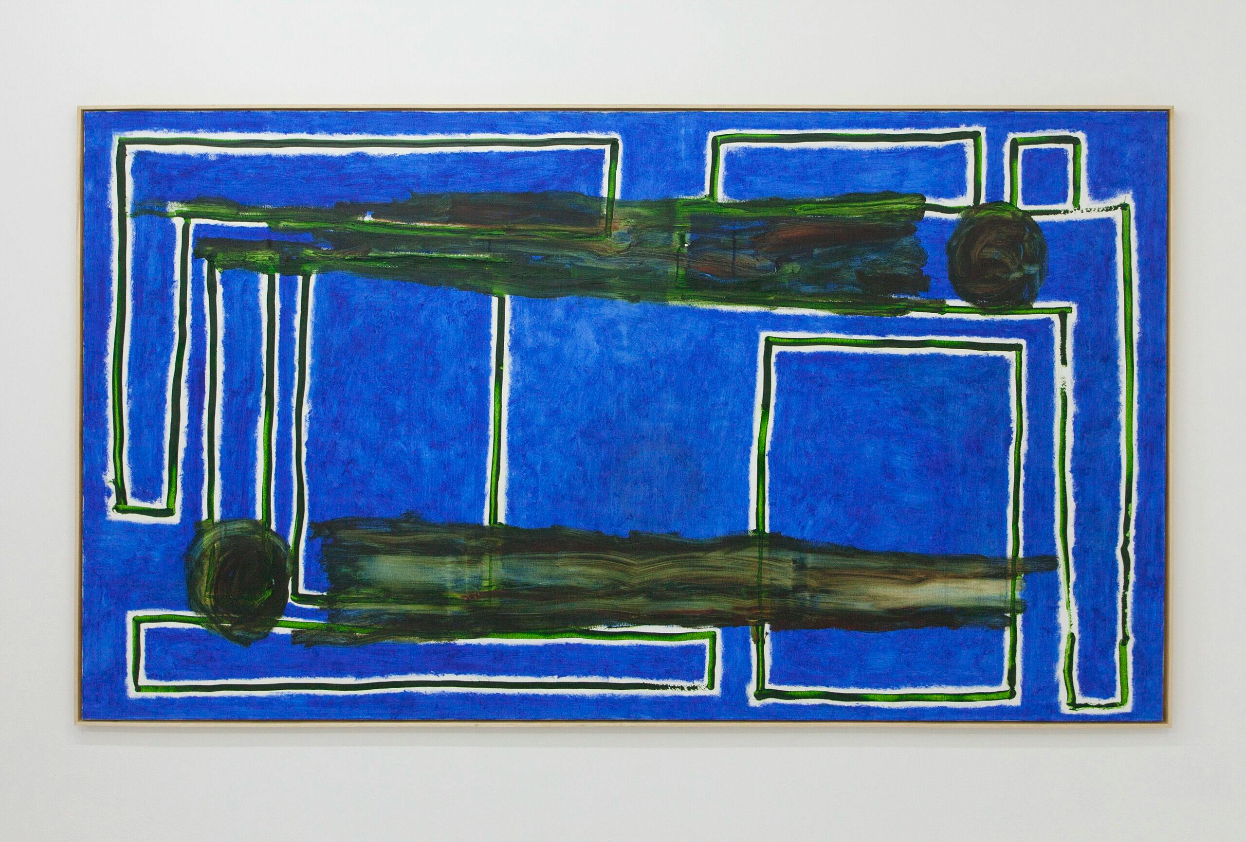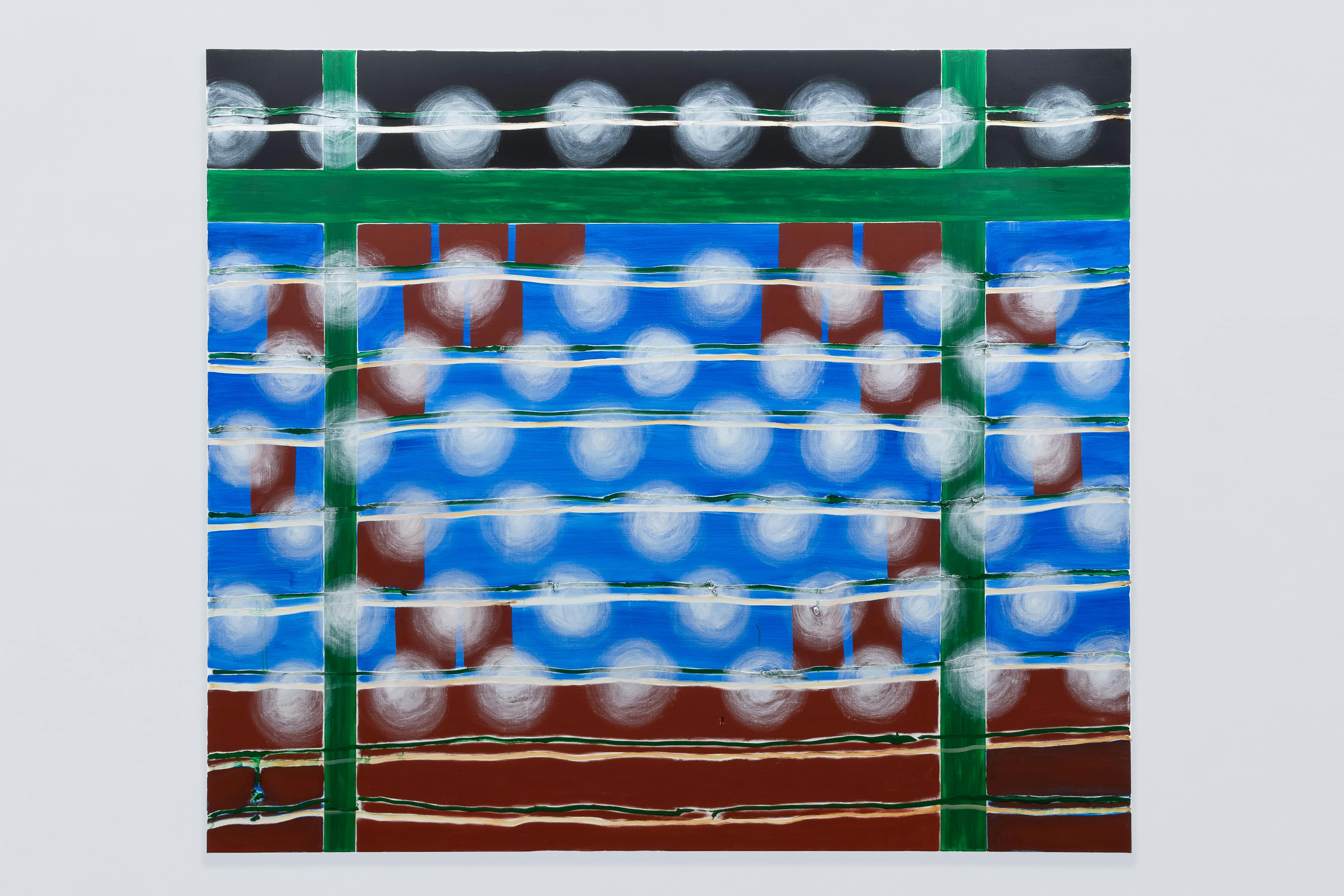 untitled (green dots, white lines, blue lines, grey), 2022-2024, oil on linen, 190 x 220 cm