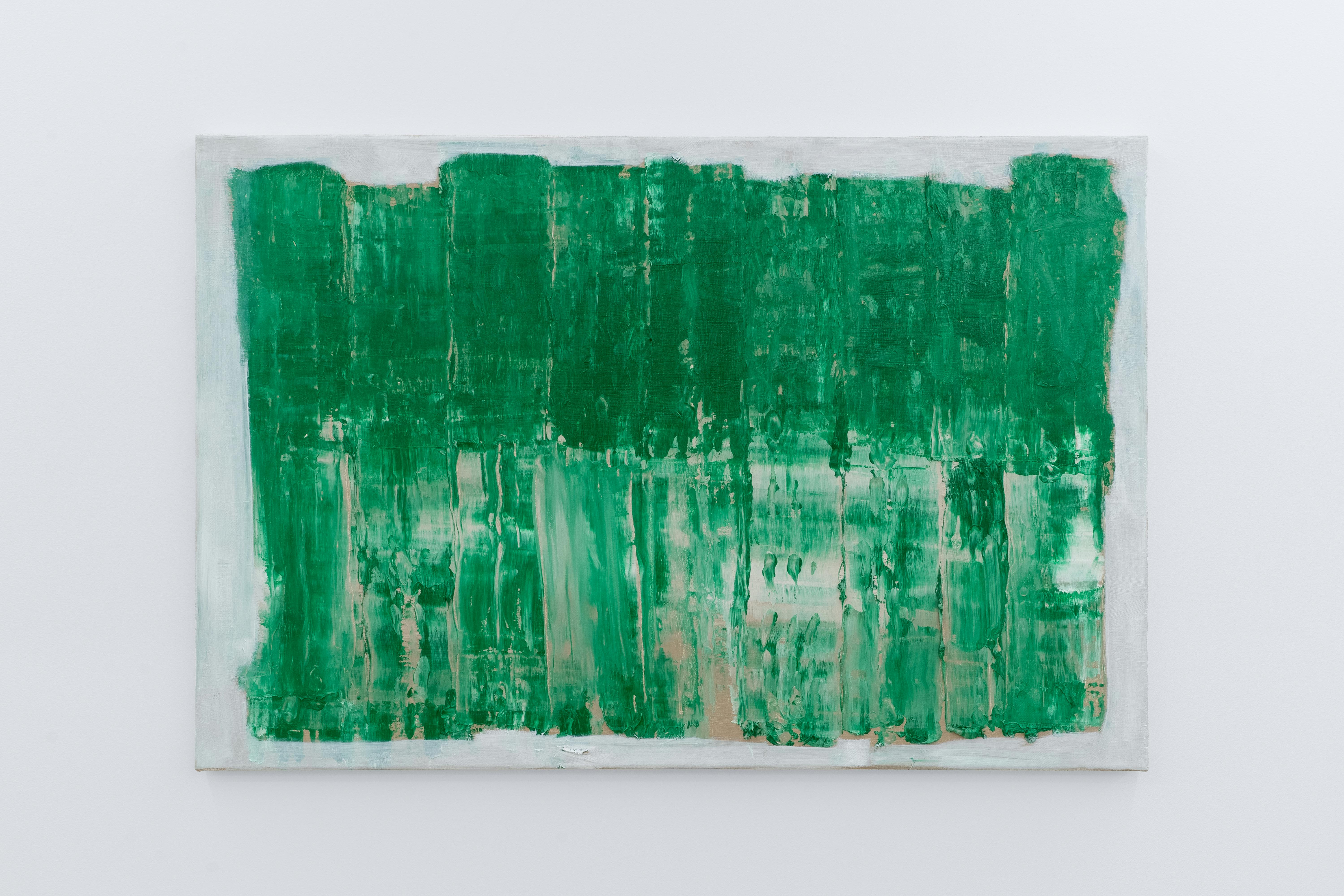 Untitled (green lines, yellow, white wash, property), 2018, oil on canvas, 150 x 100 cm