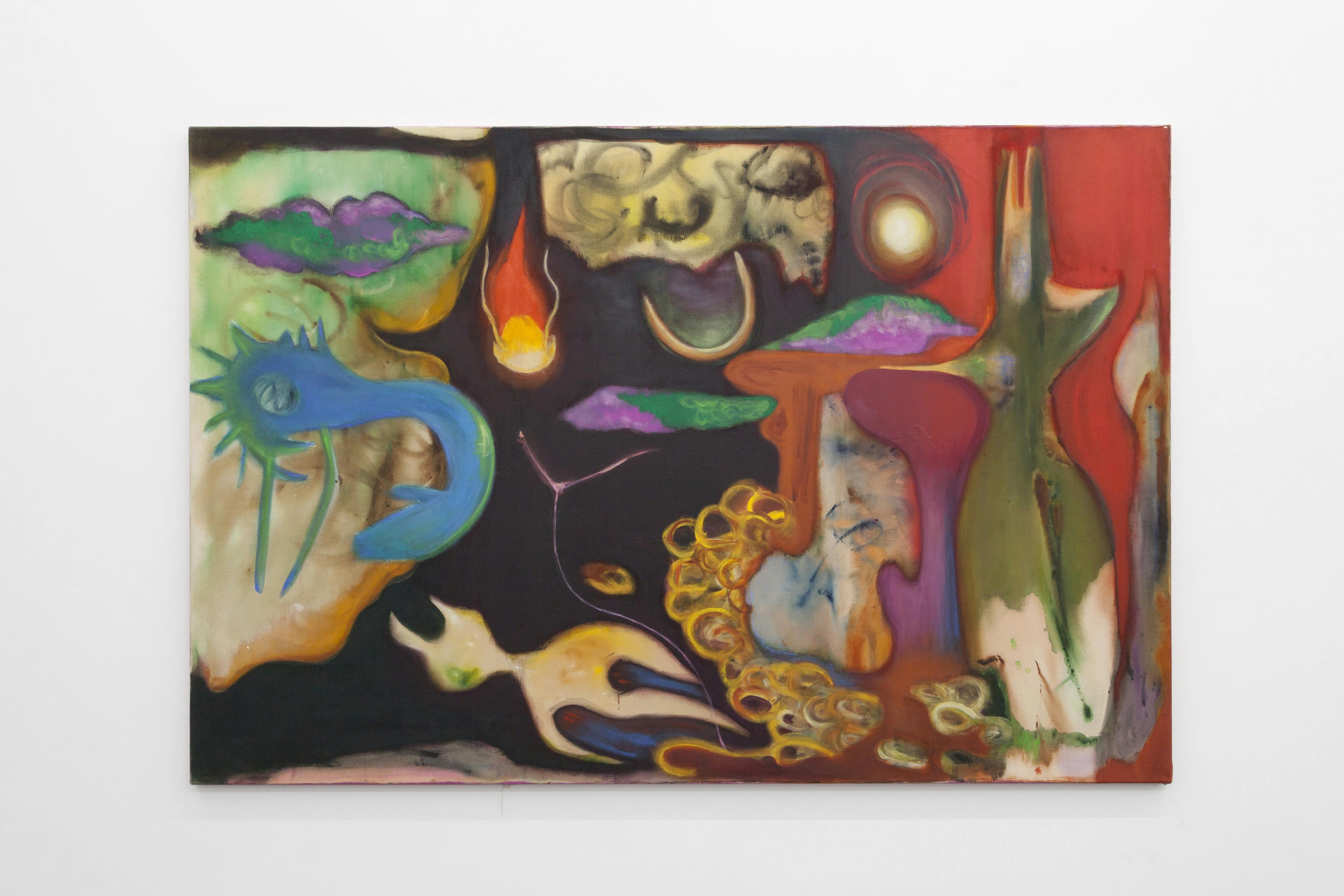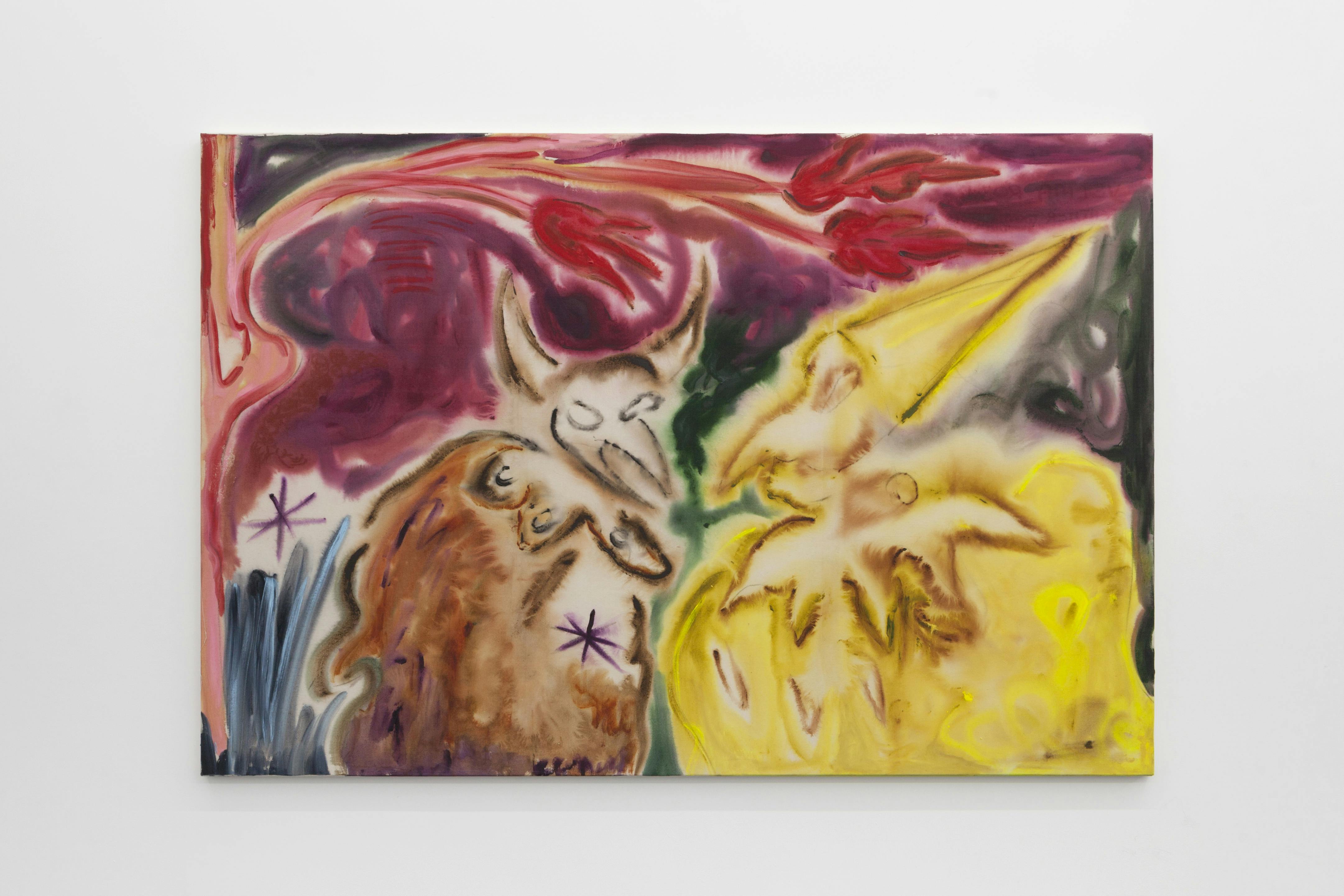 celestial bathhouses, 2024, acrylic and oil pastels on canvas, 128.7 x 142.7 cm