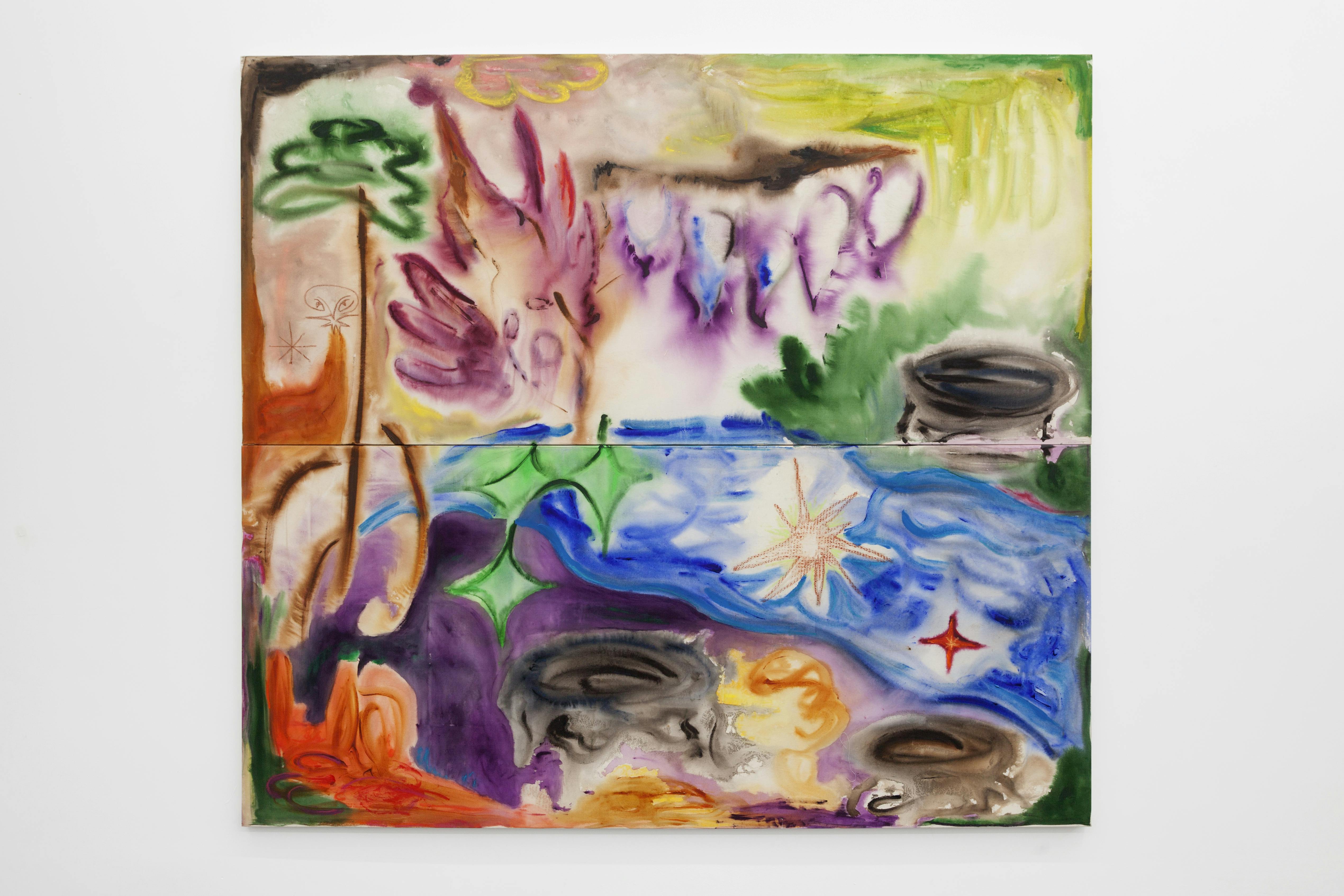 Spirit Divide, 2024, oil pastel & acrylic on canvas, 186 cm x 215 cm ( 98 cm x 215 cm per panel)