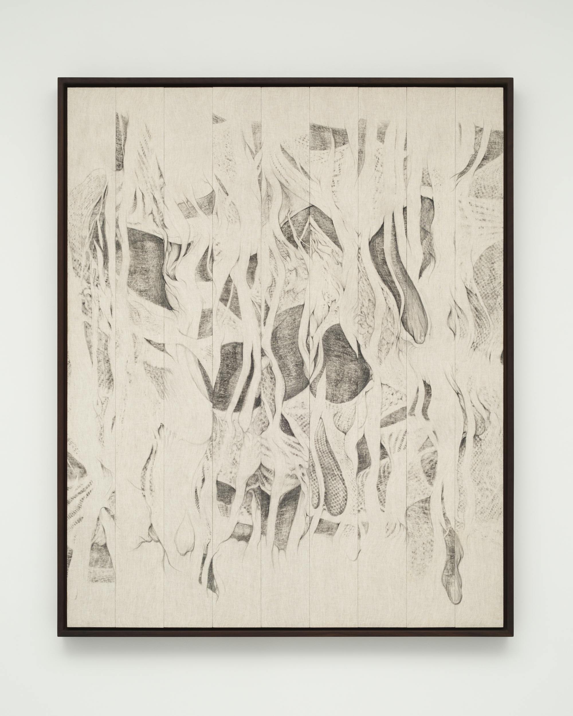 Story Tale, 2020-22, graphite and acrylic transferred on linen mounted on masonite panel, framed with walnut wood, 124 x 101 x 6cm