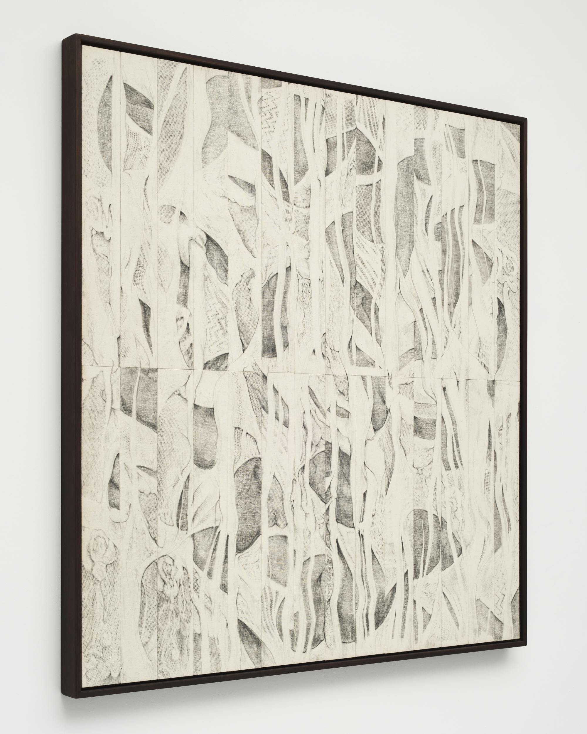 Tales From The Heart, 2020-22, graphite and acrylic transferred on cotton canvas mounted on masonite panel, framed with walnut wood, 124 x 117 x 6 cm