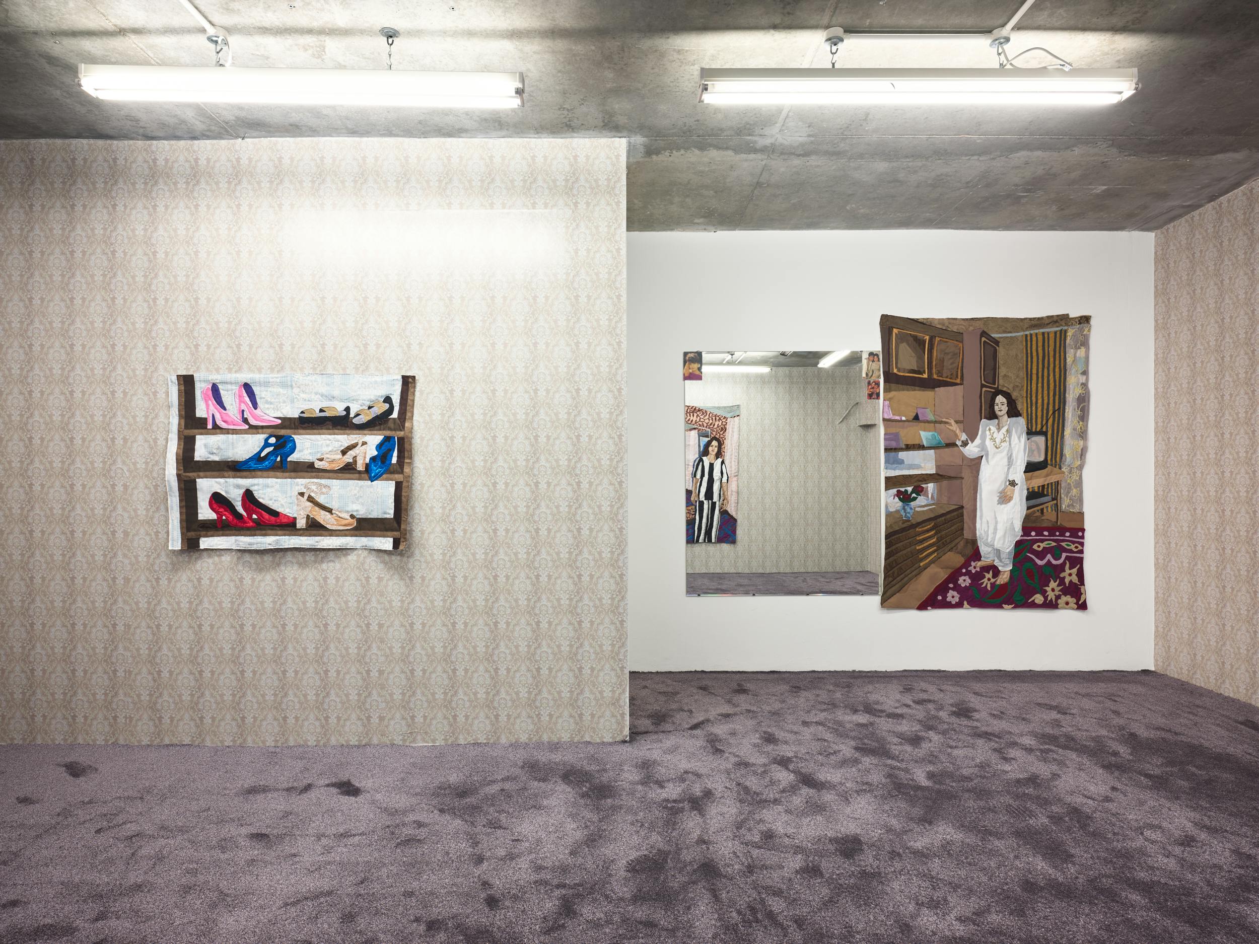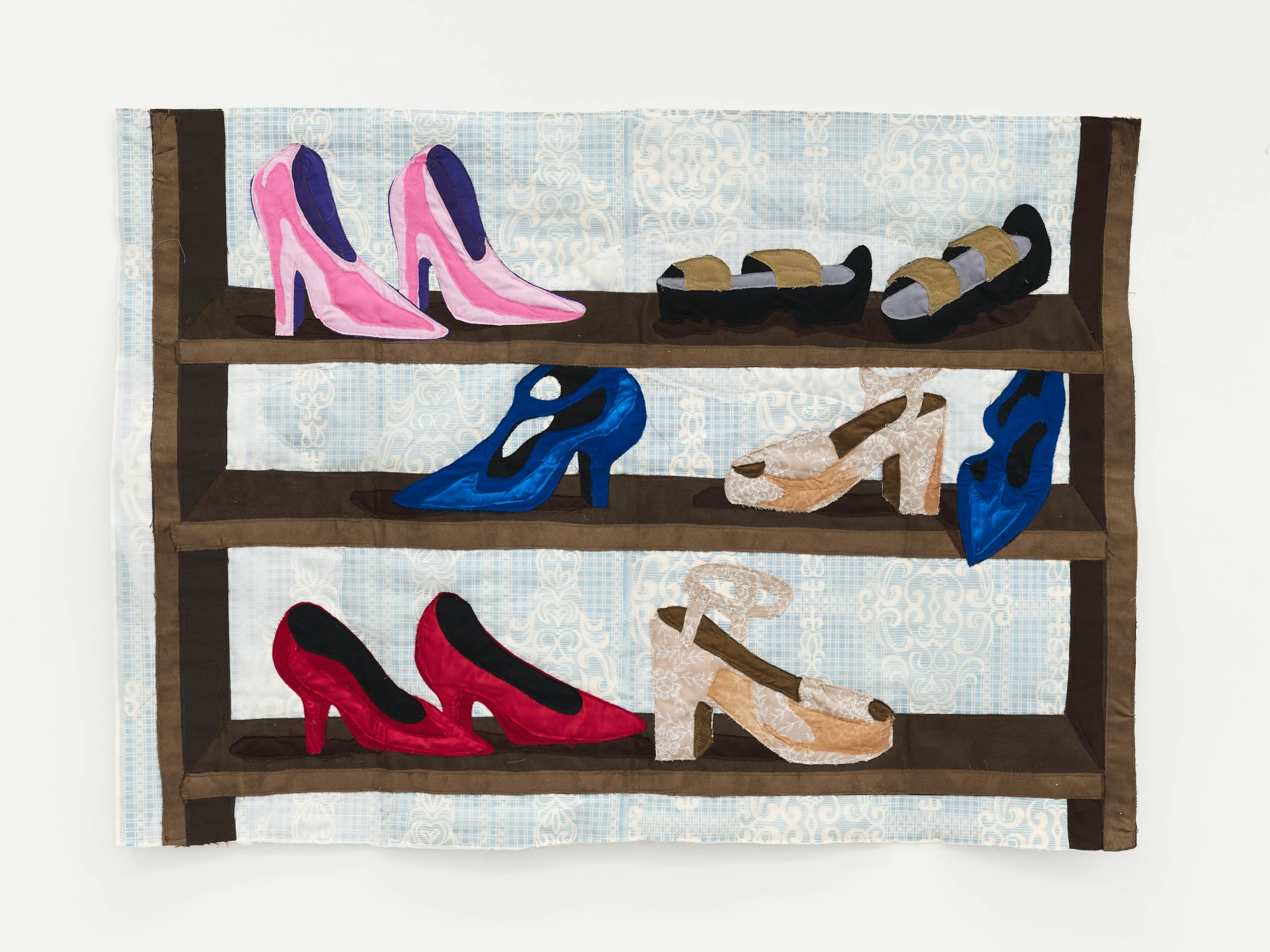 Hangama Amiri, Shoe-rack, 2022, Muslin, cotton, polyester, velvet, chiffon, wallpaper, sued, and found fabrics, 78.74 × 109.22 cm