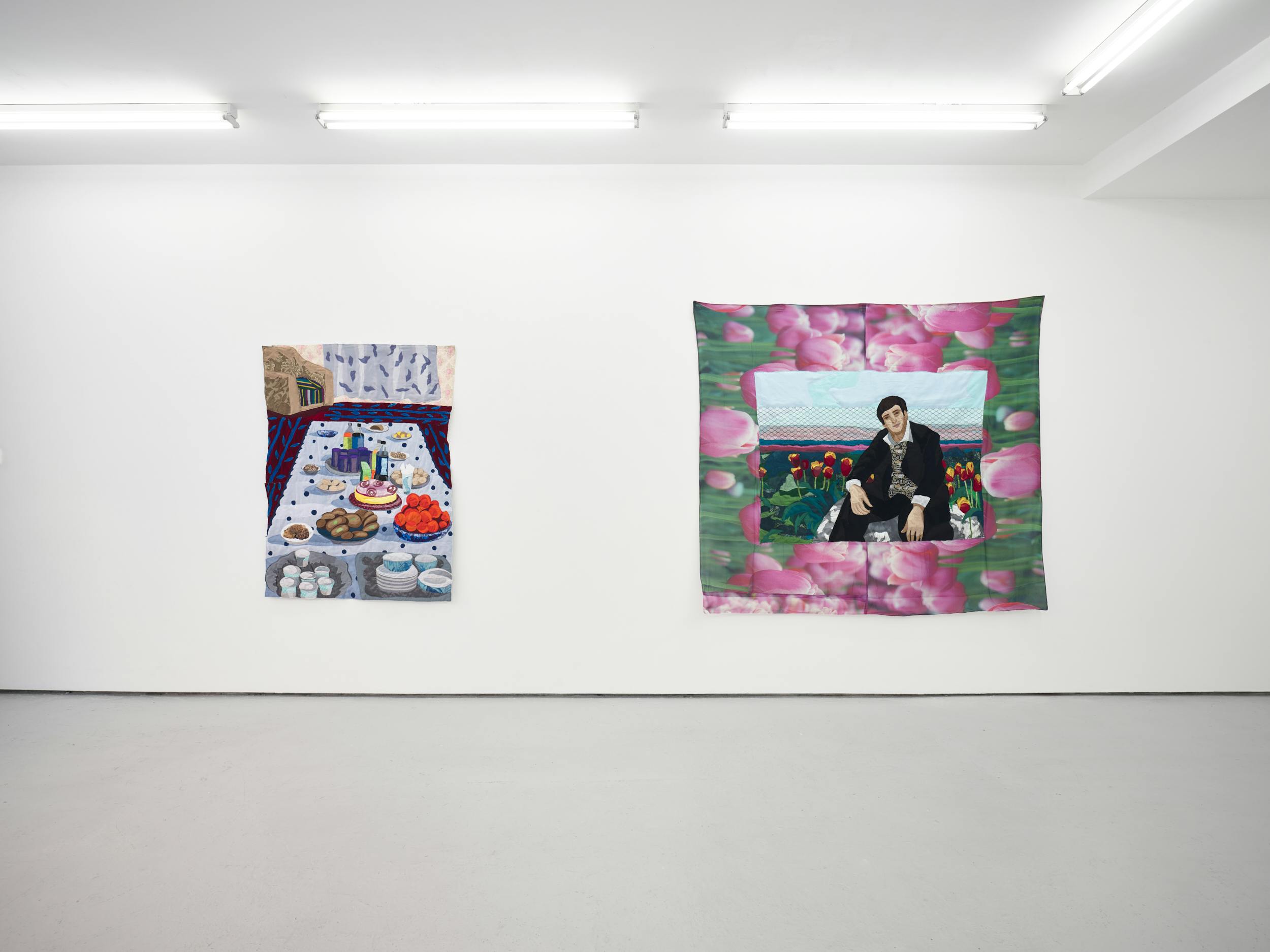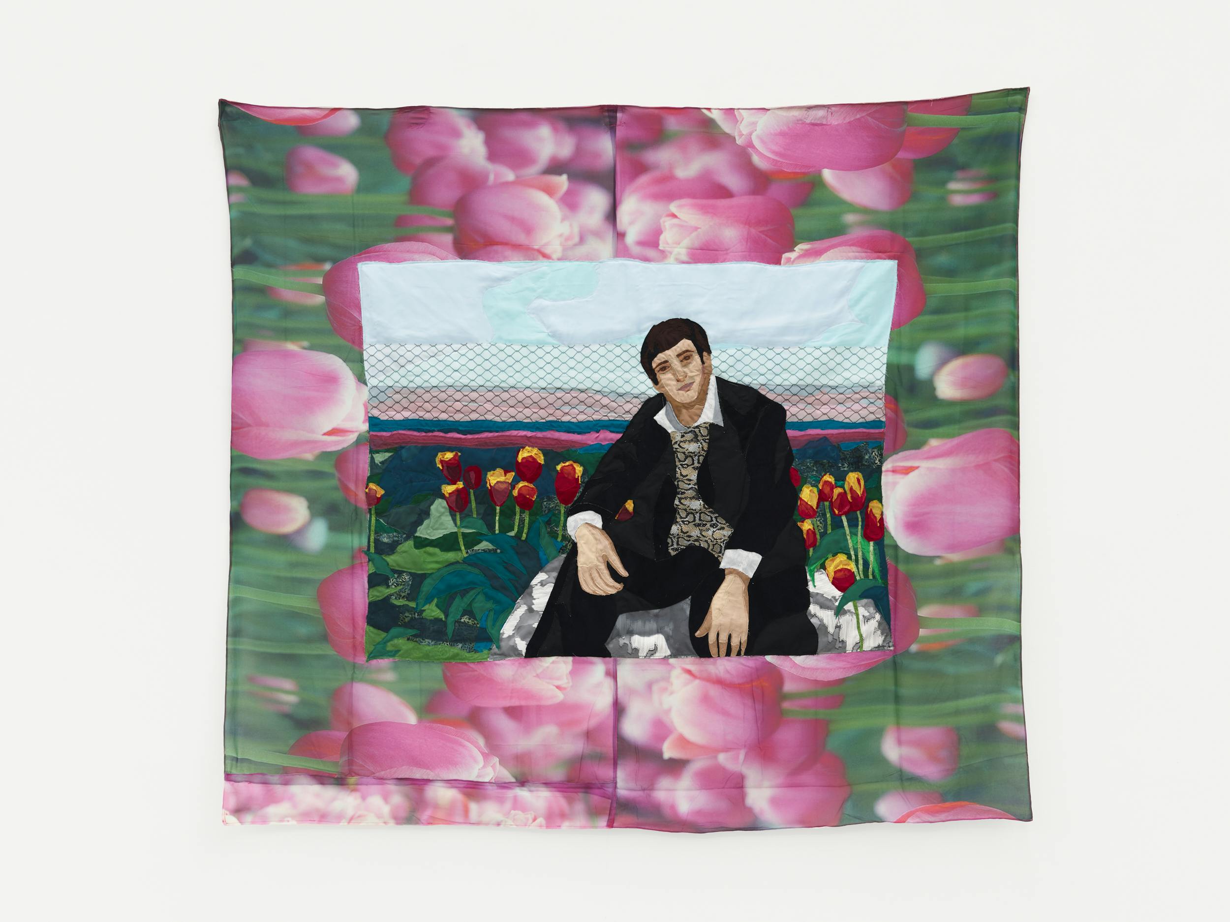 Hangama Amiri, Man with Tulips, 2022, Muslin, cotton, polyester, dyed fabric, velvet, chiffon, inkjet print on silk-chiffon, silk, and found fabrics, 175.26 × 196.85 cm