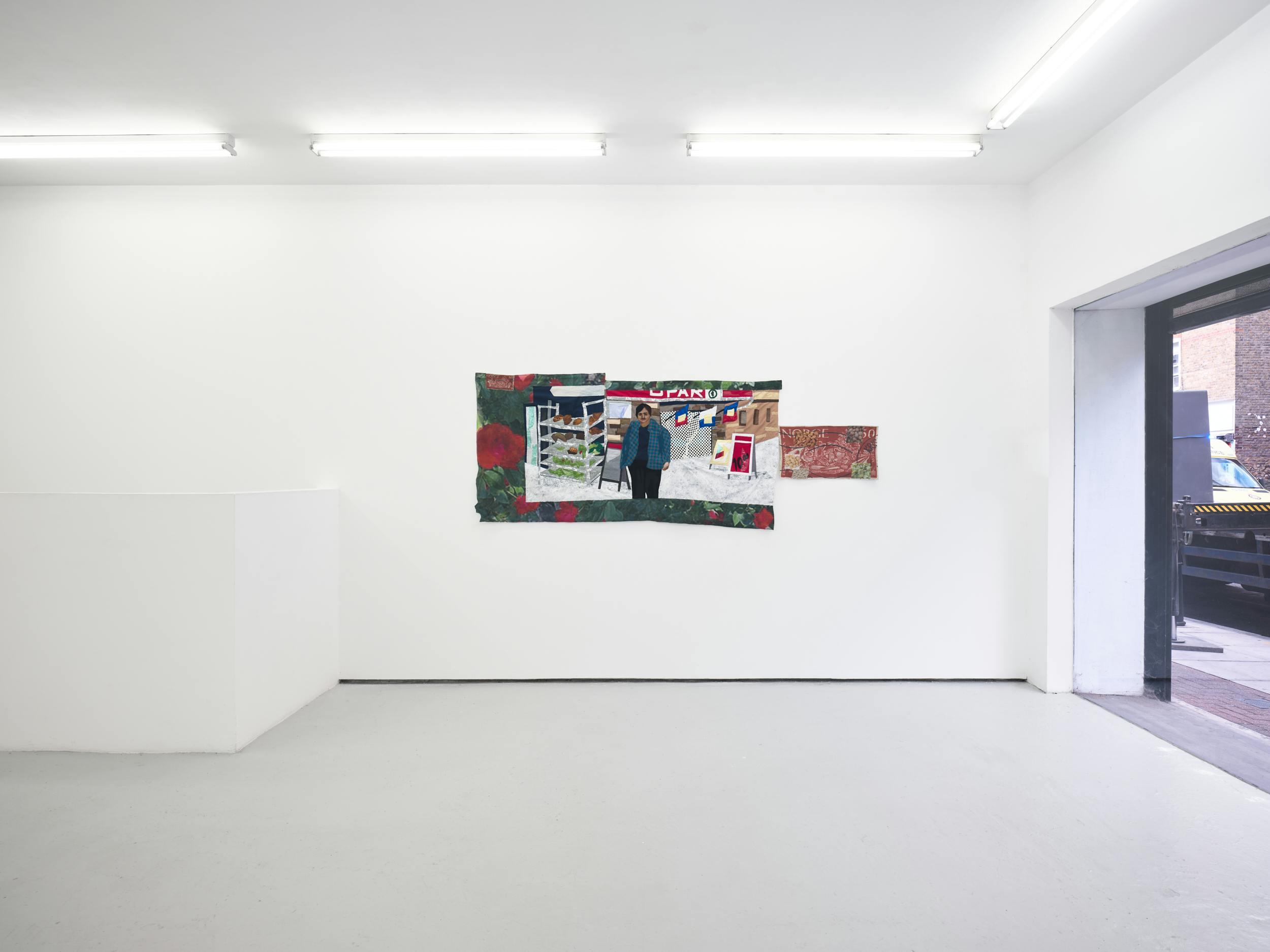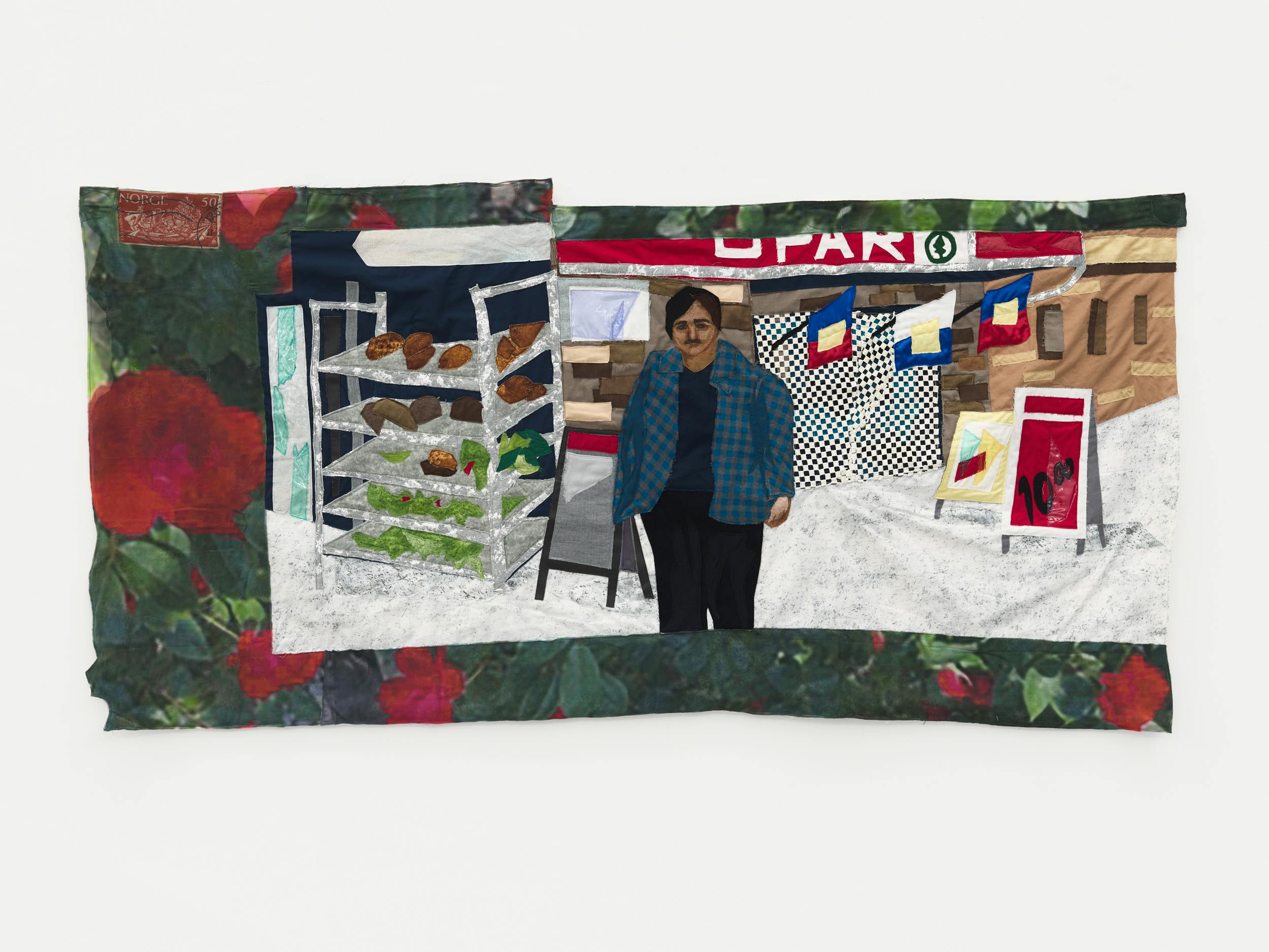 Hangama Amiri, Portrait of a Man at the Grocery Store, 2022, Muslin, cotton, polyester, dyed fabric, velvet, chiffon, mesh-fabric, inkjet print on silk-chiffon, clear vinyl, leather, sued, and found fabrics, 91.44 × 182.88 cm
