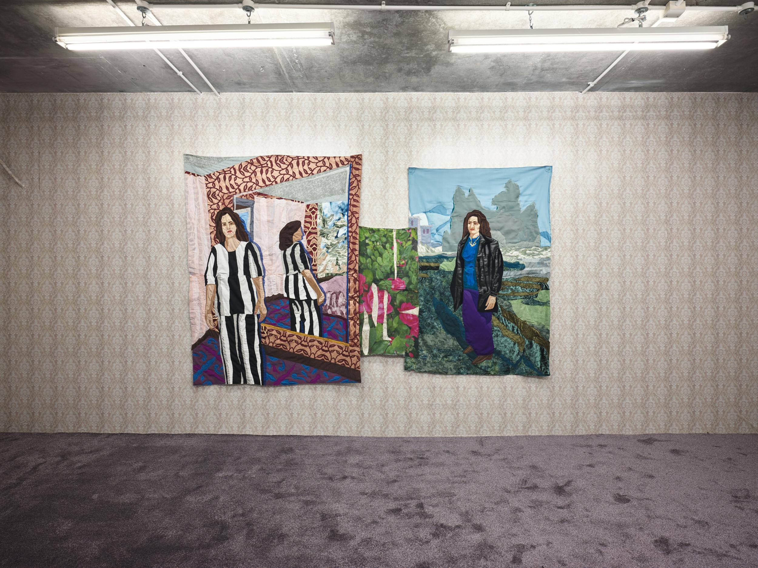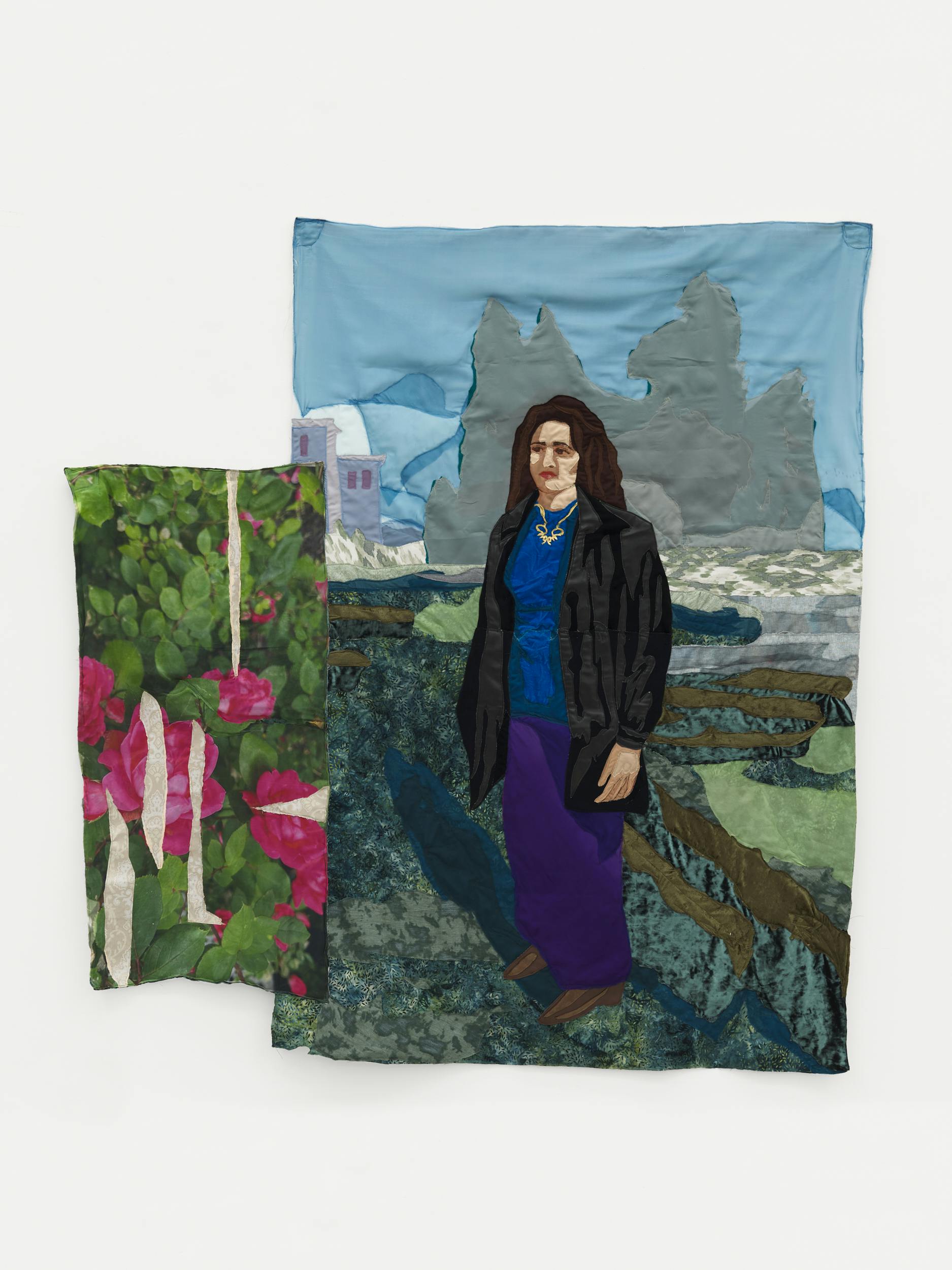 Hangama Amiri, Woman in a Park, 2022, Muslin, cotton, polyester, dyed fabric, velvet, chiffon, inkjet print on silk-chiffon, silk, wallpaper, leather, embroidery patter, and found fabrics, 166.37 × 152.40 cm