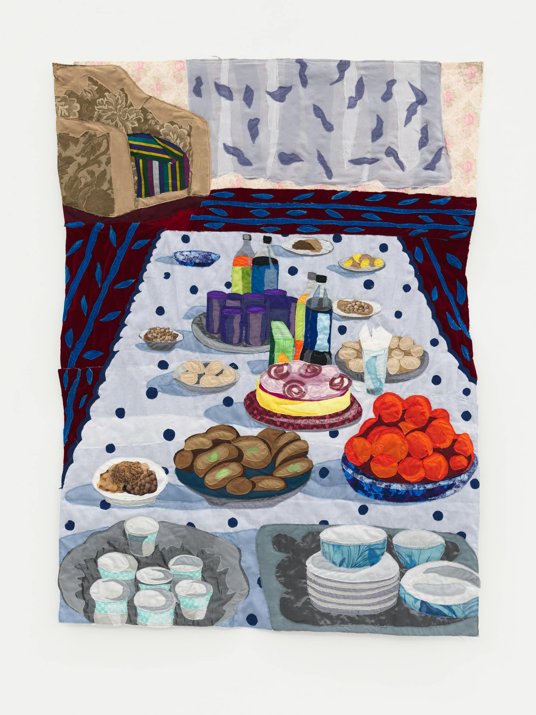 Hangama Amiri, Eid, 2022, Muslin, cotton, polyester, dyed fabric, velvet, chiffon, wallpaper, nylon tulle, ikat-print, inkjet print on silk-chiffon, sued, paper, silk, and found fabrics, 142.24 × 106.68 cm