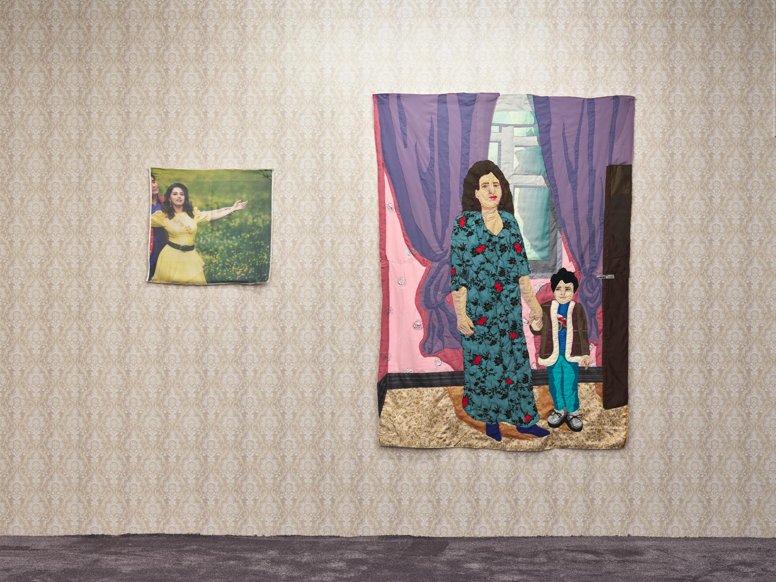 Hangama Amiri, Portrait of a Woman with her Son, 2022, Muslin, cotton, polyester, dyed fabric, velvet, chiffon, sued, embroidery pattern, silk, and found fabrics, 172.72 × 121.92 cm
