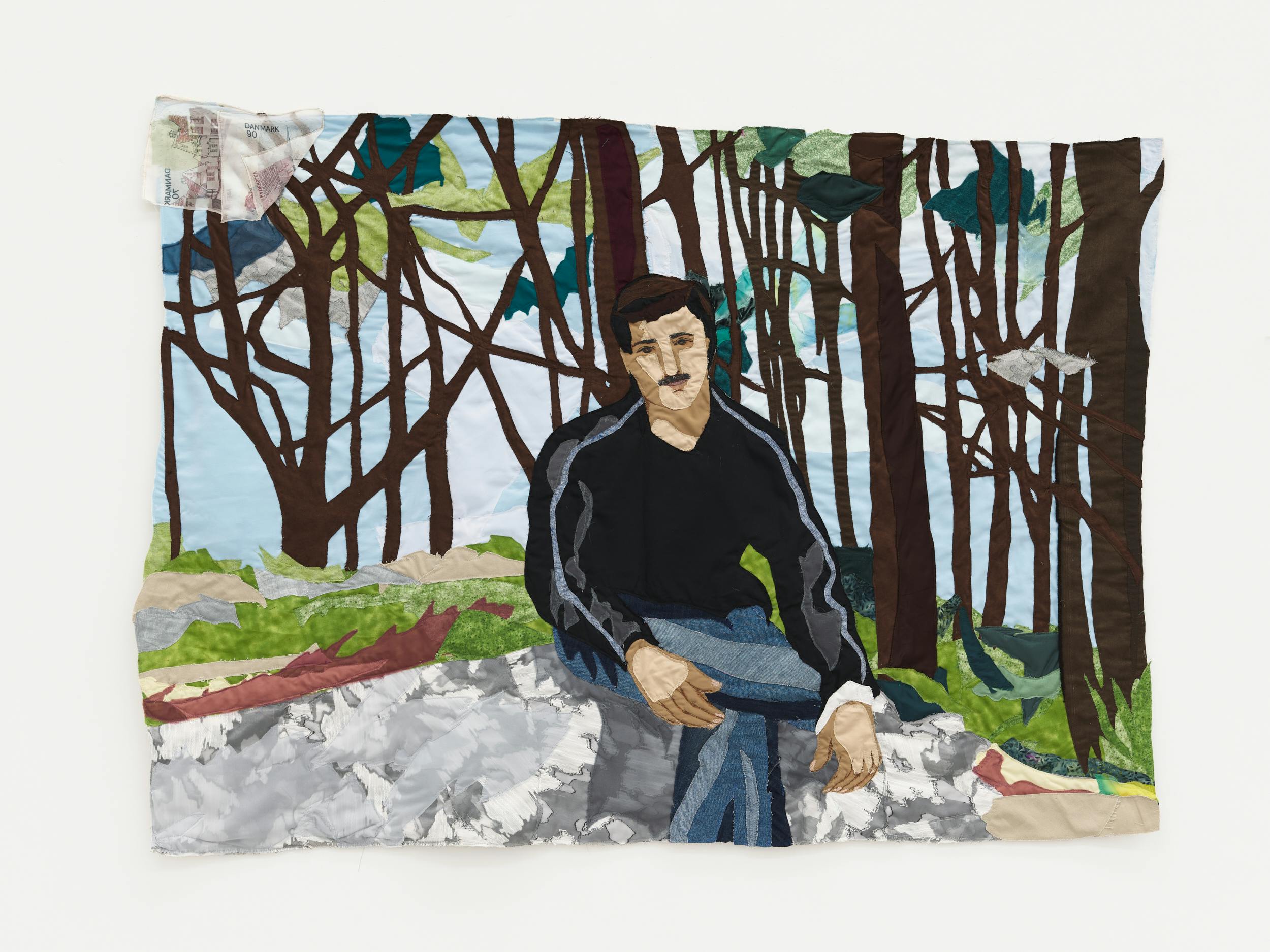 Hangama Amiri, Man Resting in the Park, 2022, Muslin, cotton, polyester, chiffon, denim, sued, silk, inkjet print on silk-chiffon, and found fabrics / mussolina, 106.68 × 152.40 cm