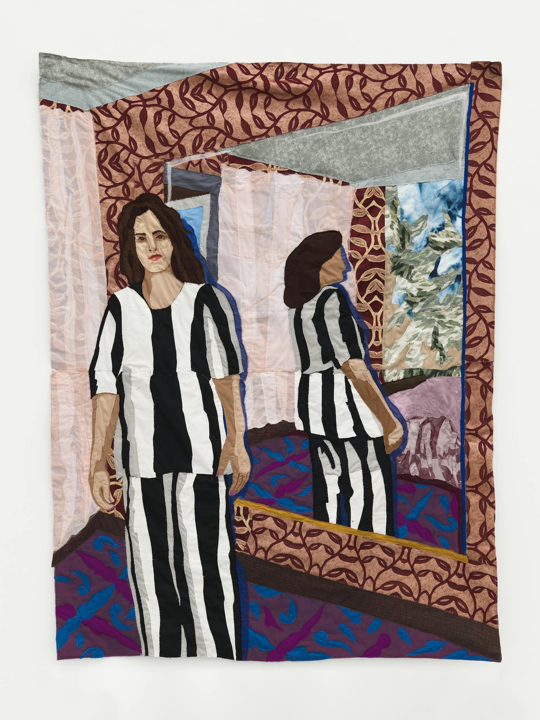 Hangama Amiri, Woman Before A Mirror, 2022, Muslin, cotton, polyester, dyed fabric, velvet, chiffon, silk, sued, and found fabrics, 185.42 × 135.89 cm