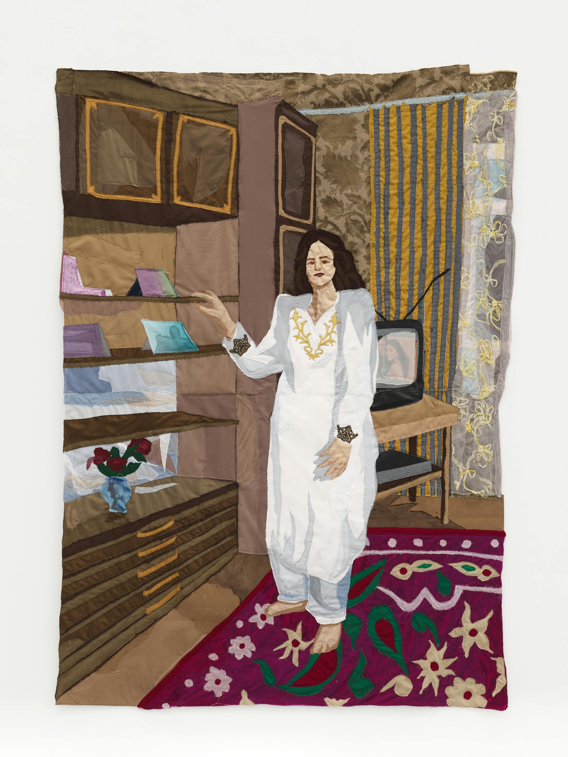 Hangama Amiri, Portrait of a Woman in White Salwar Kameez, 2022, Muslin, cotton, polyester, dyed fabric, velvet, chiffon, sued, leather, mesh-fabric, embroidery pattern, inkjet print on silk-chiffon, silk, and found fabrics, 182.88 × 132.08 cm