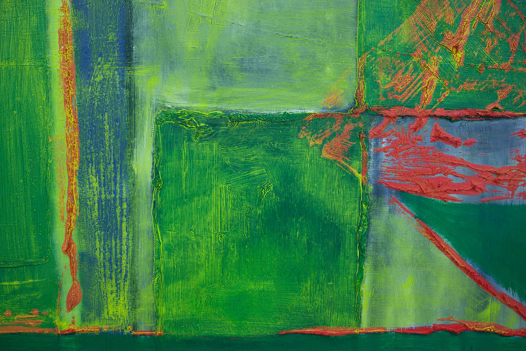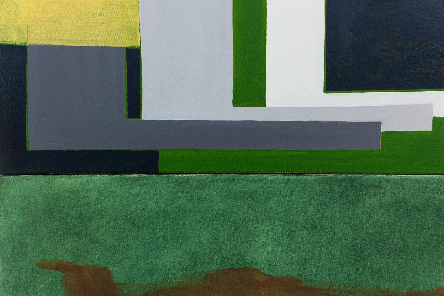 untitled (Top: Transparent Yellow Over Red Imprint, Grey, Green; Bottom: Vertical Green Lines, Red) (detail), 2017-2019, oil on canvas, 92 cm x 122 cm