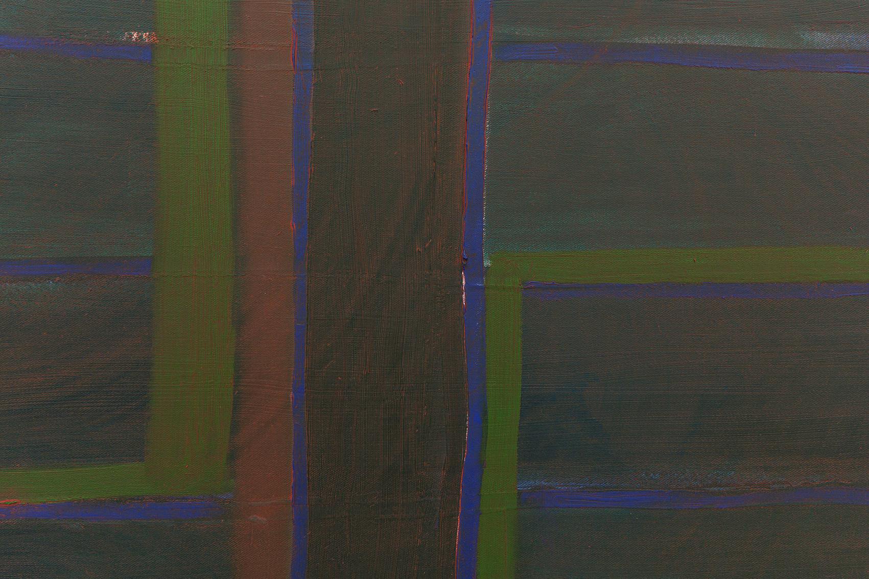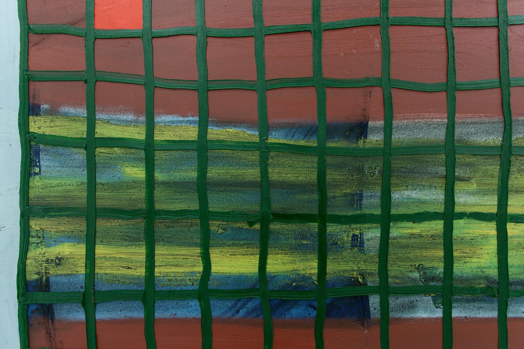 Untitled (Dark Green Lines, Graticule, Four Red Squares, Grey) (detail), 2016-2018, oil on canvas, 195 x 135 cm