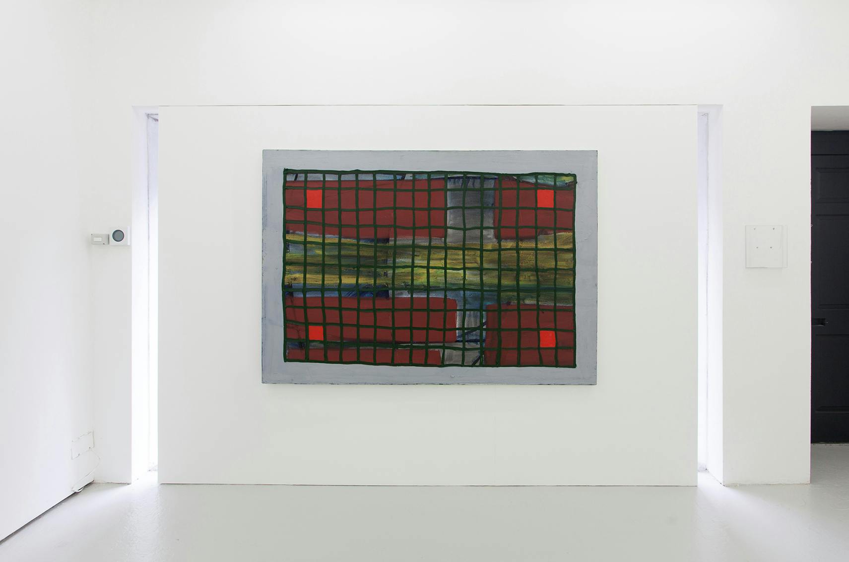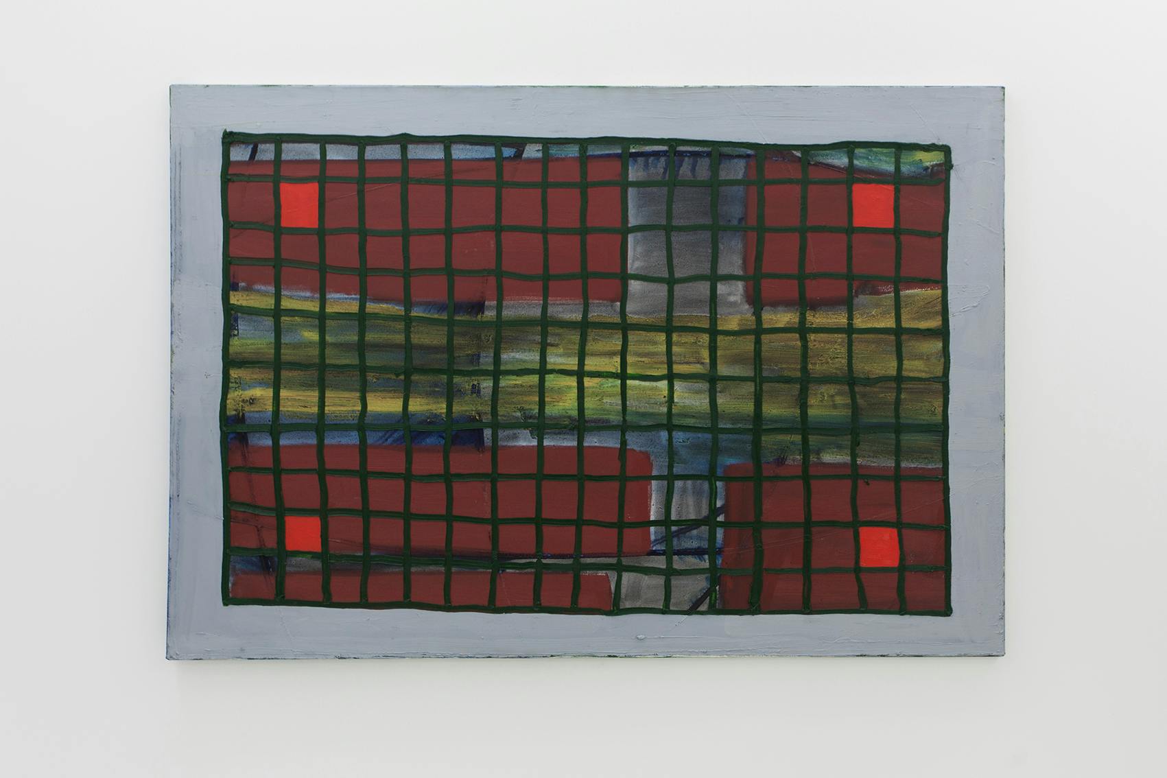Untitled (Dark Green Lines, Graticule, Four Red Squares, Grey), 2016-2018, oil on canvas, 195 x 135 cm