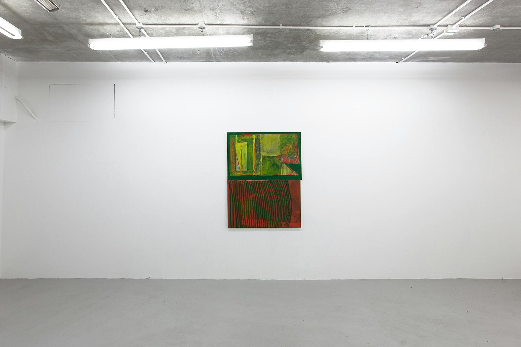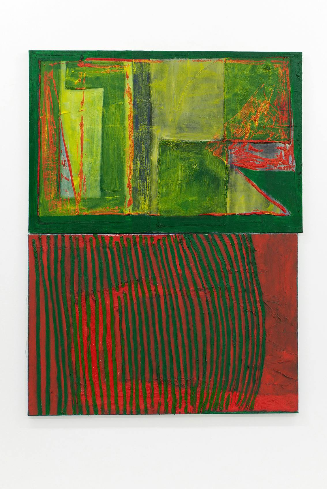 untitled (Top: Transparent Yellow Over Red Imprint, Grey, Green; Bottom: Vertical Green Lines, Red), 2017-2019, oil on canvas, 92 cm x 122 cm