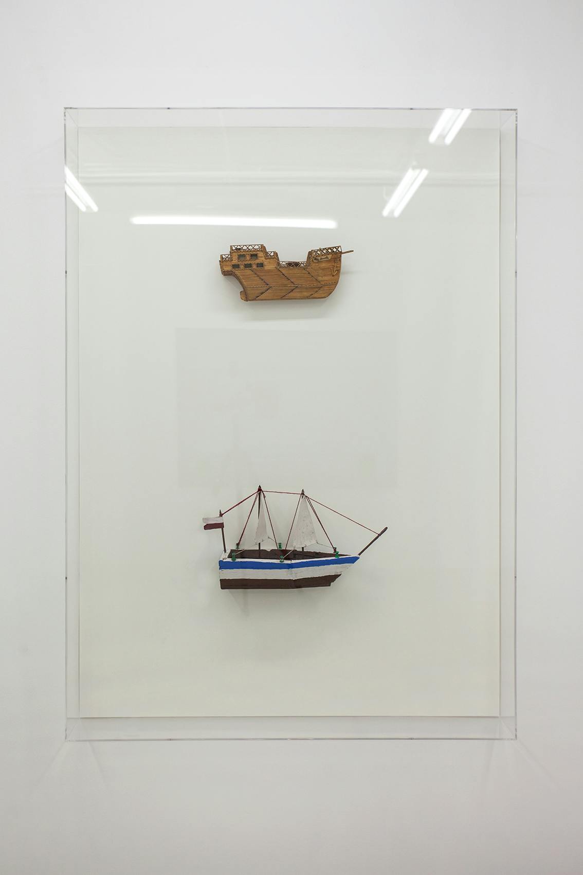 Untitled (Two Boats), 2019, objet trouvé, perspex, paper, wood, 129 x 90 x 16.5 cm