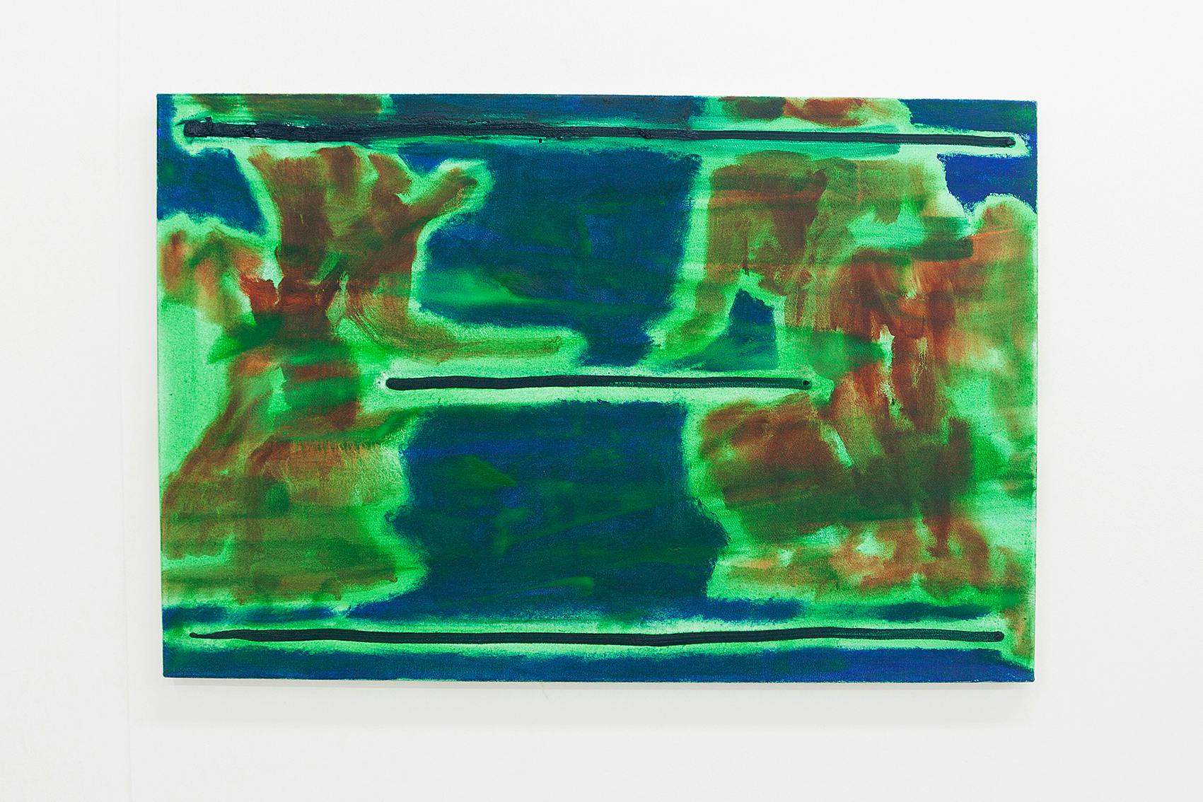 Untitled (Three Horizontal Lines, Two Red Figures, Green), 2019, oil on canvas