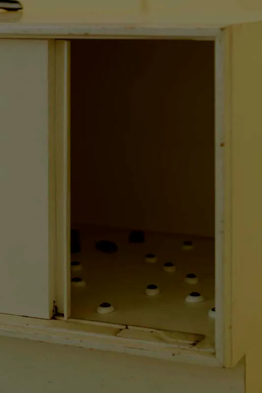 Mark Soo, You Can See The Weakness of a Man Right Through His Iris (Koons on Ice) (Detail), 2015, digital video with variable installation, cabinet, glass eyes, bendy straws, water, glass container, security cameras, wine gums, Sound, duration 4:10