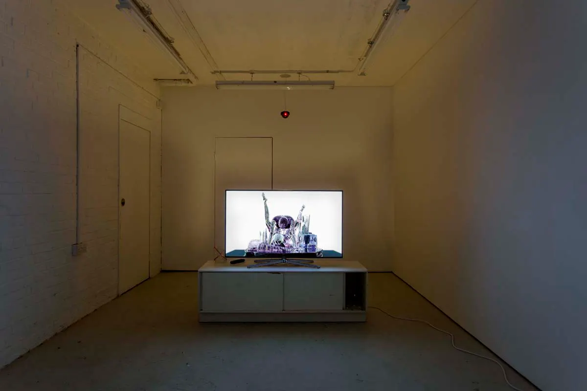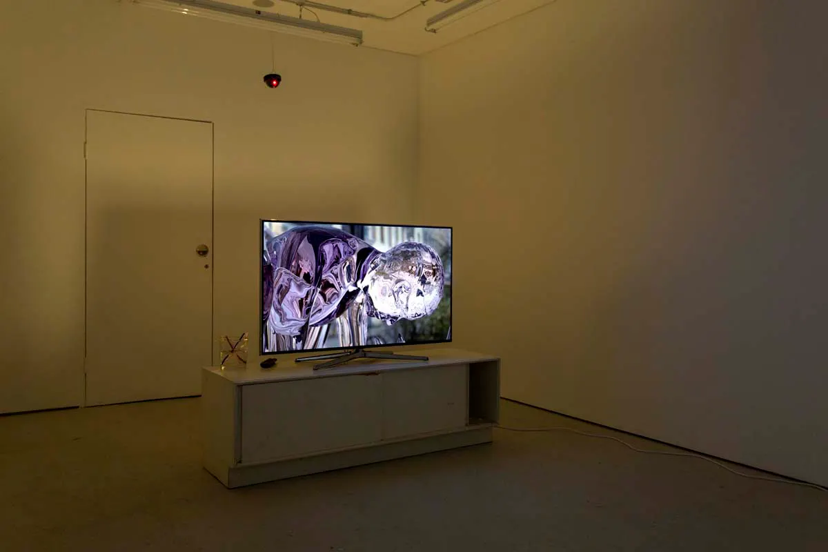 Mark Soo, Installation view: You Can See The Weakness of a Man Right Through His Iris (Koons on Ice), 2015, digital video with variable installation, cabinet, glass eyes, bendy straws, water, glass container, security cameras, wine gums, Sound, duration 4:10