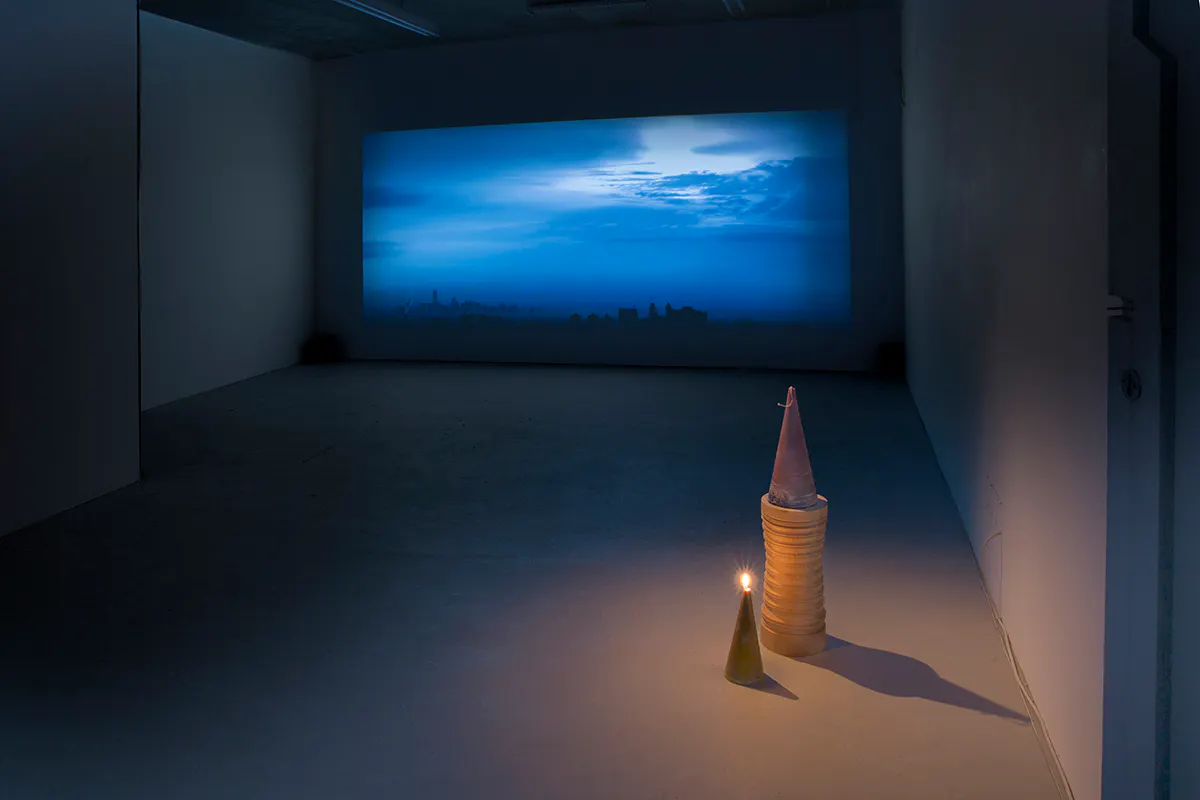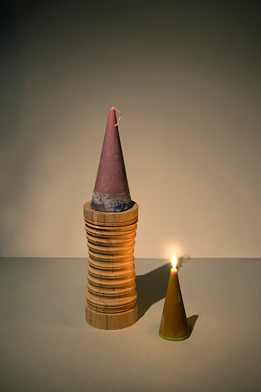 Jan Kiefer, Base Biz Fed Ecb, 2014, copper, beech wood, forged iron, 50 x 20 cm, Candle by Matthias Huber, Violet Volcano, 2014, wax, pigments, cord, 35 x 15 cm