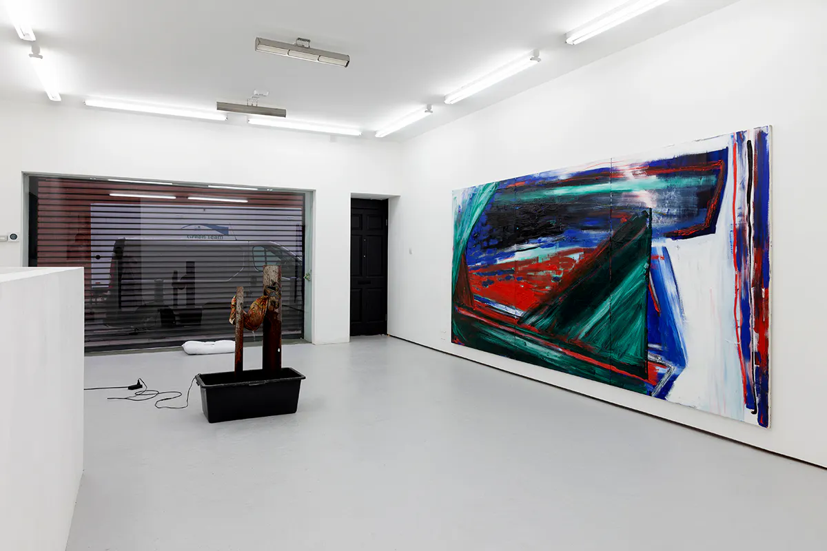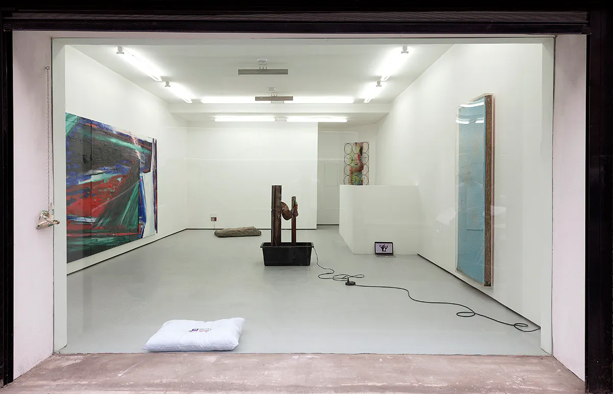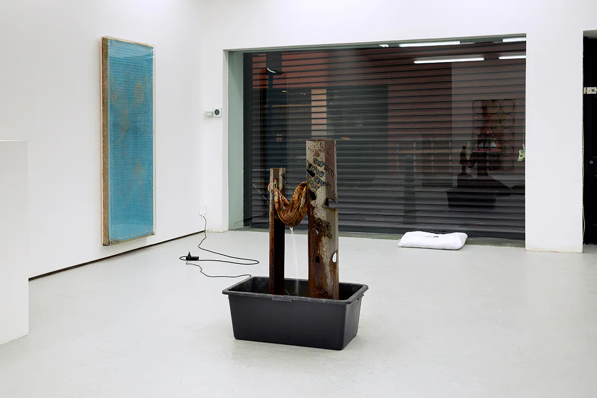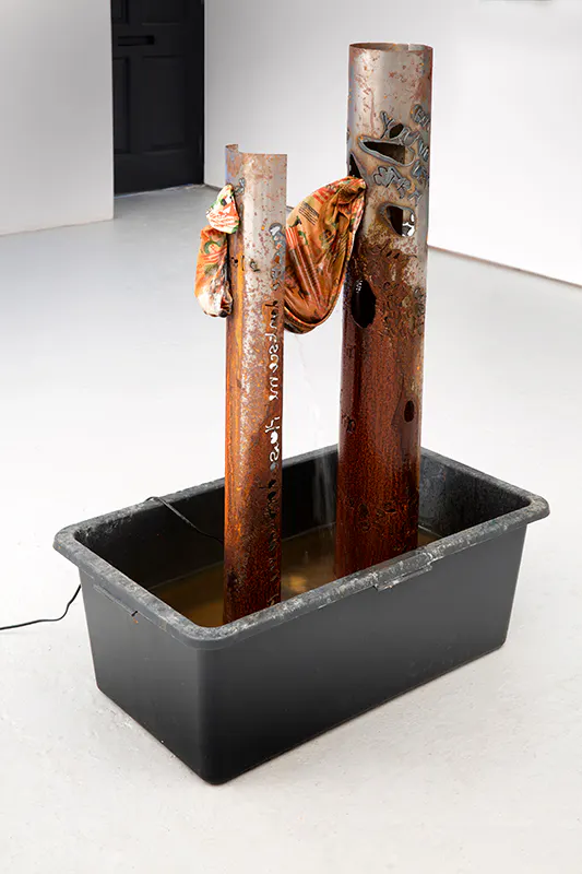 Olga Balema, Untitled, 2014, plastic box, steel, hoses, water, pump, textile, 40 x 80 x 40 cm