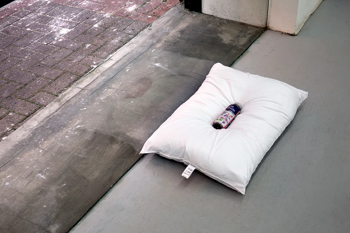 Adriano Costa, Little Miracles, 2014, cement & plastic bottle on pillow, 64 x 43 cm