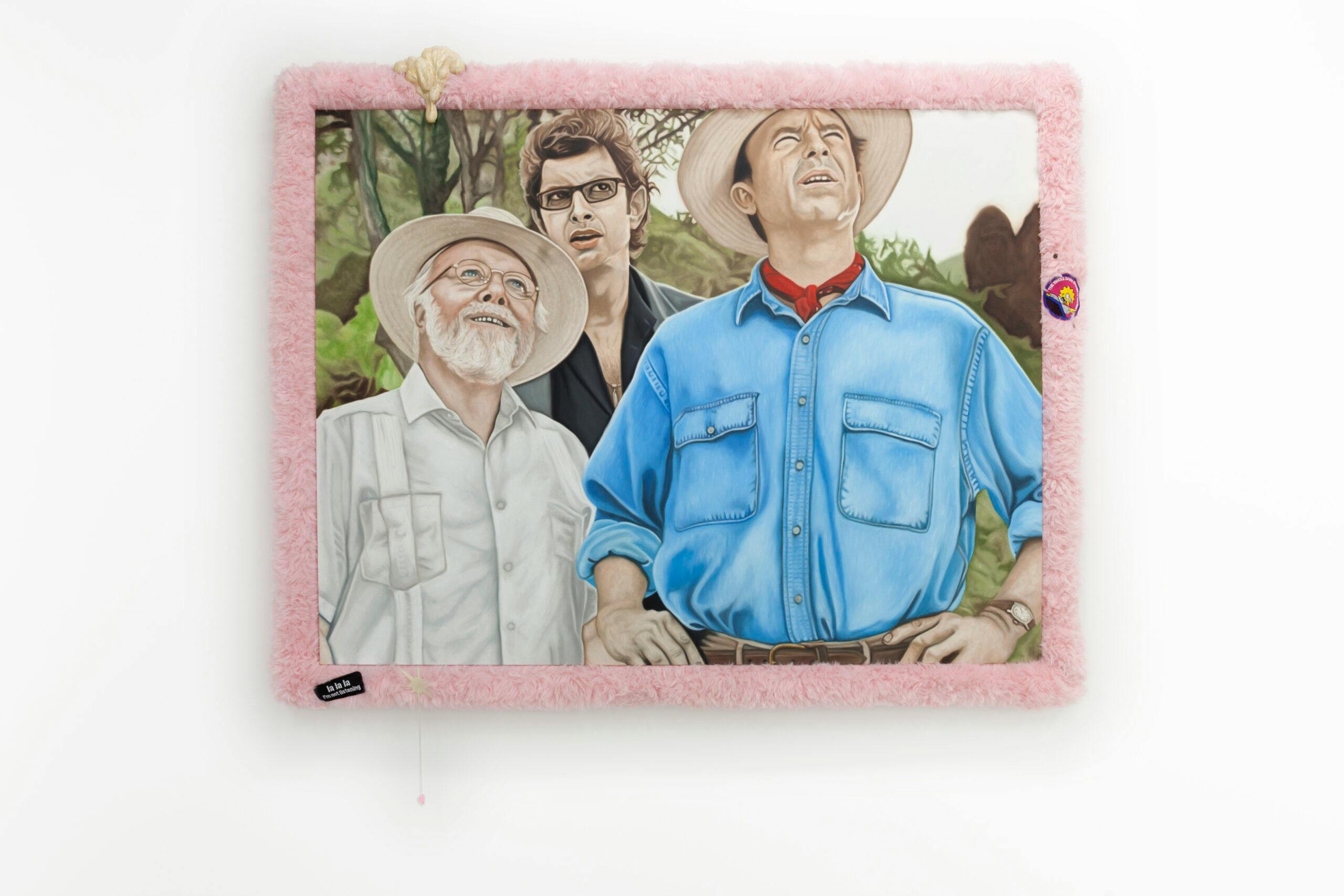 Yoan Mudry, Jurassic Park, 2023, acrylic and oil on canvas, wood, faux fur, fabric patch, plastic, latex, necklace, 97 x 129 cm
